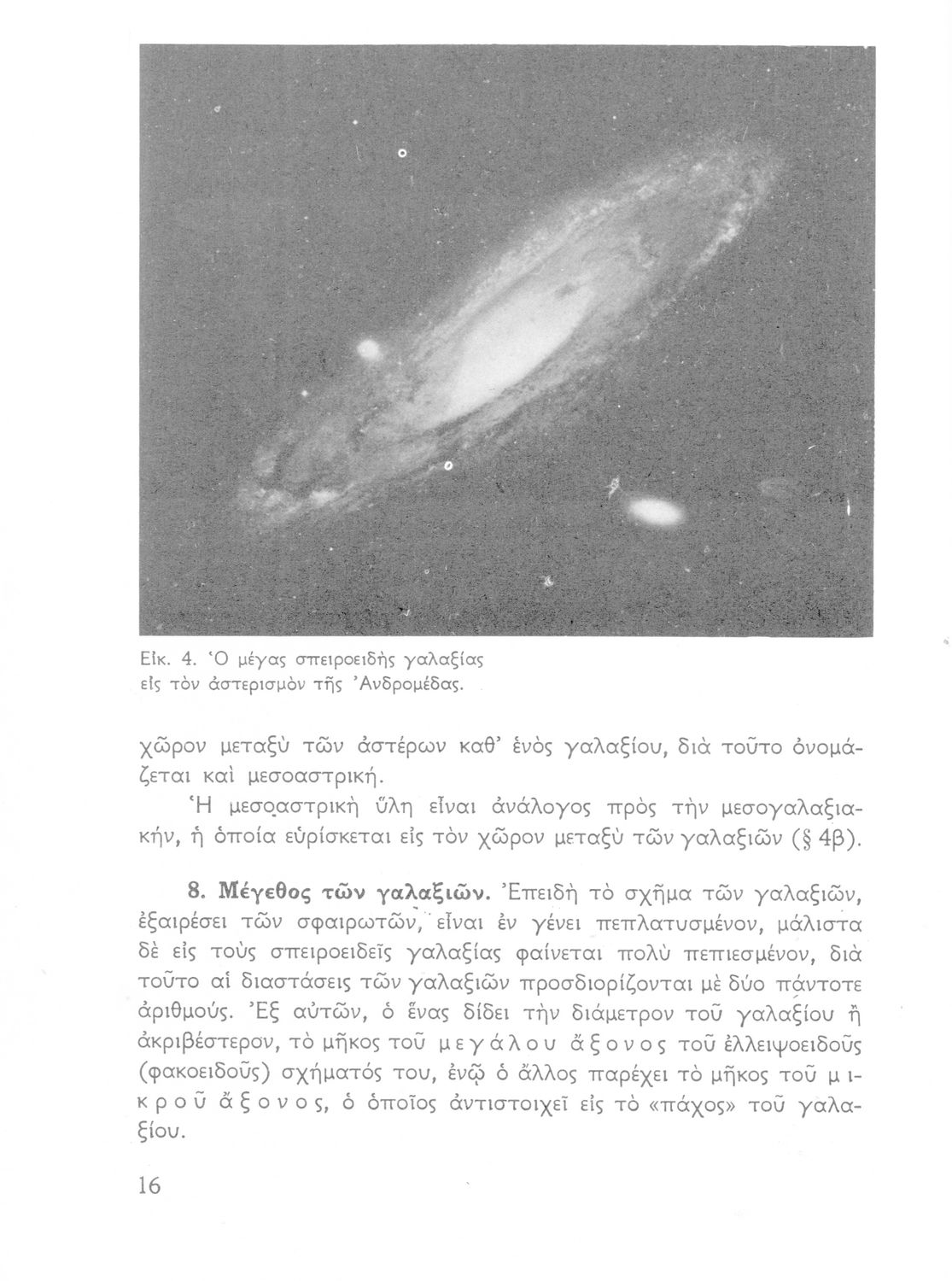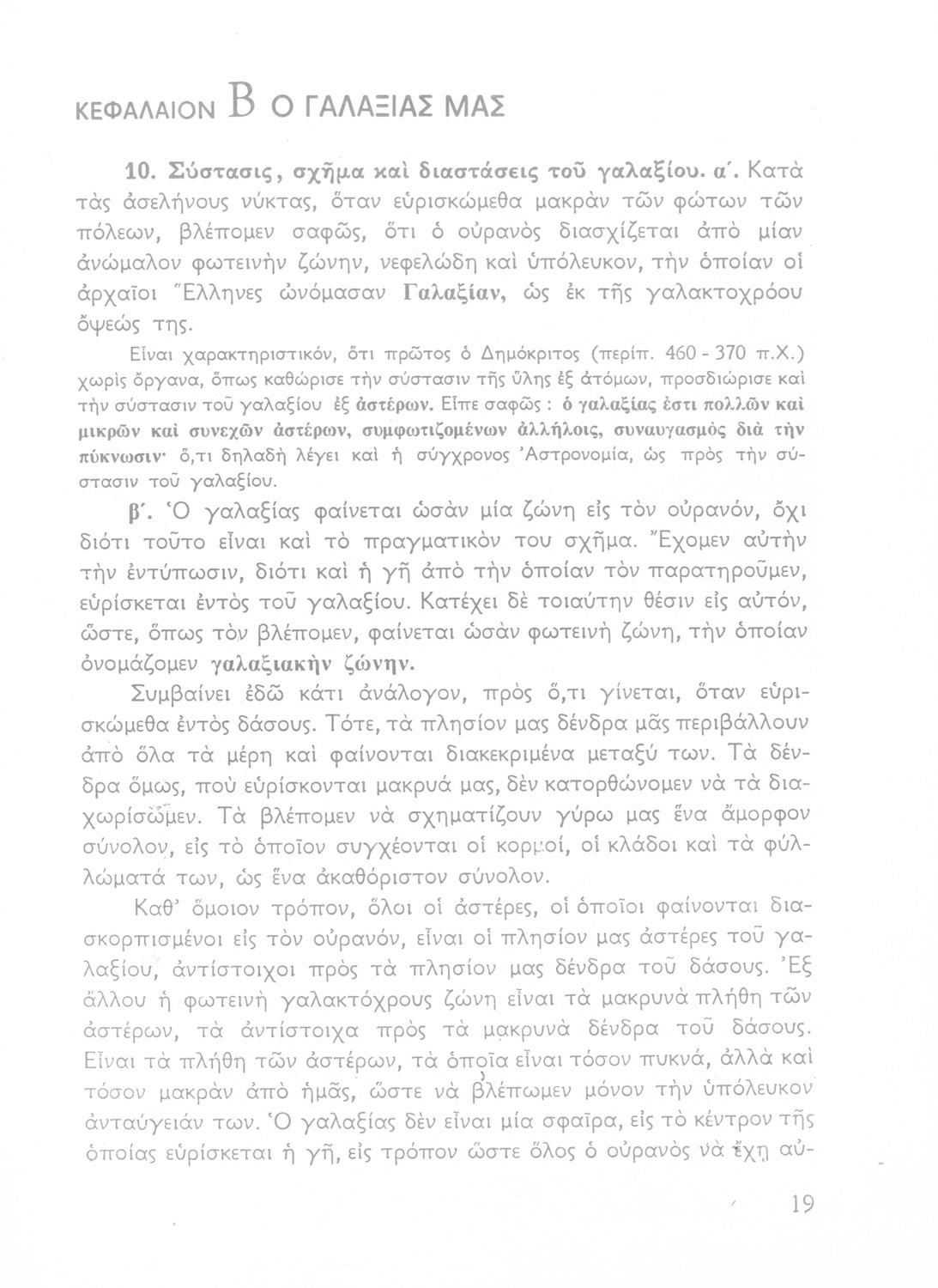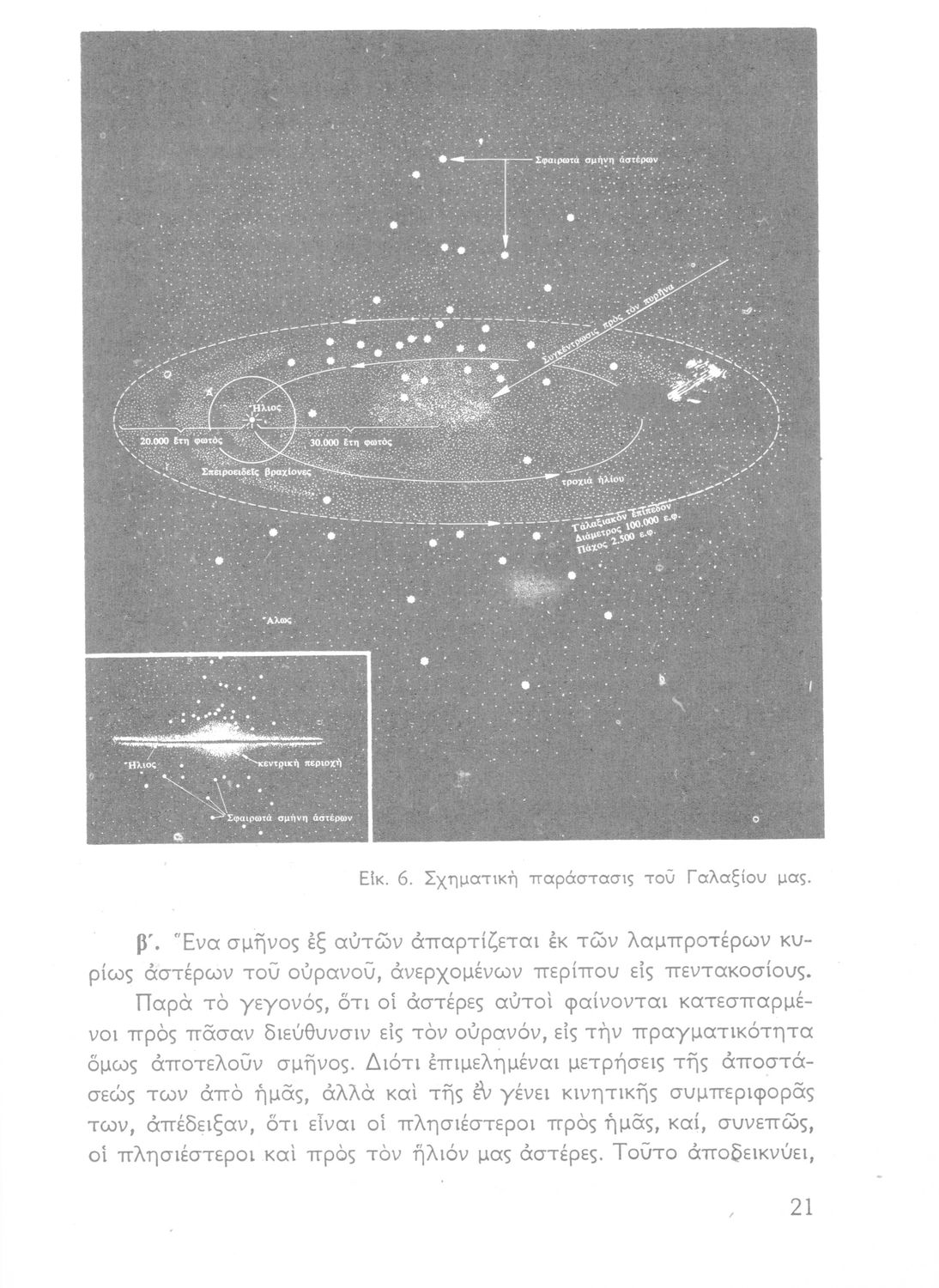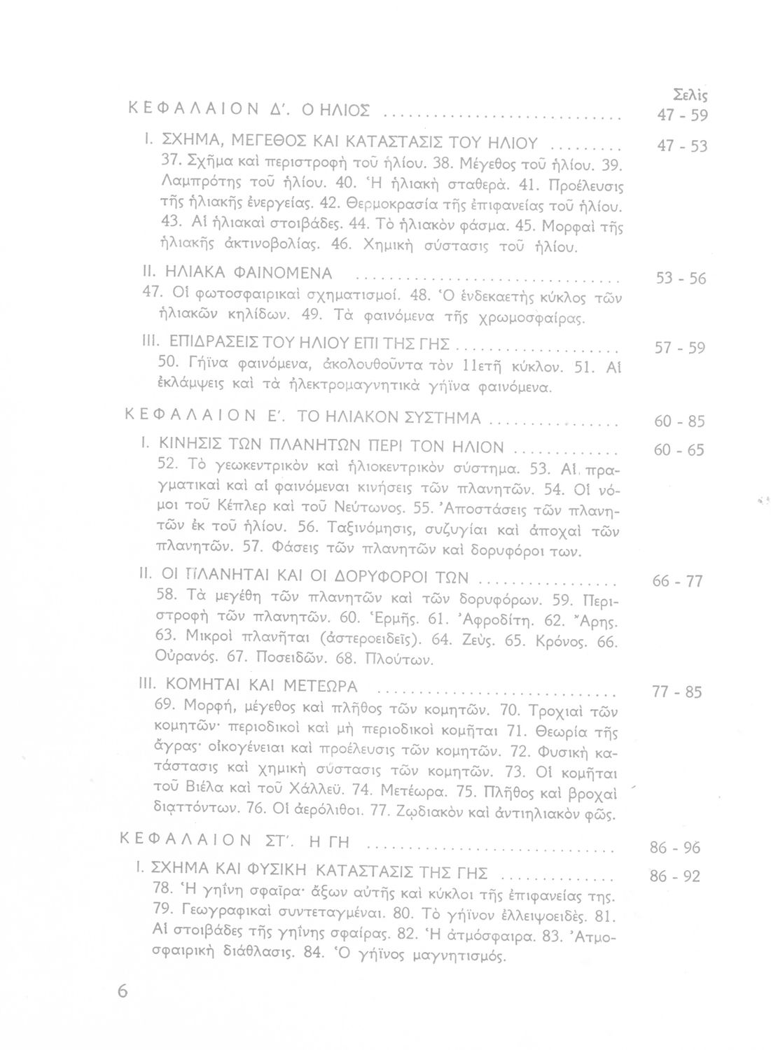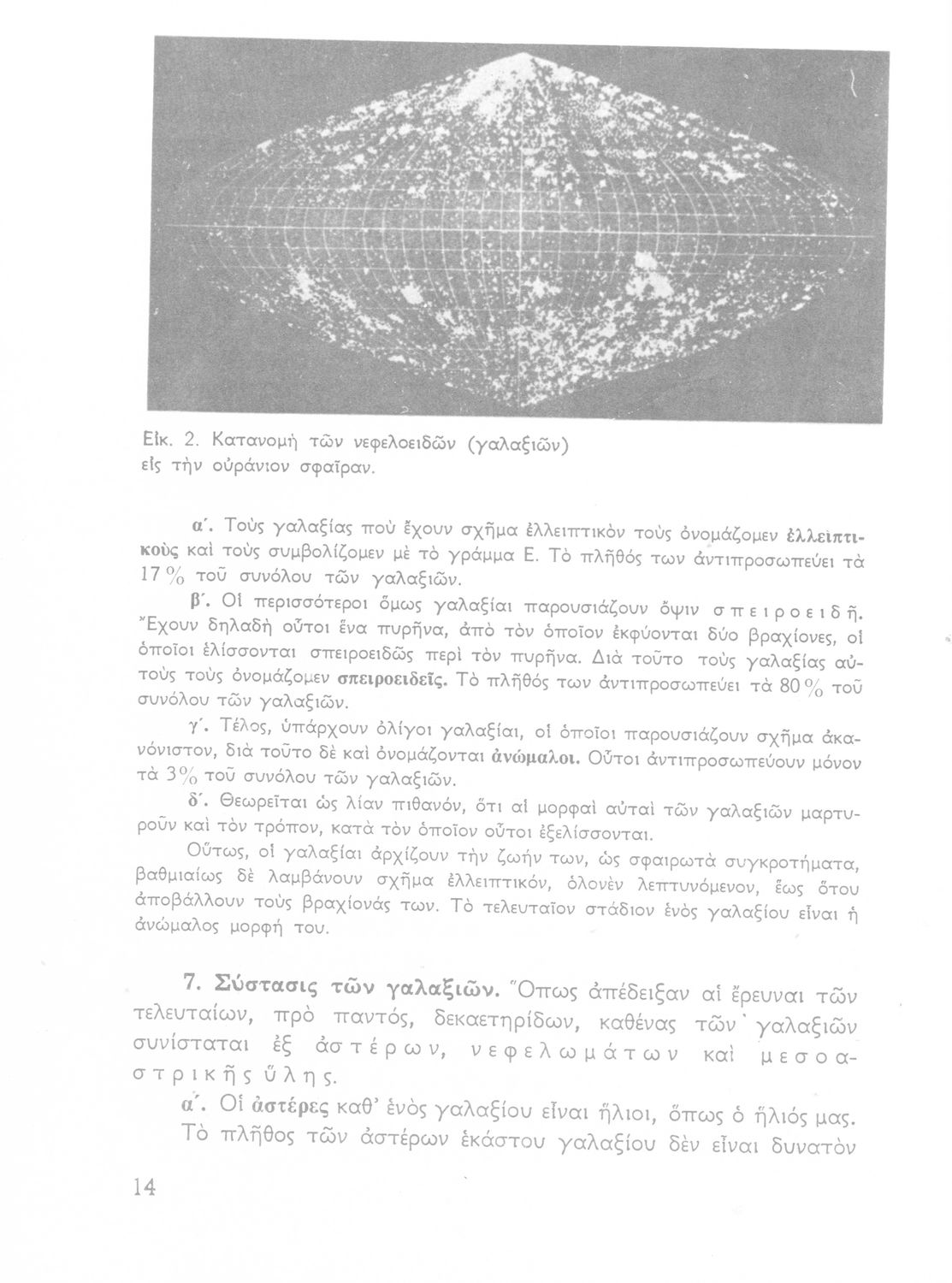 Σχολικό εγχειρίδιο Κοσμογραφίας ΣΤ΄ Γυμνασίου που πραγματεύεται τη μορφή, σύσταση, μέγεθος και κίνηση των γαλαξιών και των πλανητών. Περιέχει στοιχεία αστροναυτικής και πίνακα με 88 αστερισμούς, τα διεθνή ονόματα και τα σύμβολά τους.