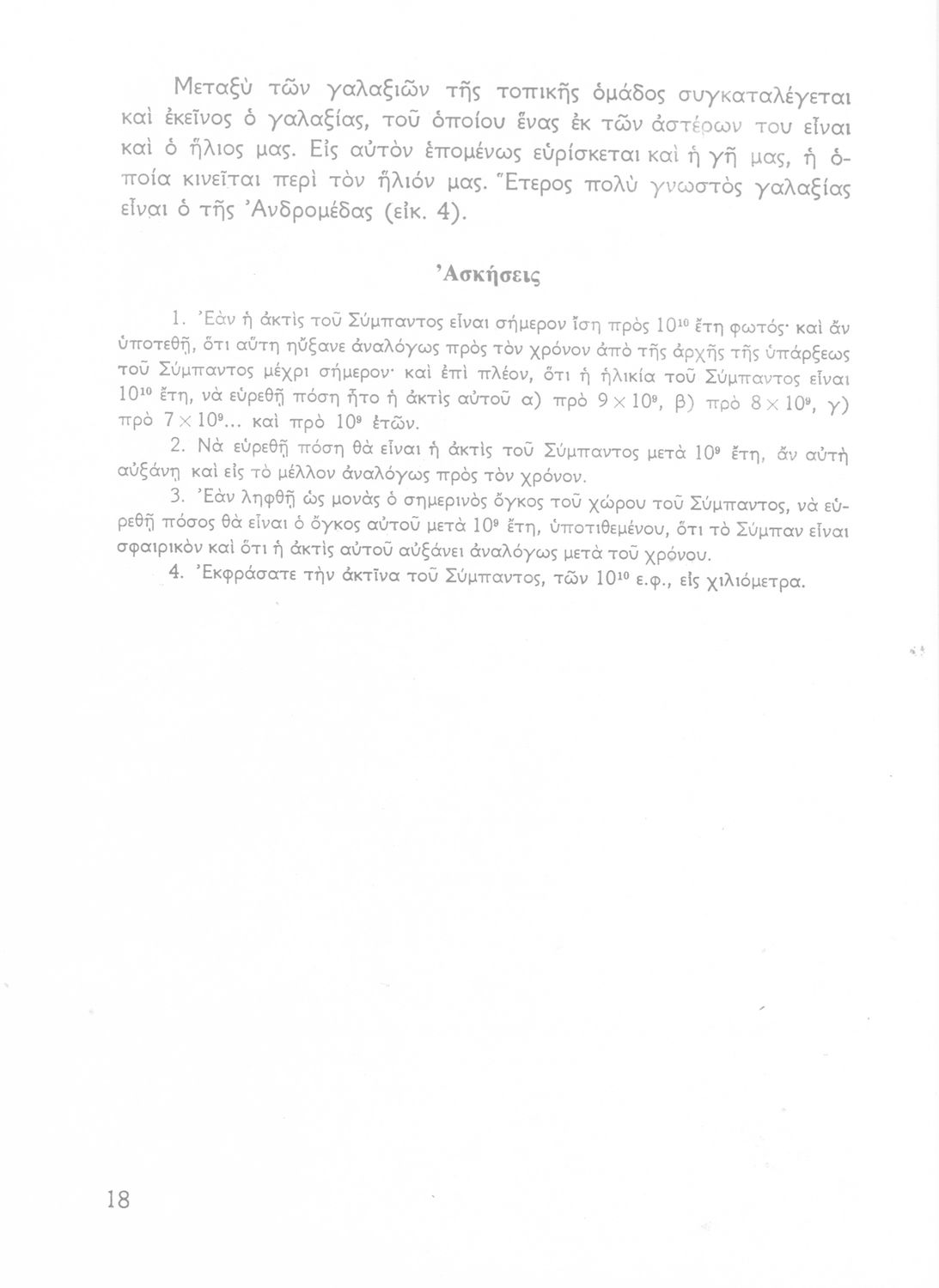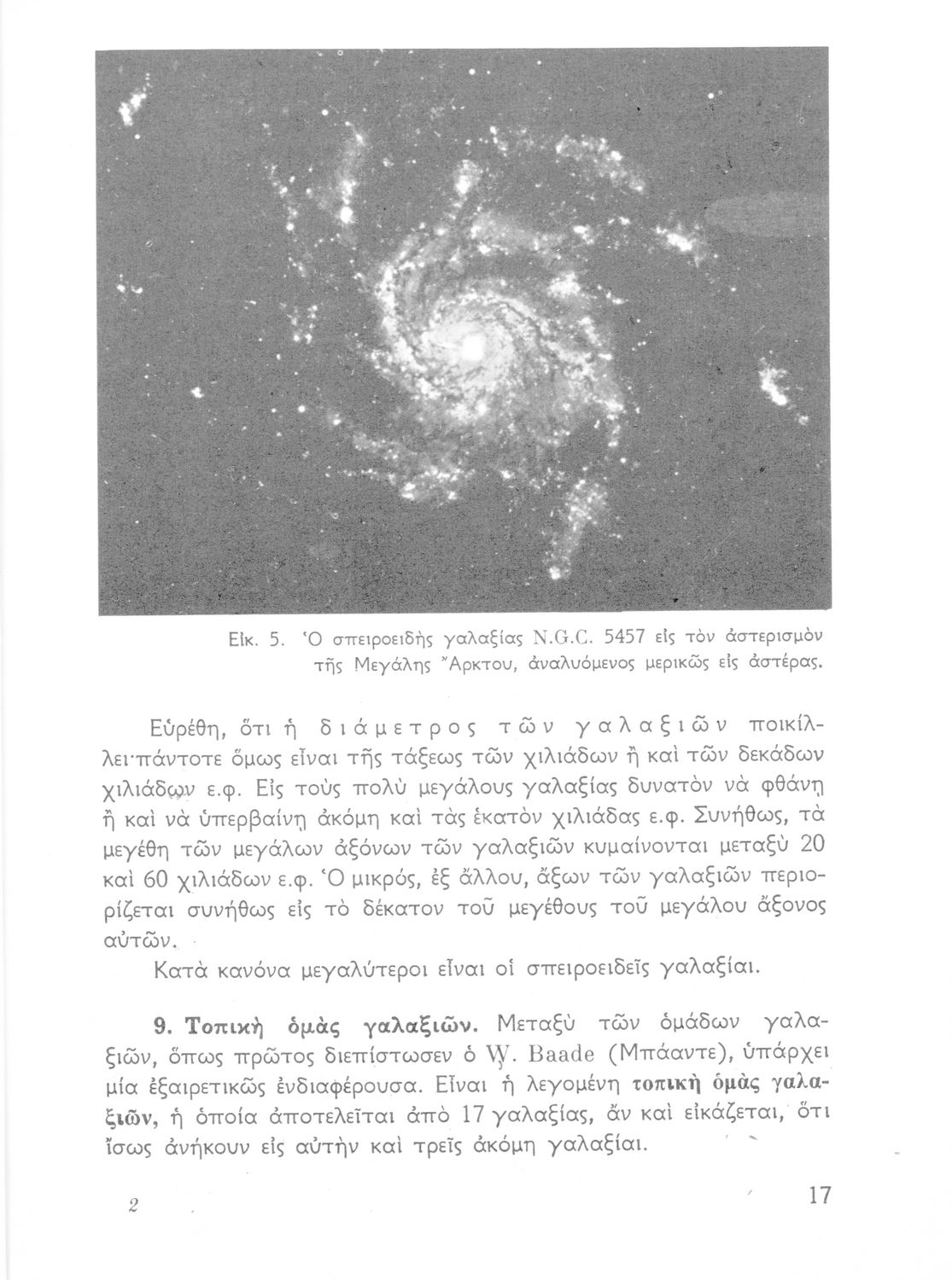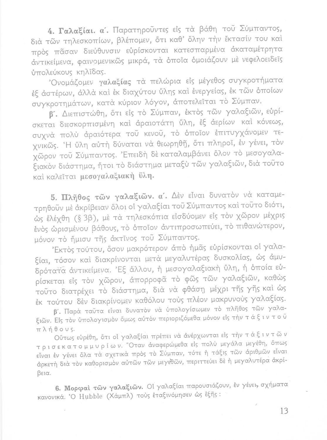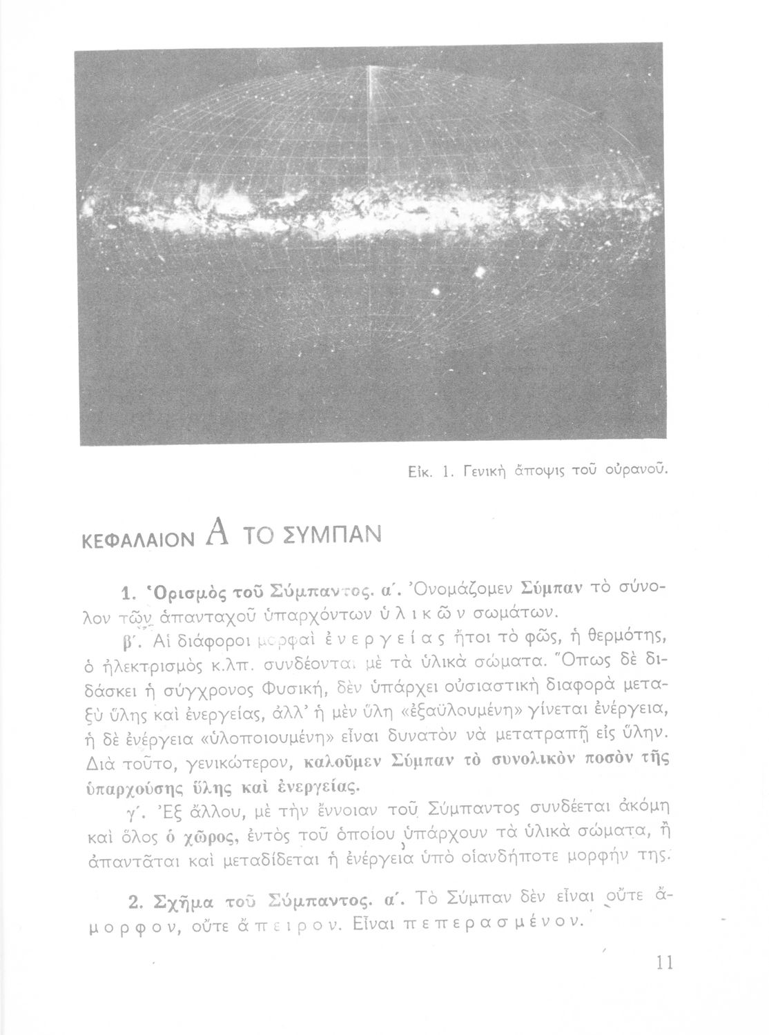 Σχολικό εγχειρίδιο Κοσμογραφίας ΣΤ΄ Γυμνασίου που πραγματεύεται τη μορφή, σύσταση, μέγεθος και κίνηση των γαλαξιών και των πλανητών. Περιέχει στοιχεία αστροναυτικής και πίνακα με 88 αστερισμούς, τα διεθνή ονόματα και τα σύμβολά τους.