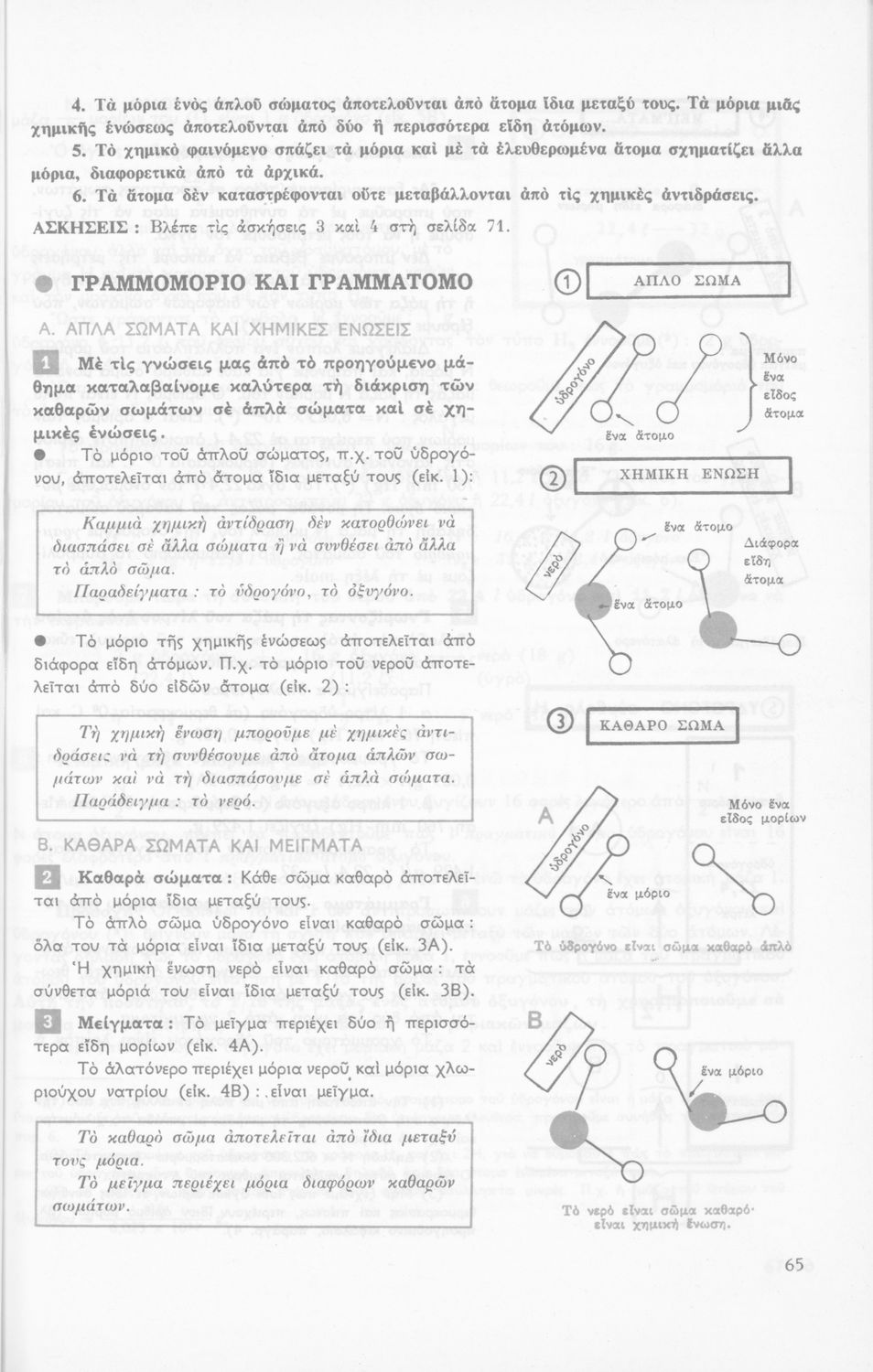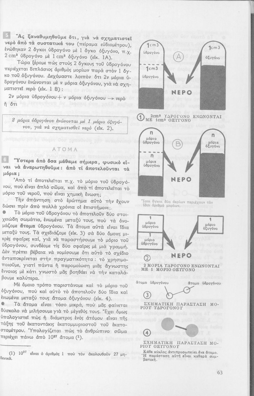 Σχολικό εγχειρίδιο Χημείας Β΄ Γυμνασίου που περιγράφει τη δομή των μορίων και των ατόμων, τις χημικές ενώσεις και εξισώσεις, και τις ομάδες του περιοδικού συστήματος. Περιέχει και στοιχεία ορυκτολογίας.