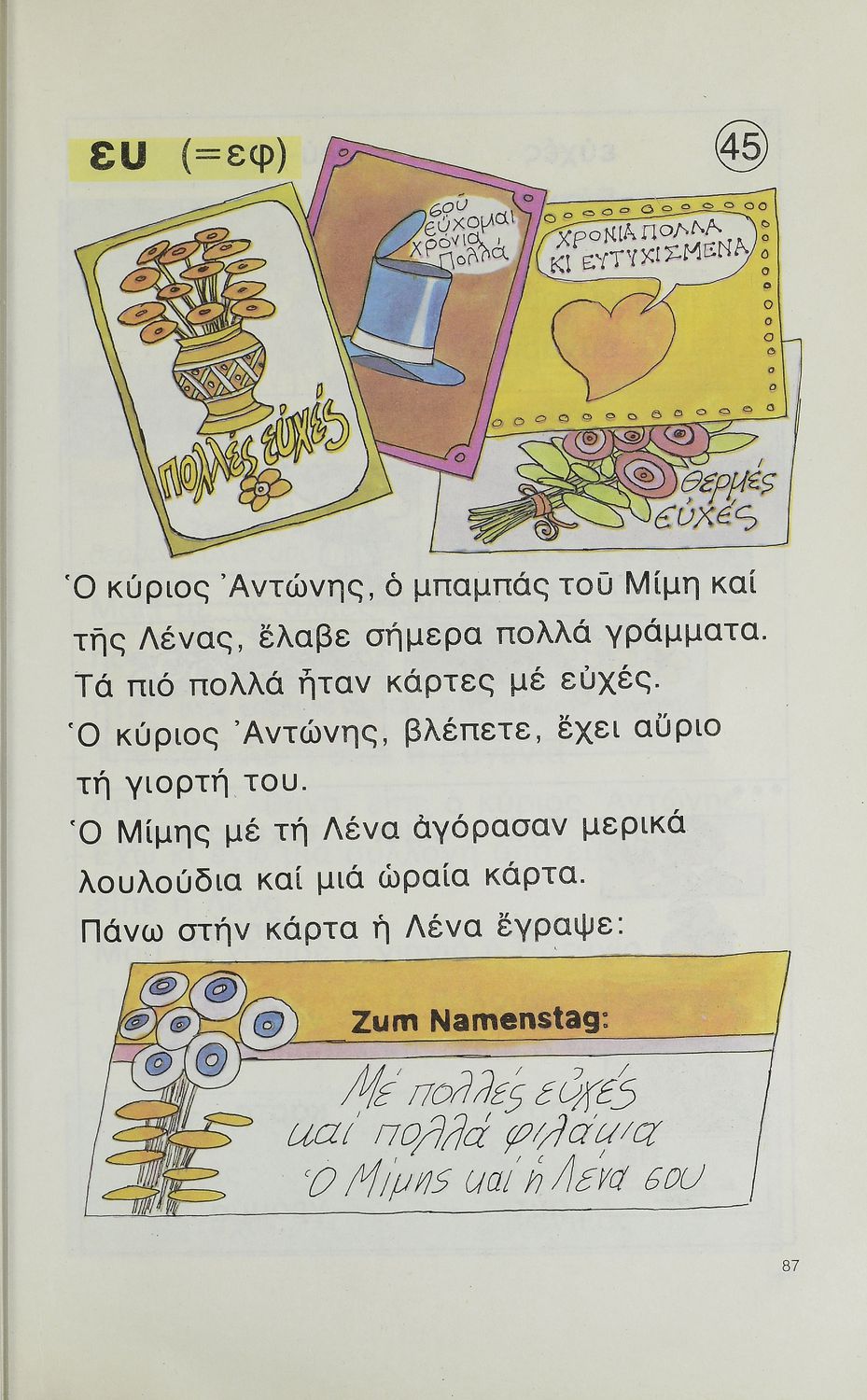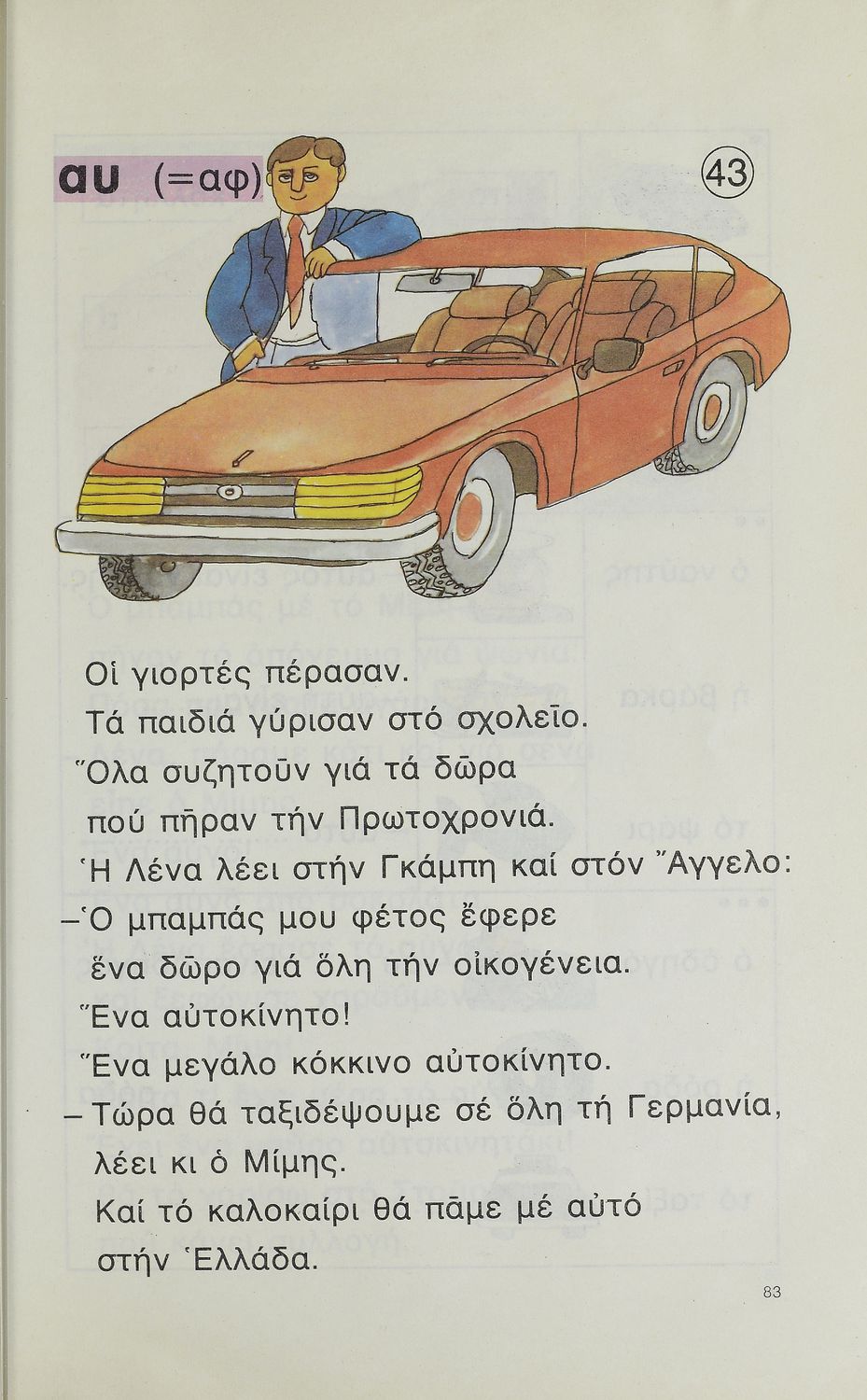Παρουσίαση περιεχομένου: Αναγνωστικό Α' Δημοτικού για τα Ελληνόπουλα της Γερμανίας με εικόνες και κείμενα προσαρμοσμένα στο τοπικό και κοινωνικό περιβάλλον τους. Περιέχει ασκήσεις για την εμπέδωση των κειμένων και των γραμματικών φαινομένων.