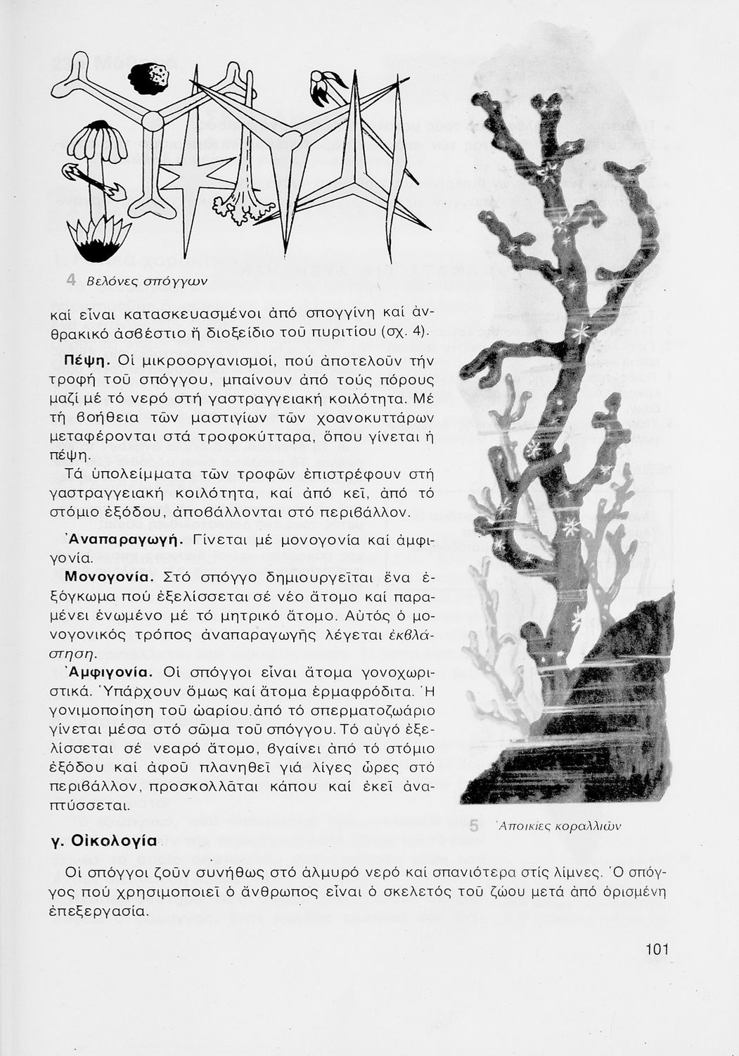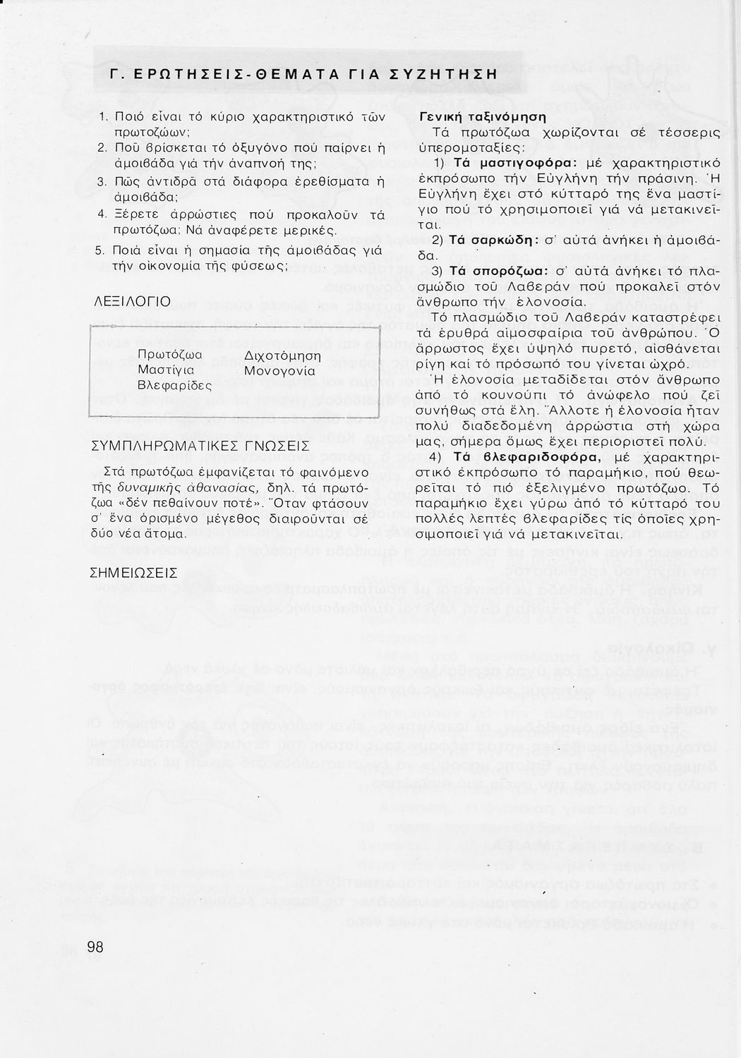 Σχολικό εγχειρίδιο Ζωολογίας Α΄ Γυμνασίου που εστιάζει στη φυσιολογία και ανατομία και παρουσιάζει τα διάφορα ζώα ανάλογα με την συνομοταξία στην οποία ανήκουν. Φέρει το σύμβολο της δικτατορίας.