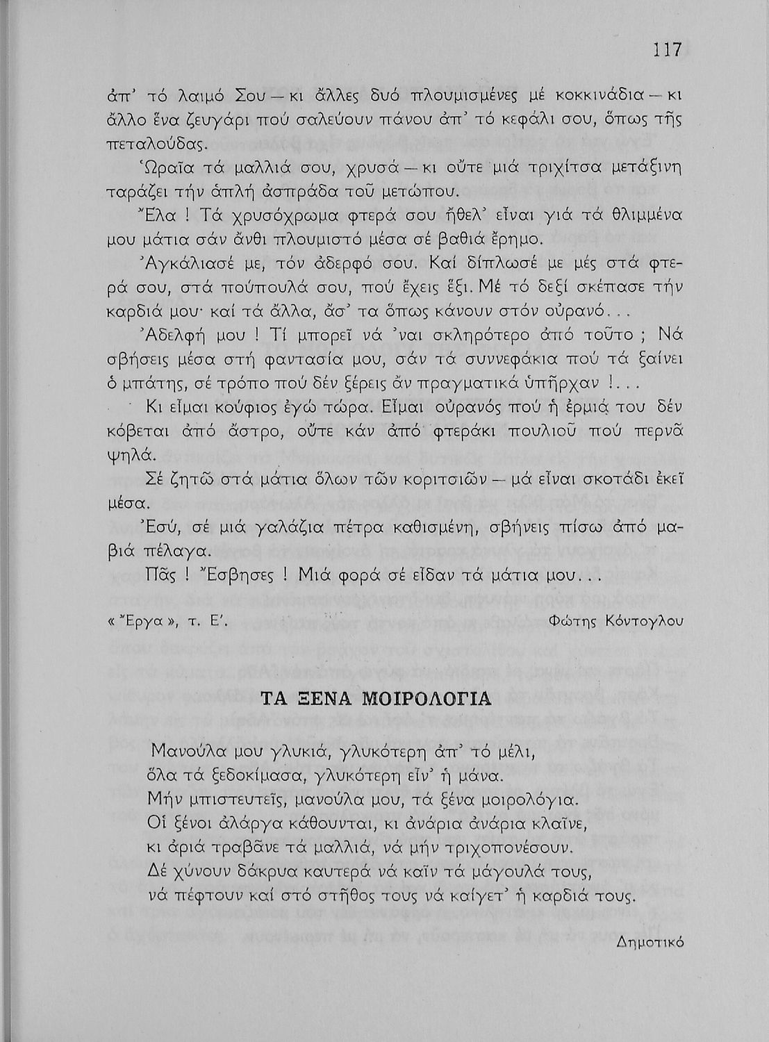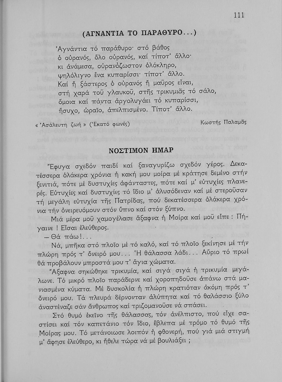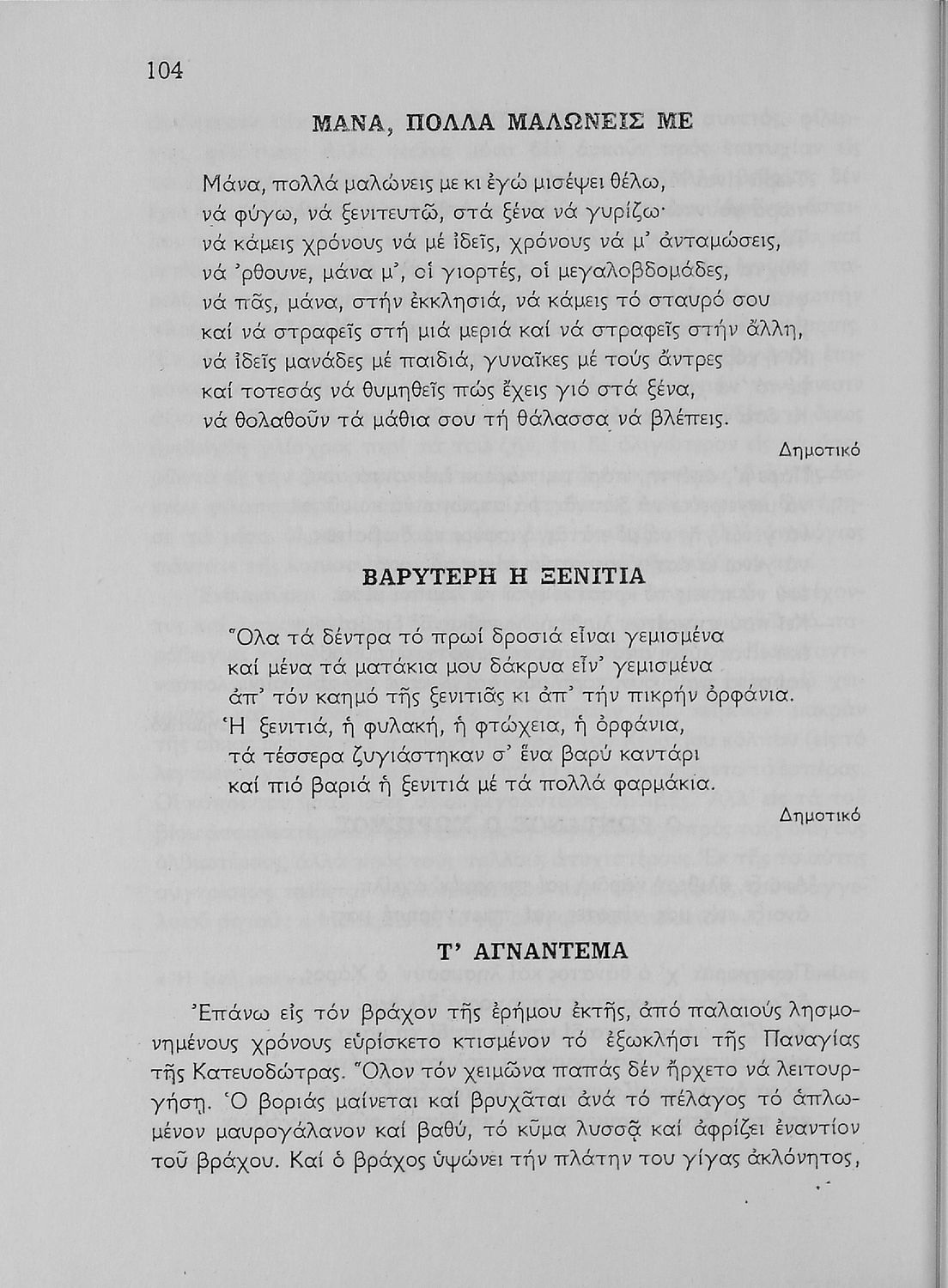 Σχολικό εγχειρίδιο Νέων Ελληνικών για τη Γ΄ Γυμνασίου που περιέχει κείμενα και ποιήματα Ελλήνων λογοτεχνών και ποιητών. Η θεματολογία είναι από την θρησκευτική, εθνική οικογενειακή και κοινωνική ζωή καθώς και από την ελληνική φύση. Στο τέλος υπάρχει ερμηνευτικό λεξικό και οι βιογραφίες των συγγραφέων.