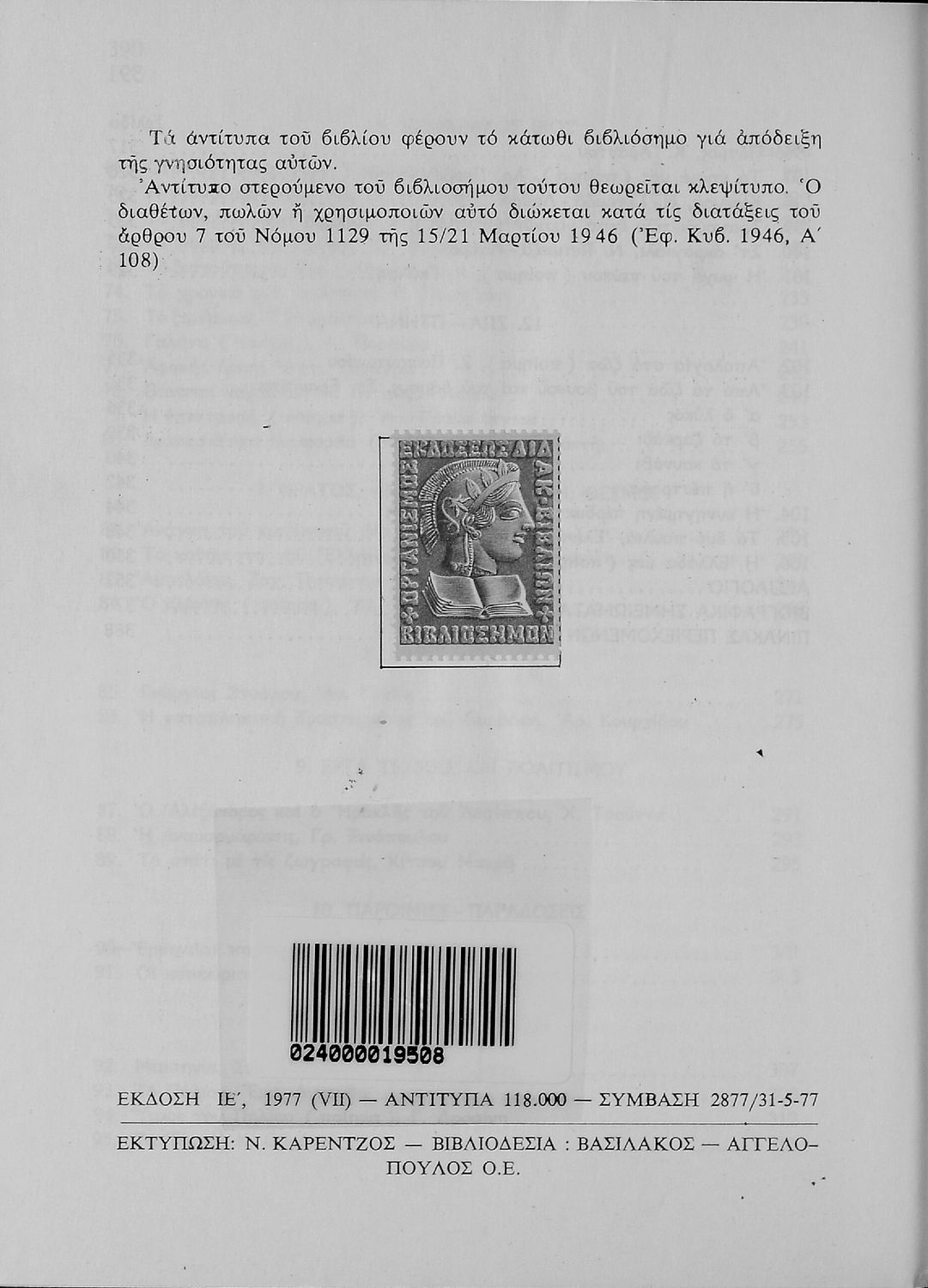 Εκδότης: Οργανισμός Εκδόσεως Διδακτικών Βιβλίων Έτος έκδοσης: 1977 Τόπος έκδοσης: Αθήνα Έκδοση: 15η Υπουργική απόφαση / Σύμβαση: 2877/31-5-1977 Έτος έγκρισης: 1977 |