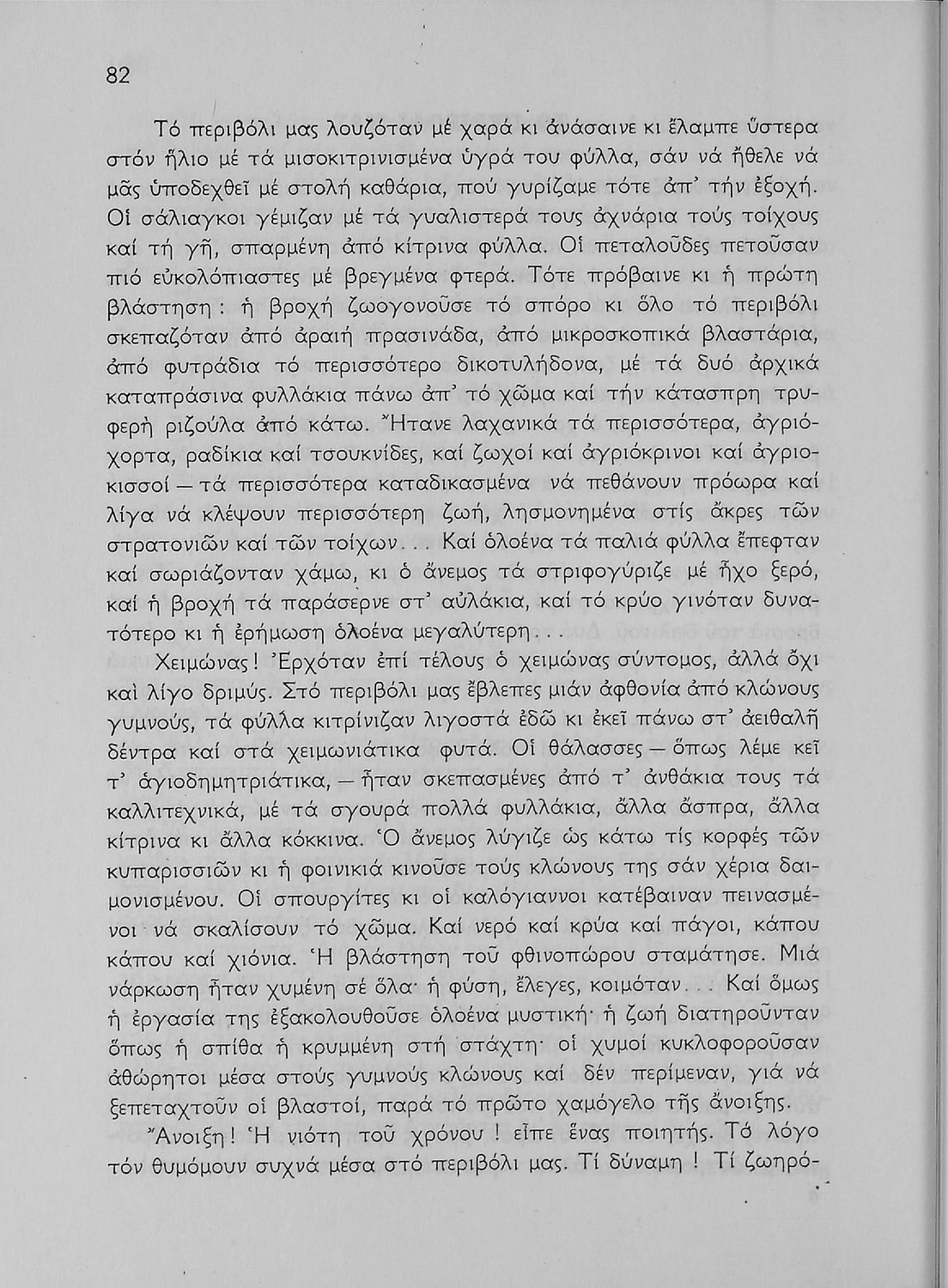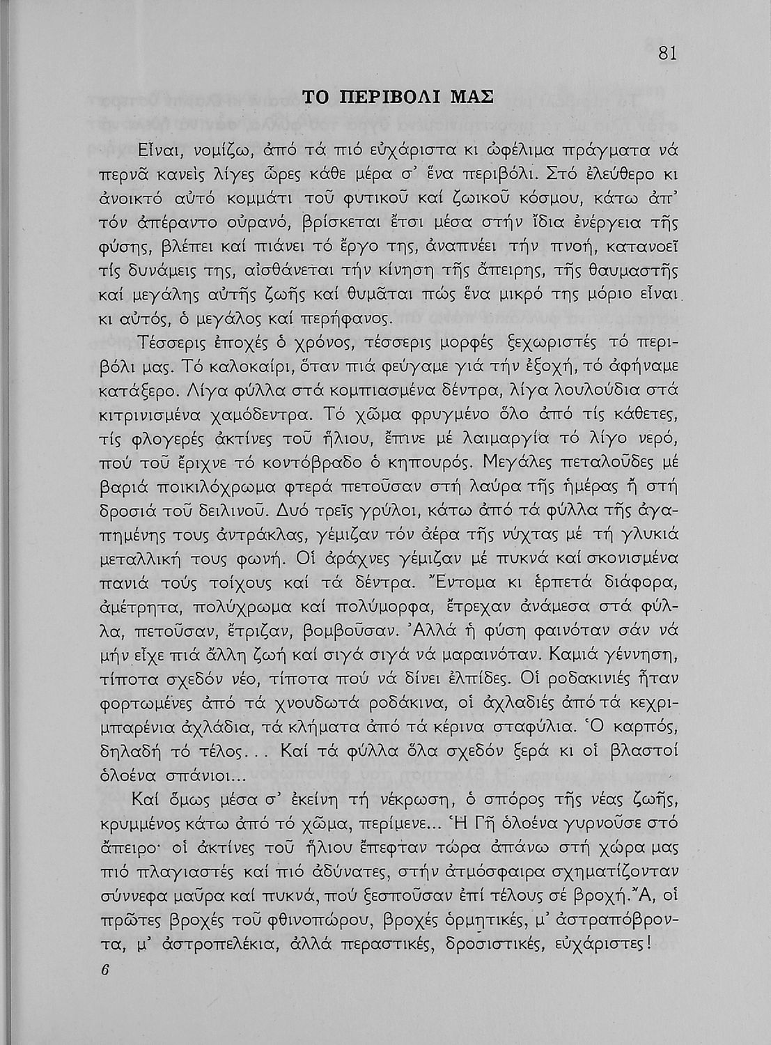 Σχολικό εγχειρίδιο Νέων Ελληνικών για τη Γ΄ Γυμνασίου που περιέχει κείμενα και ποιήματα Ελλήνων λογοτεχνών και ποιητών. Η θεματολογία είναι από την θρησκευτική, εθνική οικογενειακή και κοινωνική ζωή καθώς και από την ελληνική φύση. Στο τέλος υπάρχει ερμηνευτικό λεξικό και οι βιογραφίες των συγγραφέων.