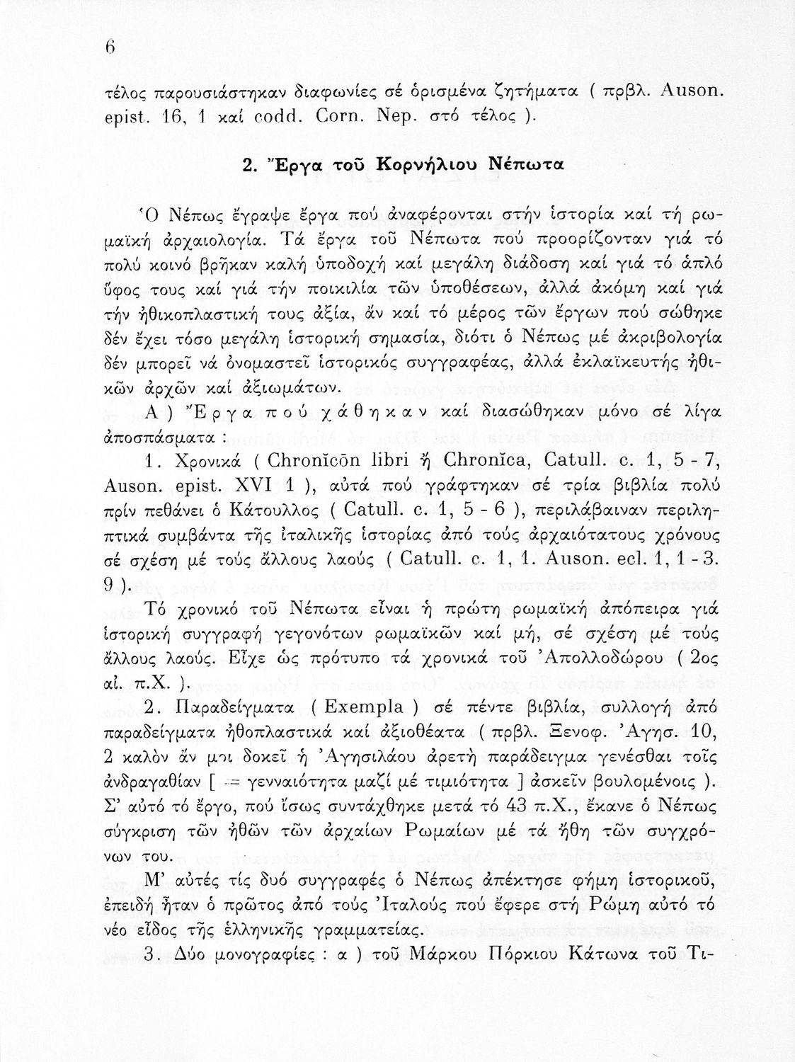 Βαθμίδα εκπαίδευσης: Δευτεροβάθμια Τάξη: Β' Λυκείου Μάθημα: Λατινικά Γλώσσα: Δημοτική Παρουσίαση περιεχομένου: Σχολικό εγχειρίδιο Λατινικών Β΄ Λυκείου που περιέχει σύντομο βιογραφικό σημείωμα του Νέπωτα, αποσπάσματα από τα έργα Αμίλκας, Αννίβας, Κάτων και Αττικός, ιστορικό και γεωγραφικό πίνακα και λεξιλόγιο. Ο συγγραφέας ήταν ακαδημαϊκός και ομότιμος καθηγητής της Λατινικής Φιλολογίας στο Πανεπιστήμιο Αθηνών. |