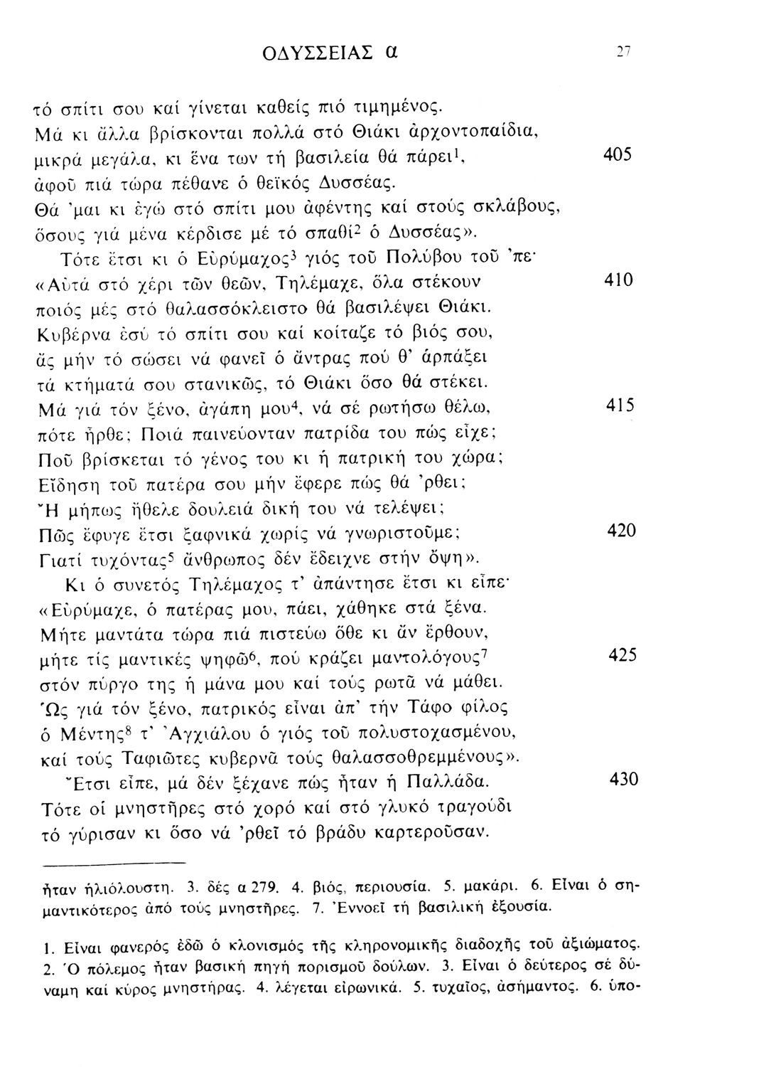 Παιδαγωγικό βοήθημα Αρχαίων Ελληνικών που περιλαμβάνει μετάφραση της Ομήρου Οδύσσειας στη νέα ελληνική, εισαγωγή στην επική ποίηση και στην Οδύσσεια, περιλήψεις και σημειώσεις.