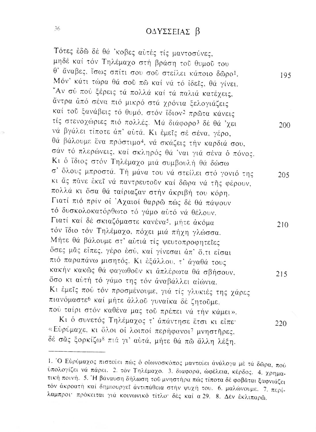 Σχολικό εγχειρίδιο του Γυμνασίου για το μάθημα των Αρχαίων Ελληνικών. Πρόκειται για το κείμενο της Οδύσσειας μεταφρασμένο στο τέλος περιλαμβάνει λεξιλόγιο.