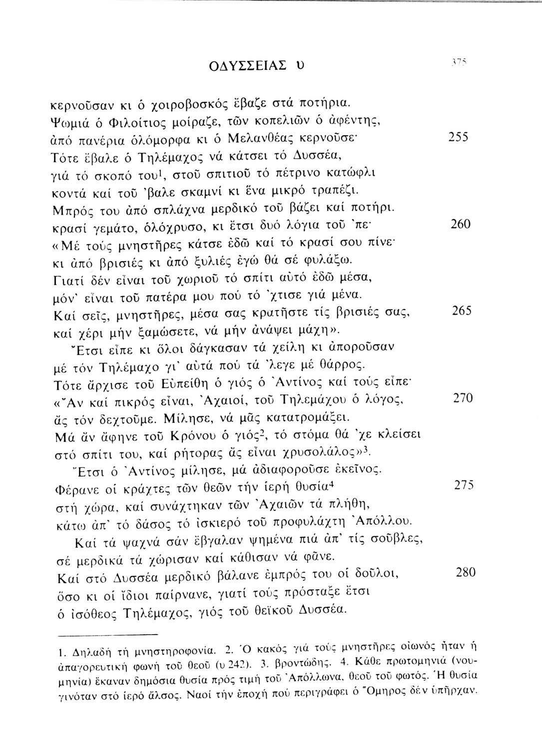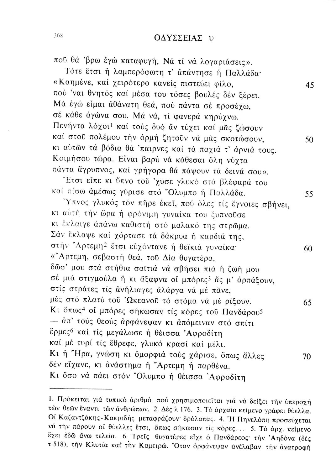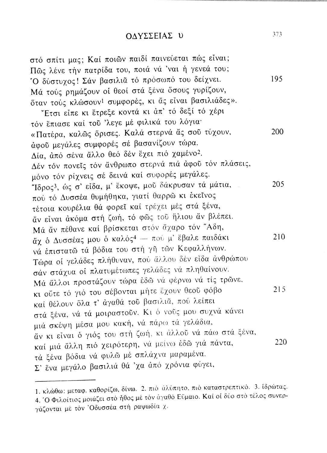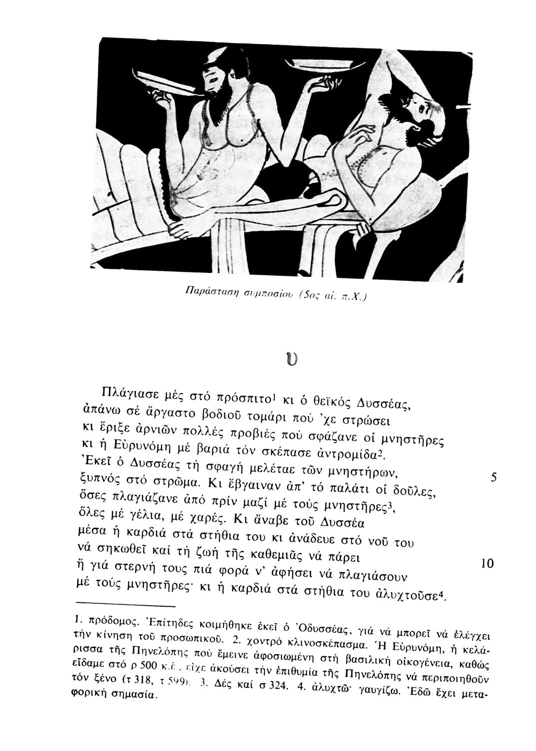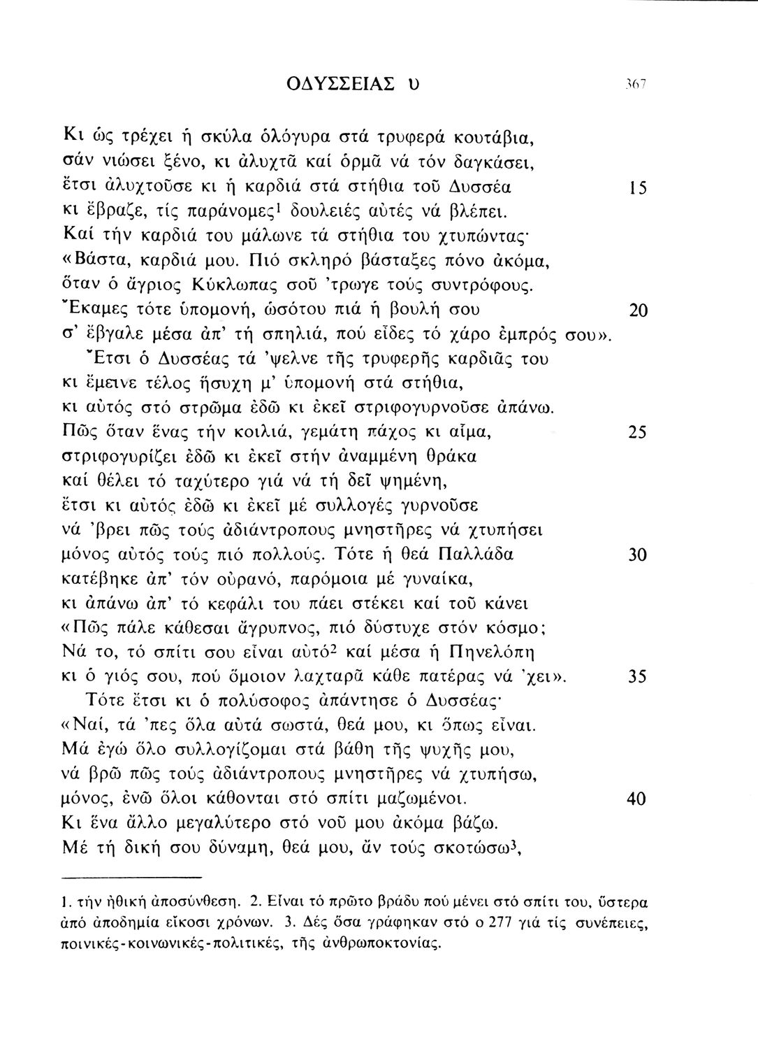Σχολικό εγχειρίδιο Αρχαίων Ελληνικών. Το βιβλίο περιλαμβάνει εισαγωγή σχετικά με το έργο του Ομήρου, τη δομή και το περιεχόμενο της Οδύσσειας. Ακολουθεί το έπος της Οδύσσειας σε μετάφραση του Ζήσιμου Σιδέρη. Τα κείμενα συνοδεύουν ερμηνευτικές υποσημειώσεις και σχόλια. Η εισαγωγή και τα σχόλια είναι του Γεν. Επιθεωρητή Τριαντ. Ι. Δελή. Η ορθογραφική προσαρμογή της μετάφρασης έγινε από το Γεν. Επιθ. Κ. Μικρουδή.