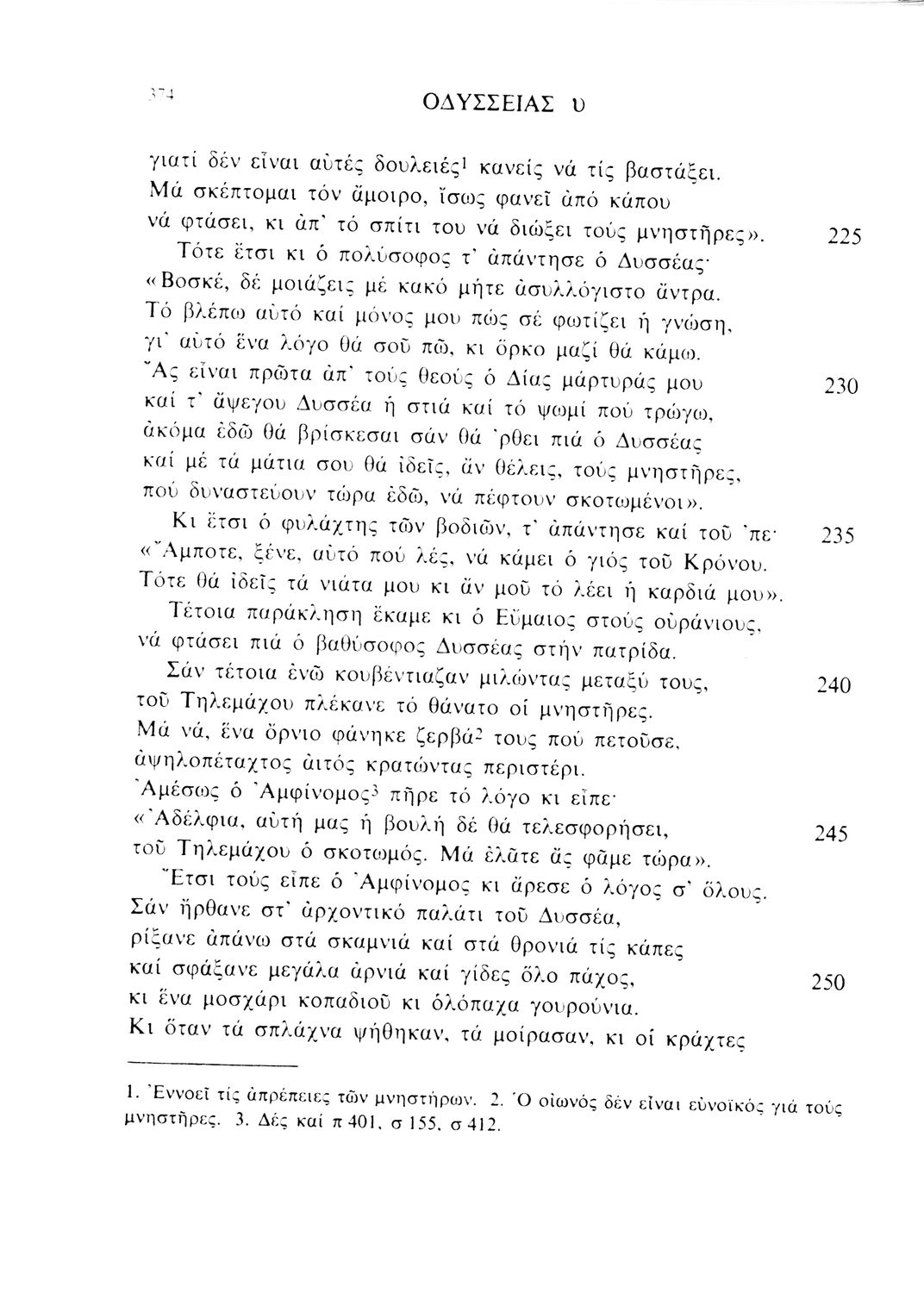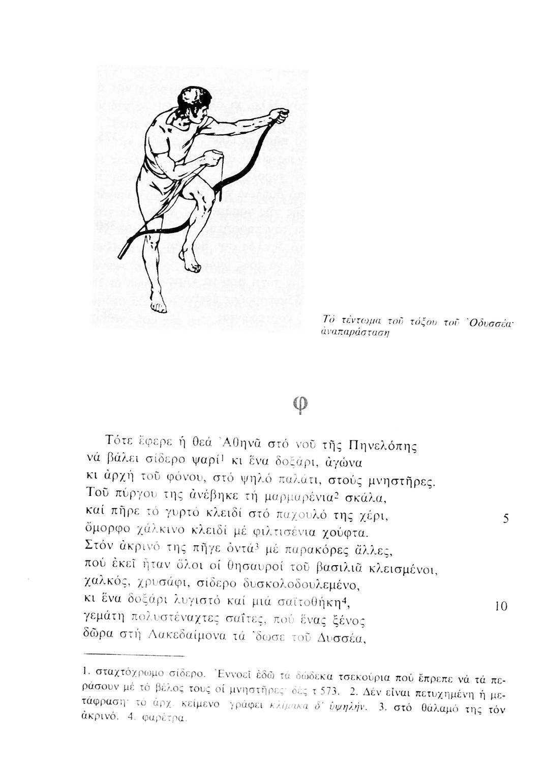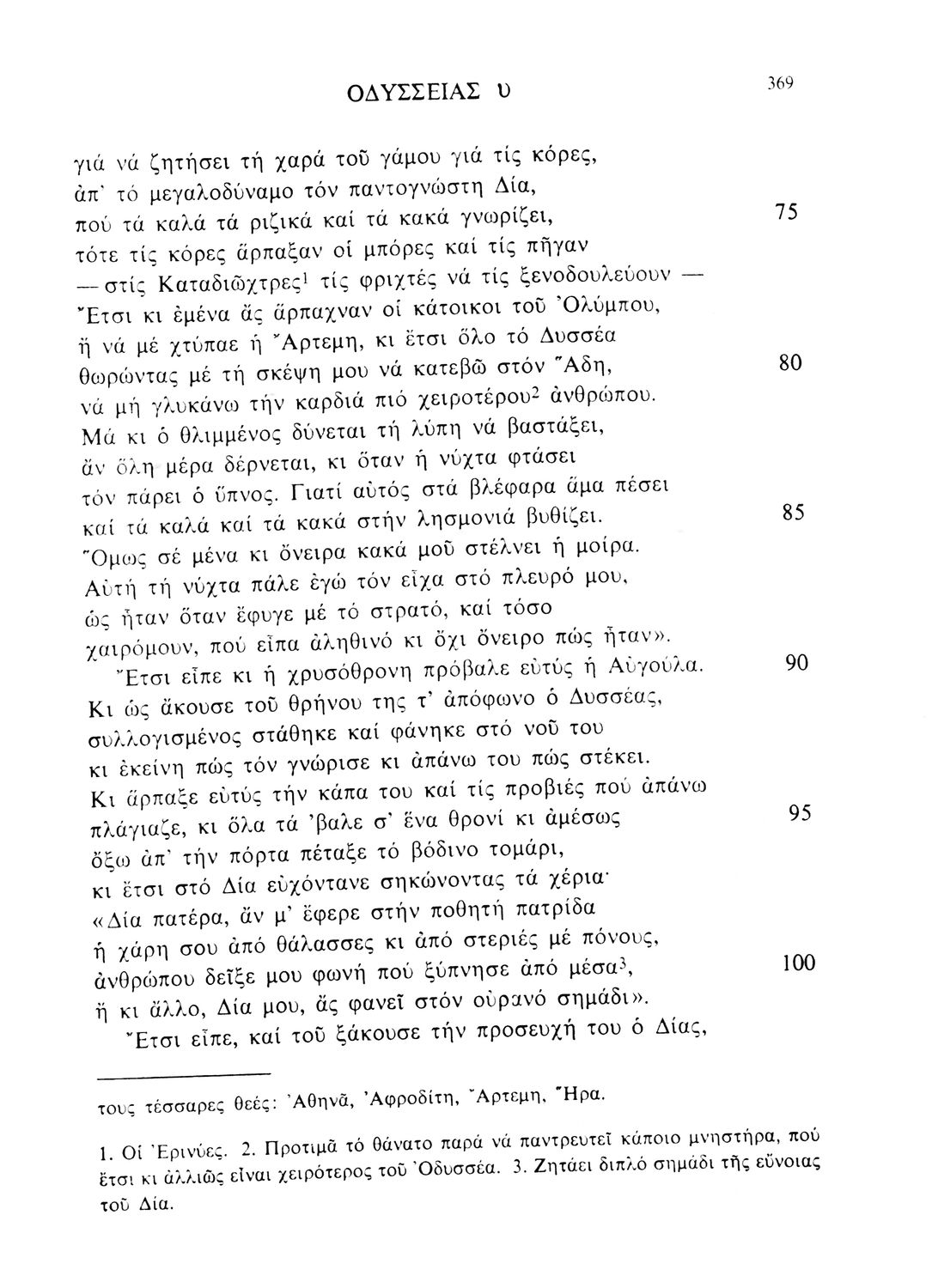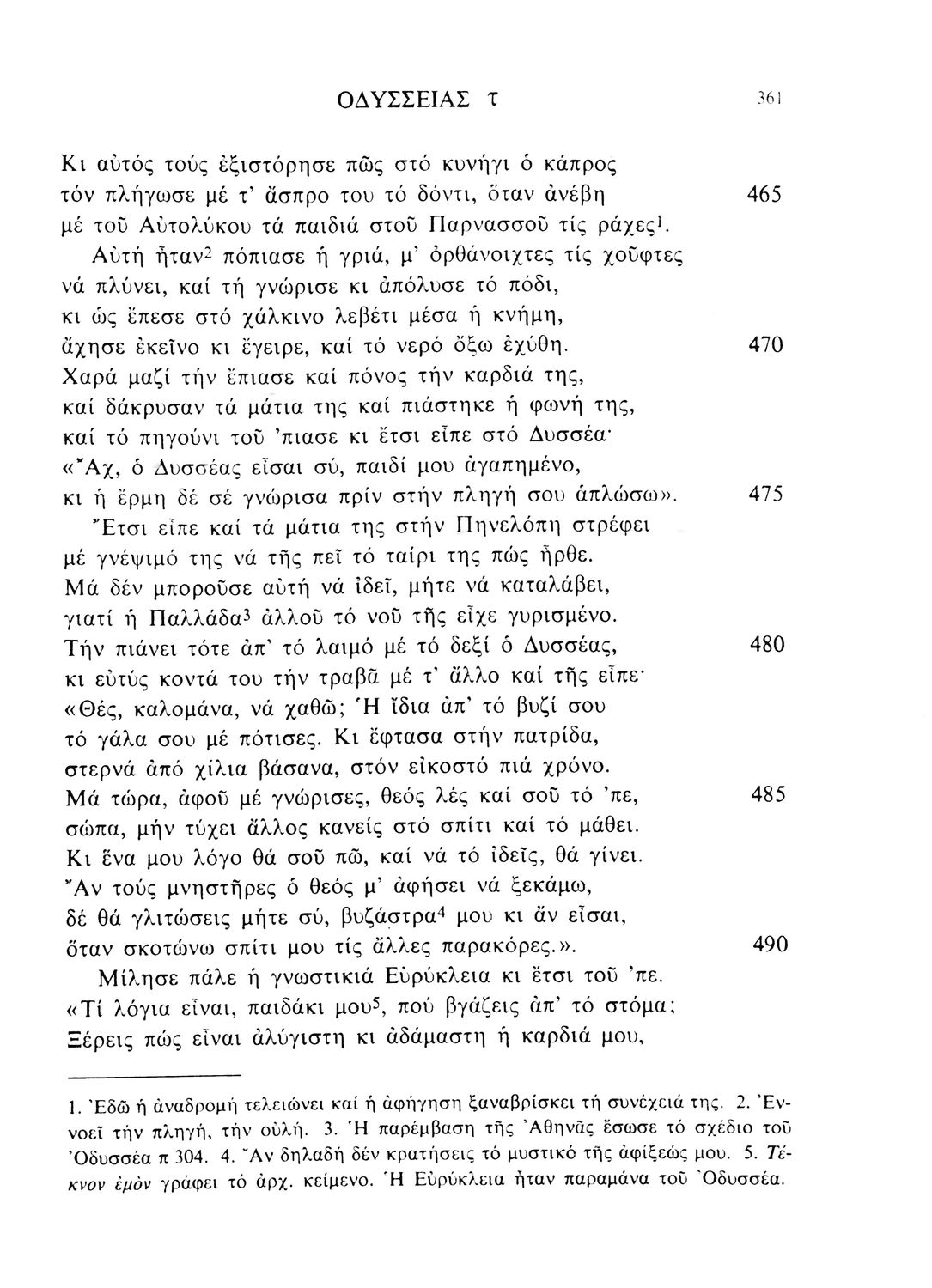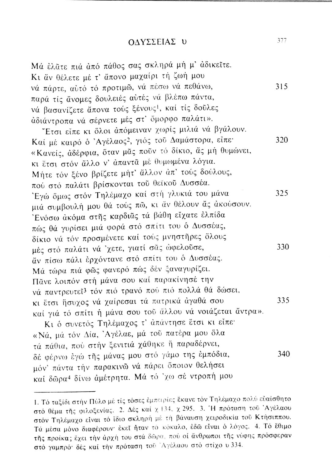 Σχολικό εγχειρίδιο Αρχαίων Ελληνικών. Το βιβλίο περιλαμβάνει εισαγωγή σχετικά με το έργο του Ομήρου, τη δομή και το περιεχόμενο της Οδύσσειας. Ακολουθεί το έπος της Οδύσσειας σε μετάφραση του Ζήσιμου Σιδέρη. Τα κείμενα συνοδεύουν ερμηνευτικές υποσημειώσεις και σχόλια. Η εισαγωγή και τα σχόλια είναι του Γεν. Επιθεωρητή Τριαντ. Ι. Δελή. Η ορθογραφική προσαρμογή της μετάφρασης έγινε από το Γεν. Επιθ. Κ. Μικρουδή.