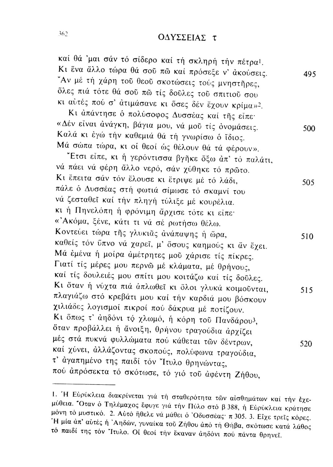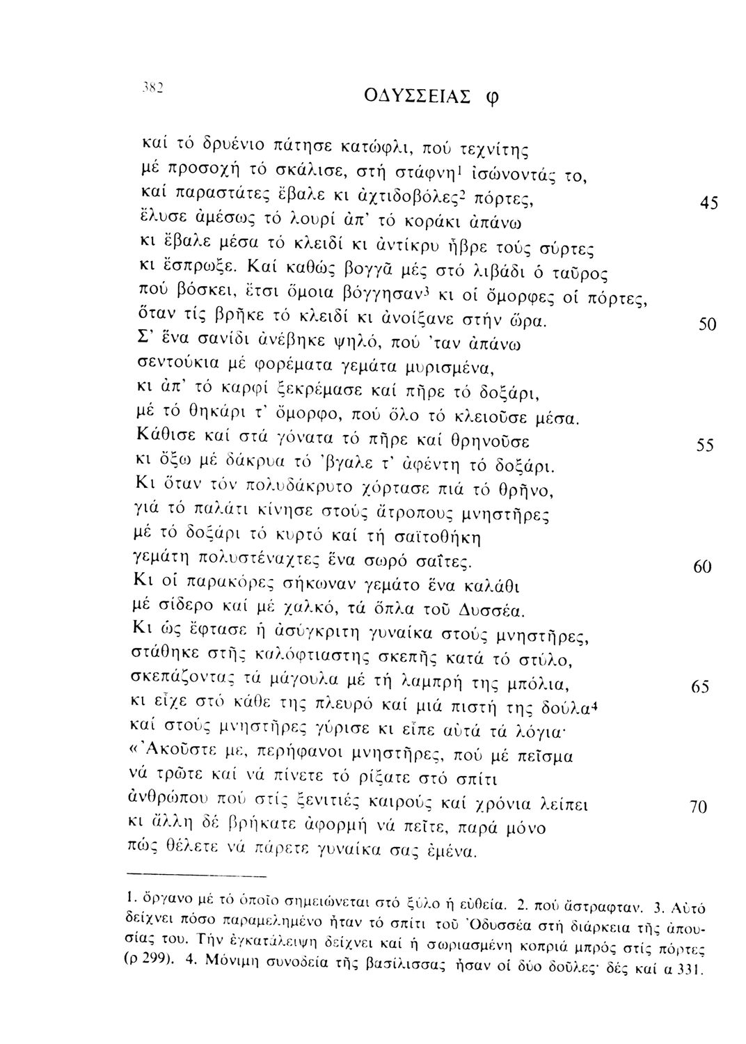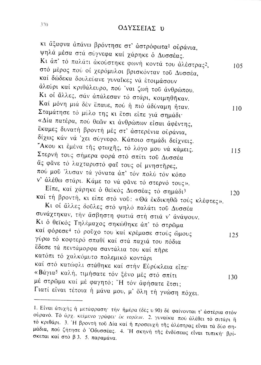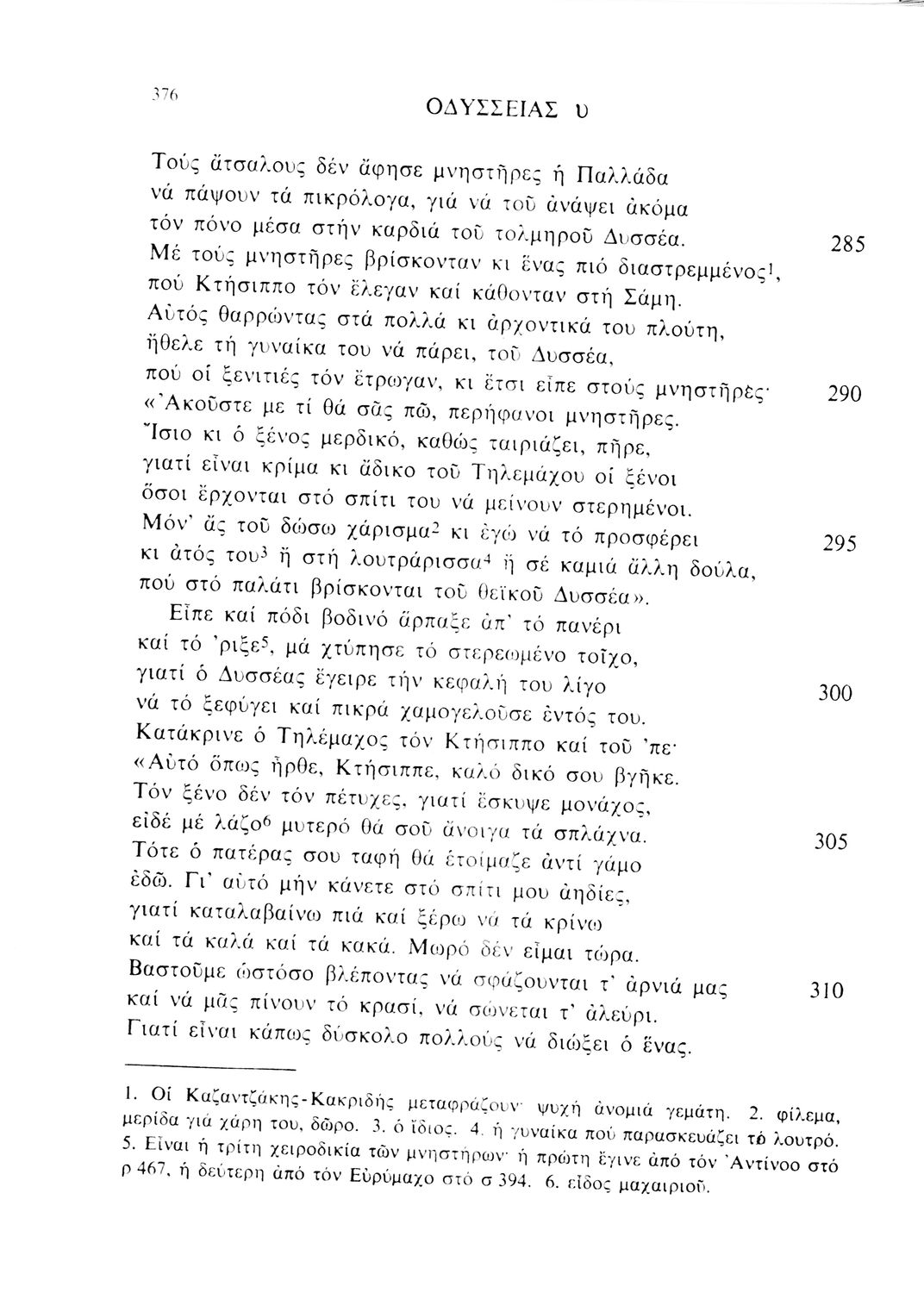 Σχολικό εγχειρίδιο Αρχαίων Ελληνικών. Το βιβλίο περιλαμβάνει εισαγωγή σχετικά με το έργο του Ομήρου, τη δομή και το περιεχόμενο της Οδύσσειας. Ακολουθεί το έπος της Οδύσσειας σε μετάφραση του Ζήσιμου Σιδέρη. Τα κείμενα συνοδεύουν ερμηνευτικές υποσημειώσεις και σχόλια. Η εισαγωγή και τα σχόλια είναι του Γεν. Επιθεωρητή Τριαντ. Ι. Δελή. Η ορθογραφική προσαρμογή της μετάφρασης έγινε από το Γεν. Επιθ. Κ. Μικρουδή.