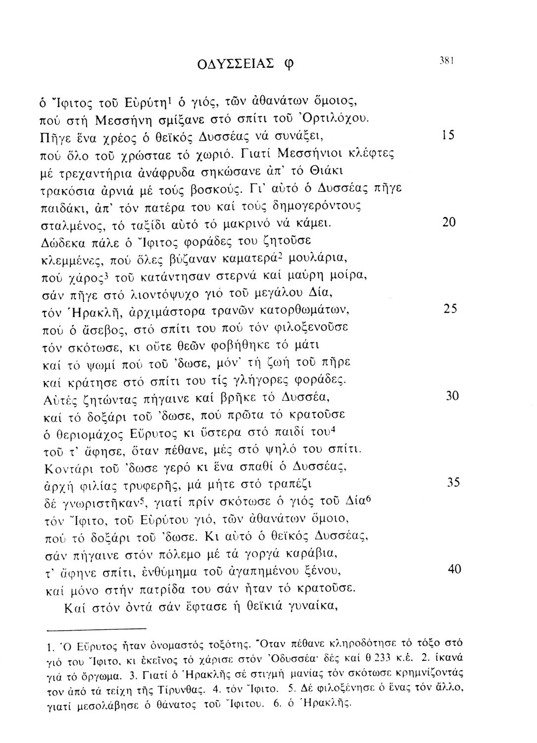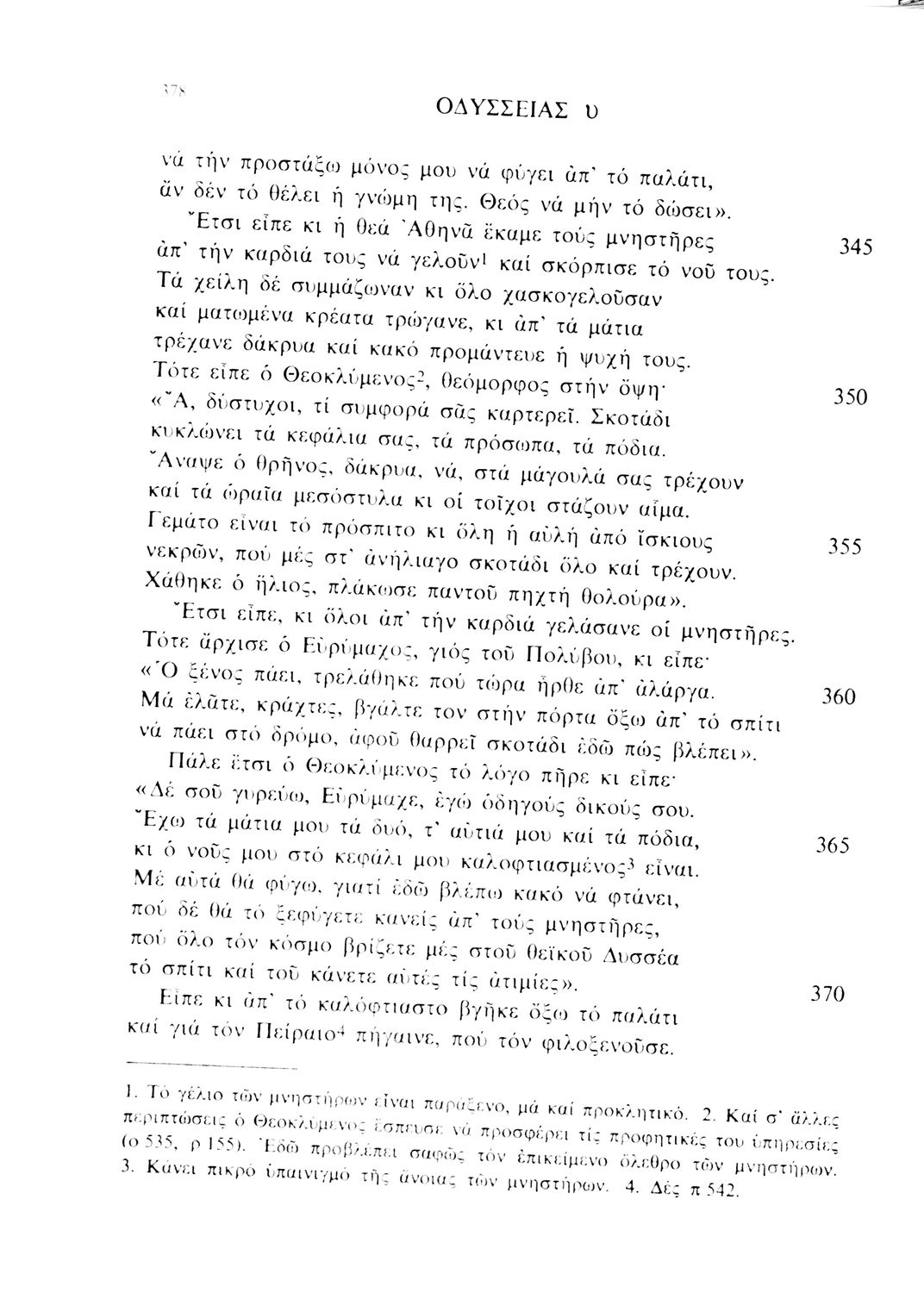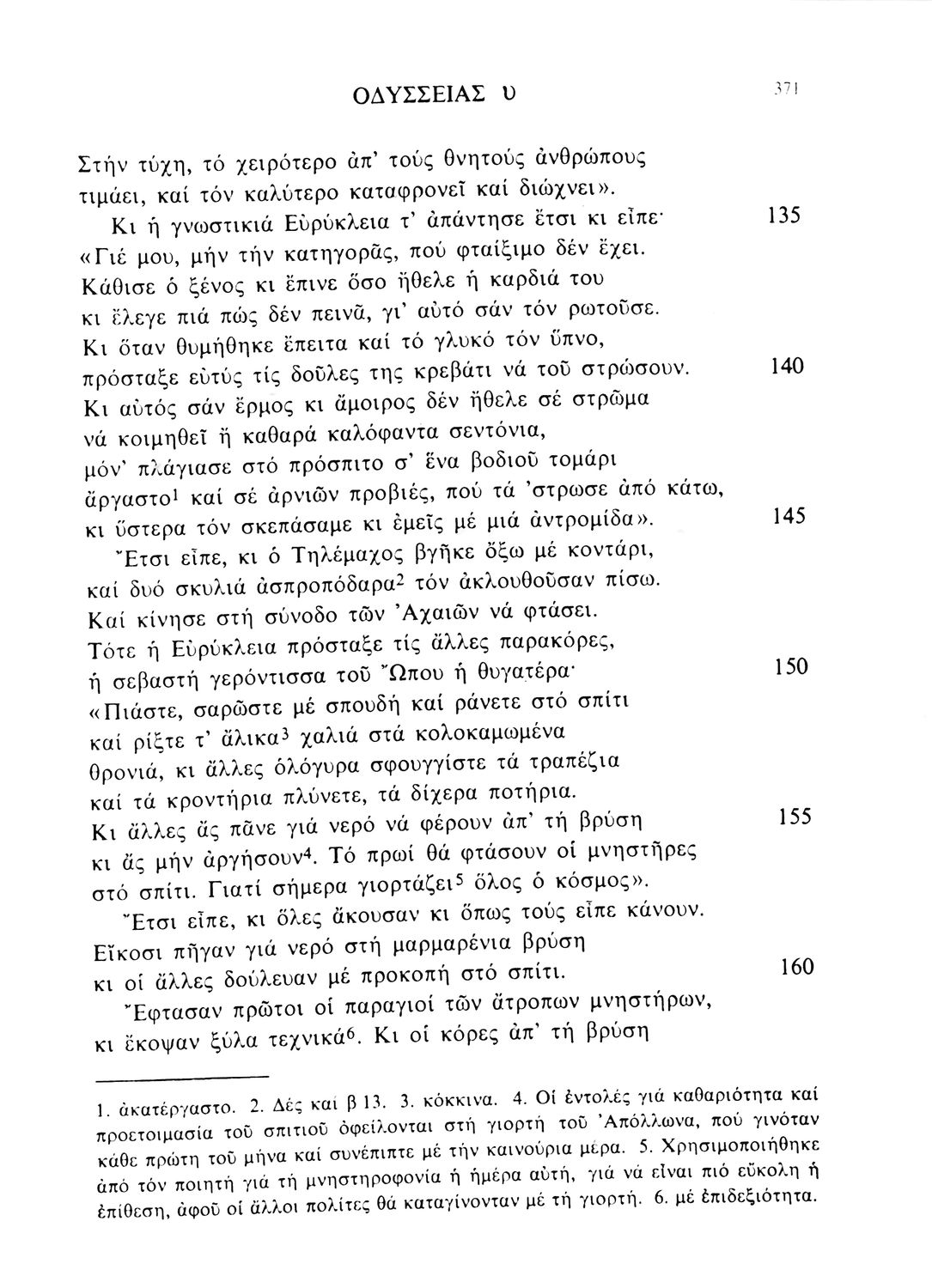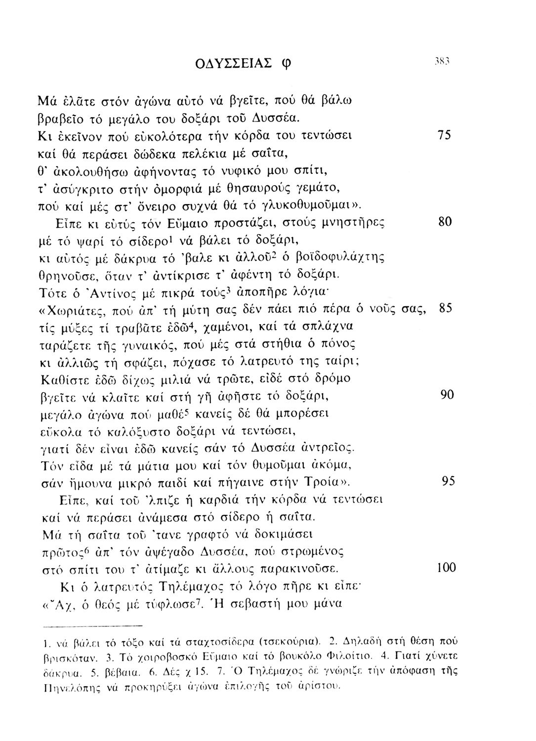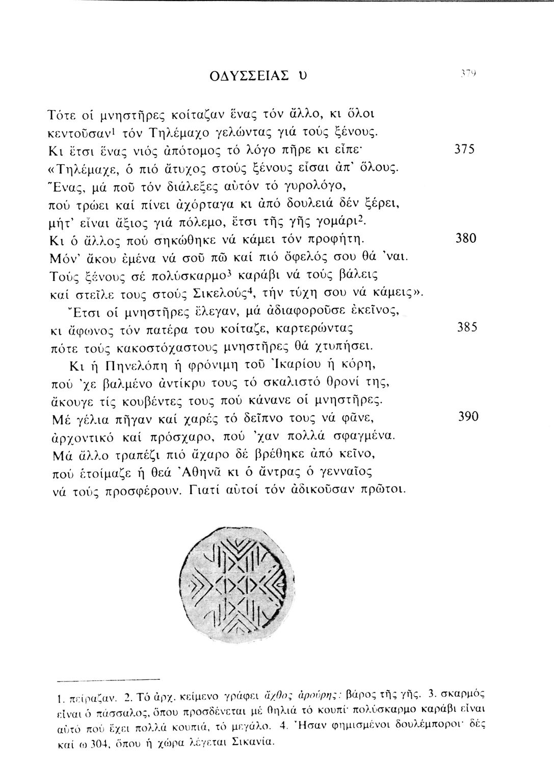 Σχολικό εγχειρίδιο Αρχαίων Ελληνικών. Το βιβλίο περιλαμβάνει εισαγωγή σχετικά με το έργο του Ομήρου, τη δομή και το περιεχόμενο της Οδύσσειας. Ακολουθεί το έπος της Οδύσσειας σε μετάφραση του Ζήσιμου Σιδέρη. Τα κείμενα συνοδεύουν ερμηνευτικές υποσημειώσεις και σχόλια. Η εισαγωγή και τα σχόλια είναι του Γεν. Επιθεωρητή Τριαντ. Ι. Δελή. Η ορθογραφική προσαρμογή της μετάφρασης έγινε από το Γεν. Επιθ. Κ. Μικρουδή.