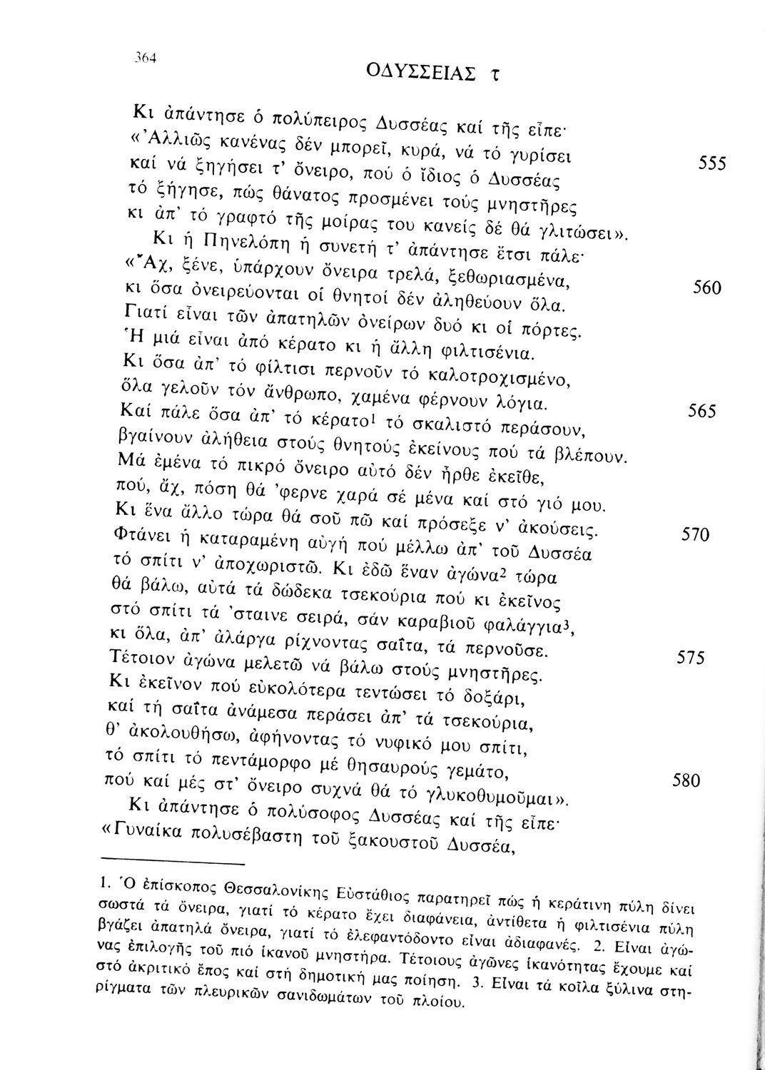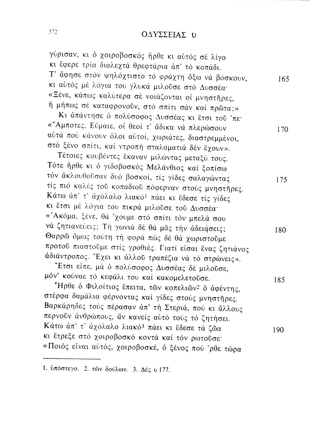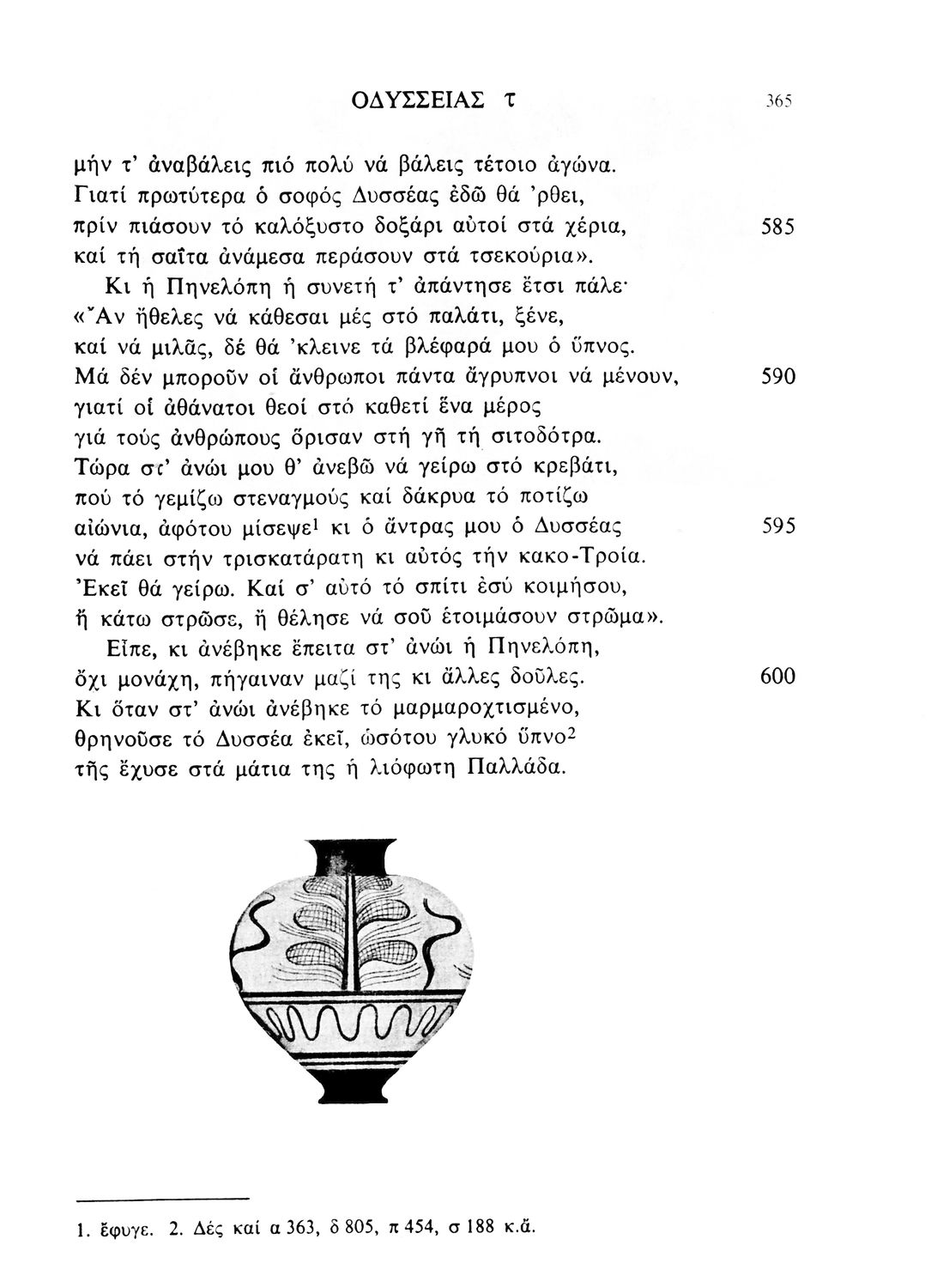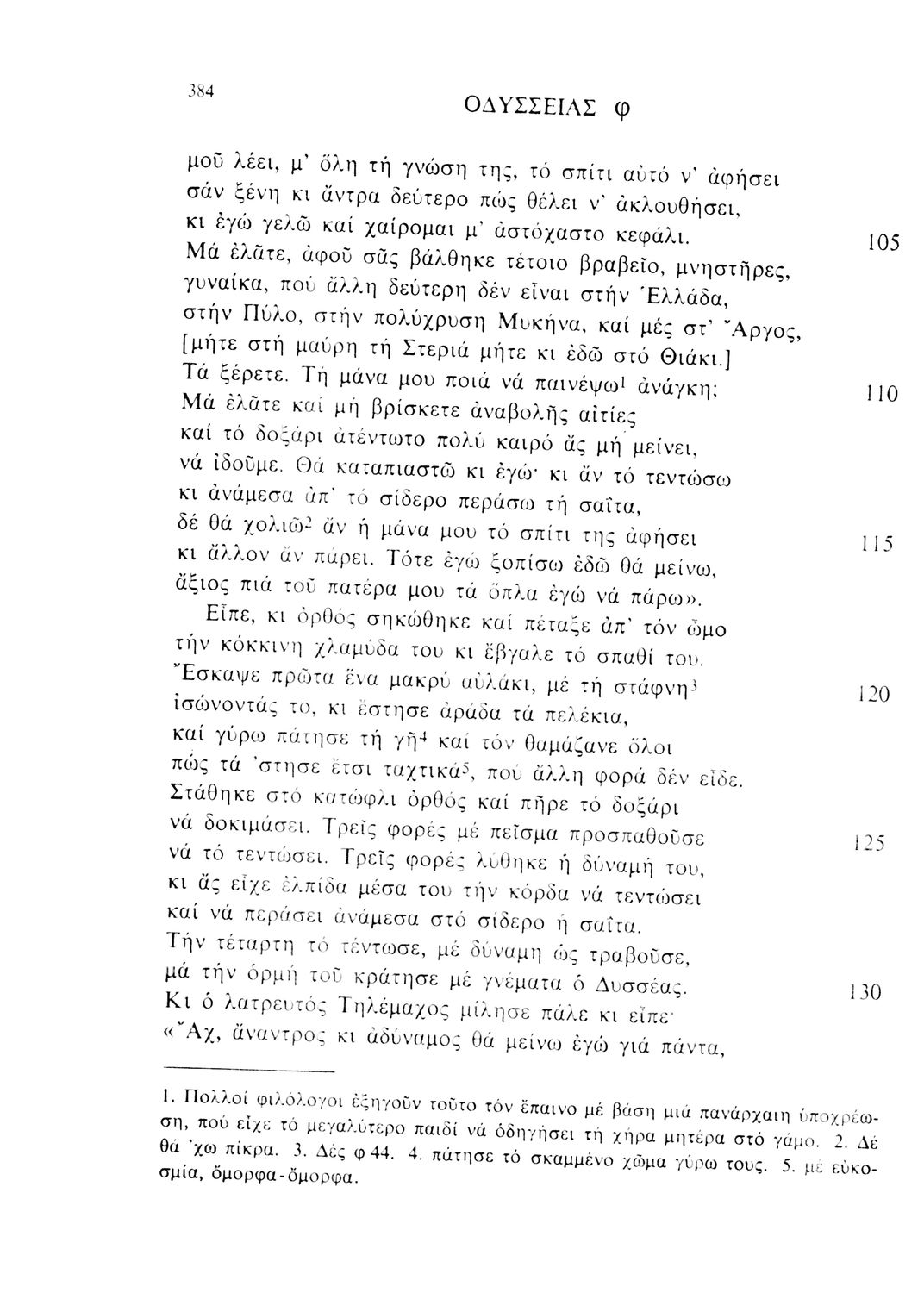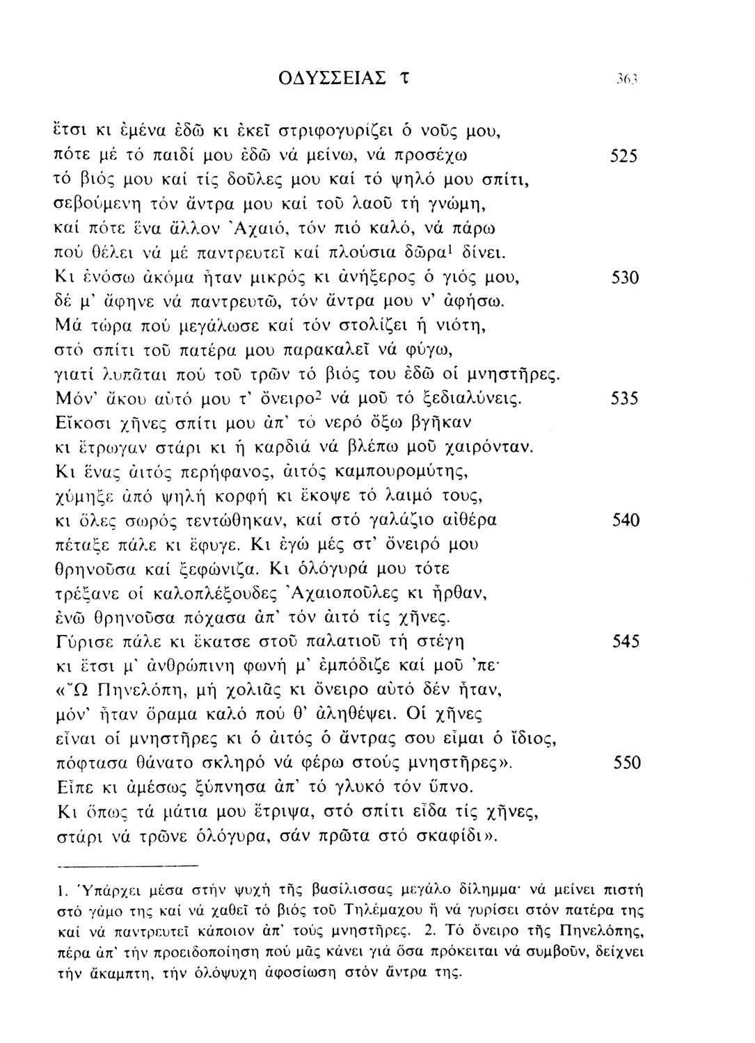 Σχολικό εγχειρίδιο Αρχαίων Ελληνικών. Το βιβλίο περιλαμβάνει εισαγωγή σχετικά με το έργο του Ομήρου, τη δομή και το περιεχόμενο της Οδύσσειας. Ακολουθεί το έπος της Οδύσσειας σε μετάφραση του Ζήσιμου Σιδέρη. Τα κείμενα συνοδεύουν ερμηνευτικές υποσημειώσεις και σχόλια. Η εισαγωγή και τα σχόλια είναι του Γεν. Επιθεωρητή Τριαντ. Ι. Δελή. Η ορθογραφική προσαρμογή της μετάφρασης έγινε από το Γεν. Επιθ. Κ. Μικρουδή.