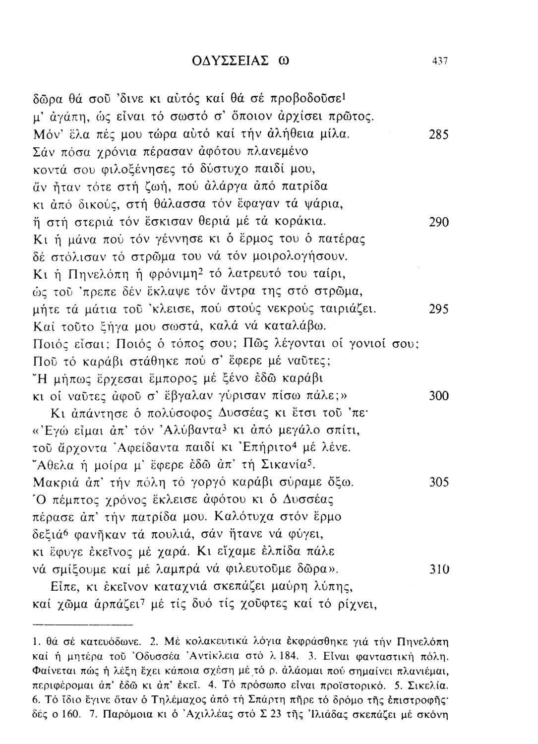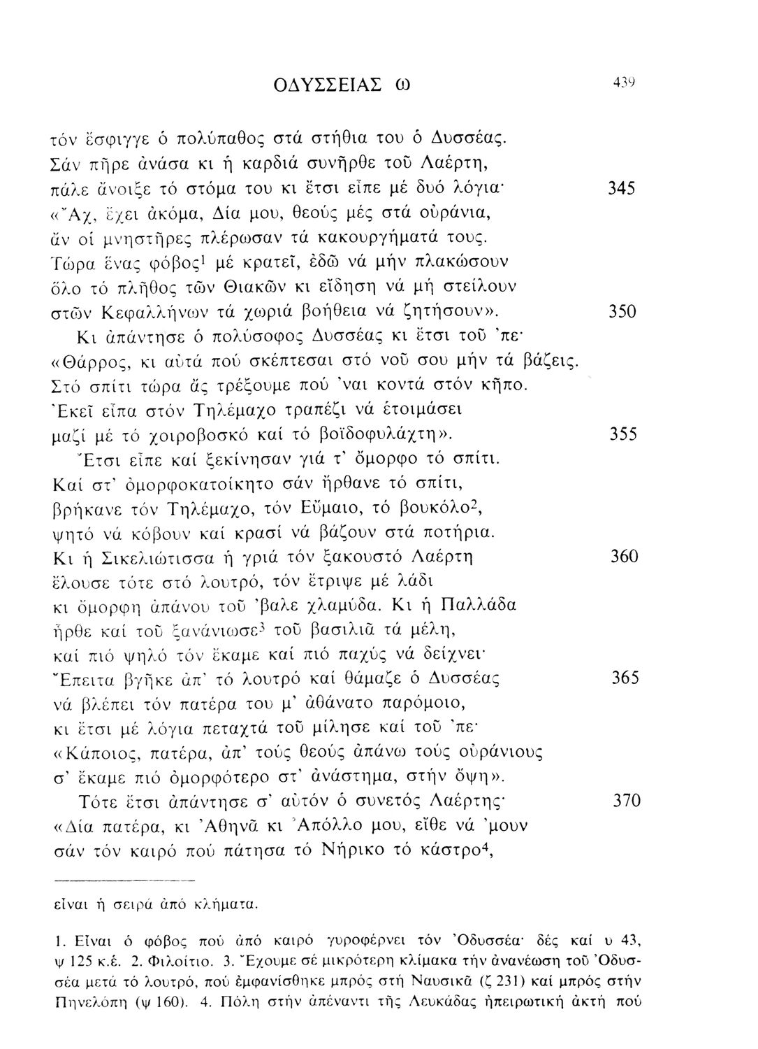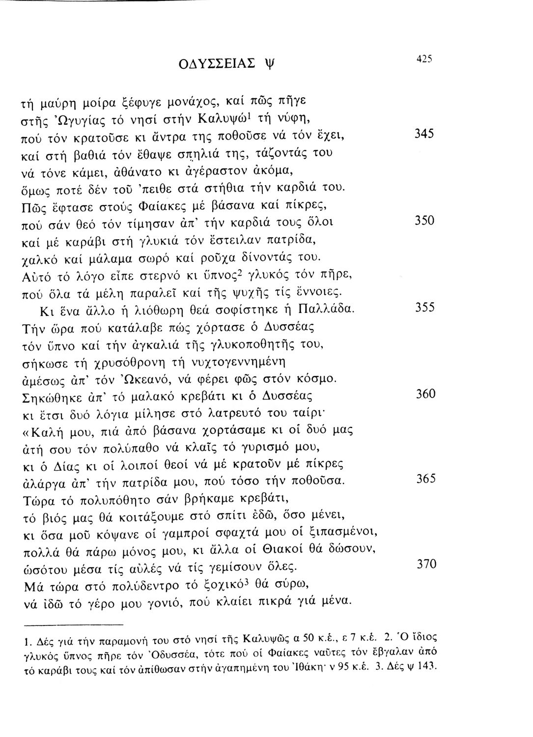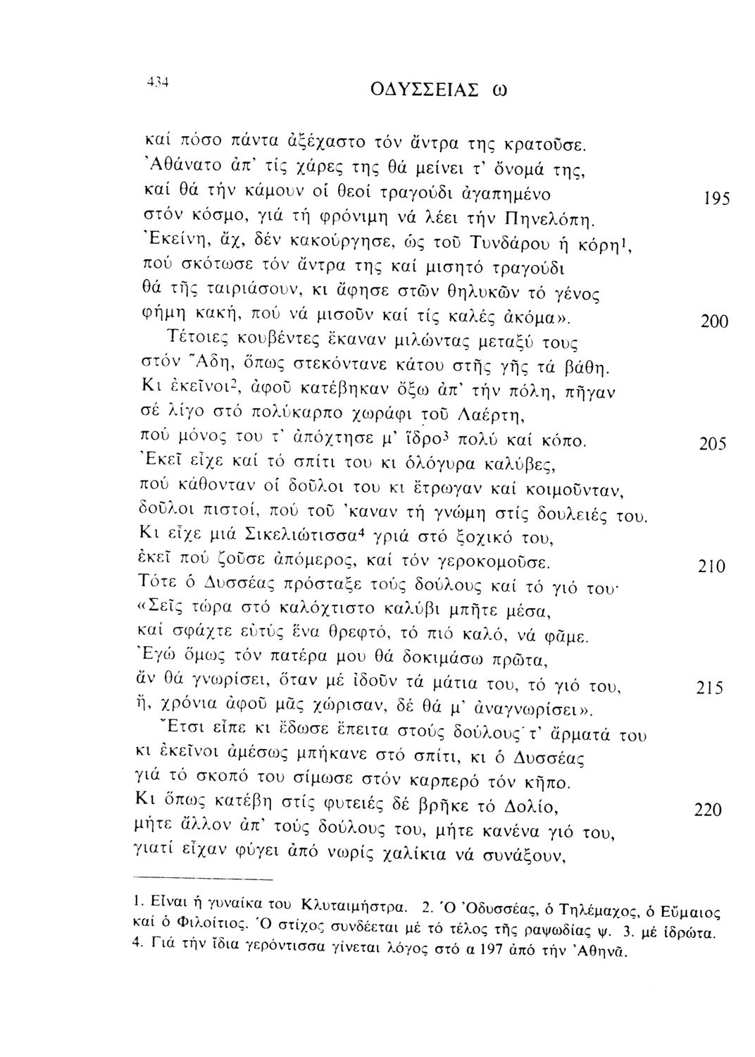 Σχολικό εγχειρίδιο Αρχαίων Ελληνικών. Το βιβλίο περιλαμβάνει εισαγωγή σχετικά με το έργο του Ομήρου, τη δομή και το περιεχόμενο της Οδύσσειας. Ακολουθεί το έπος της Οδύσσειας σε μετάφραση του Ζήσιμου Σιδέρη. Τα κείμενα συνοδεύουν ερμηνευτικές υποσημειώσεις και σχόλια. Η εισαγωγή και τα σχόλια είναι του Γεν. Επιθεωρητή Τριαντ. Ι. Δελή. Η ορθογραφική προσαρμογή της μετάφρασης έγινε από το Γεν. Επιθ. Κ. Μικρουδή.
