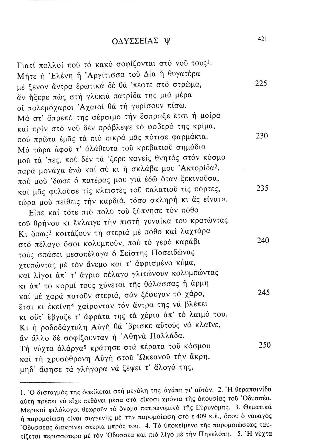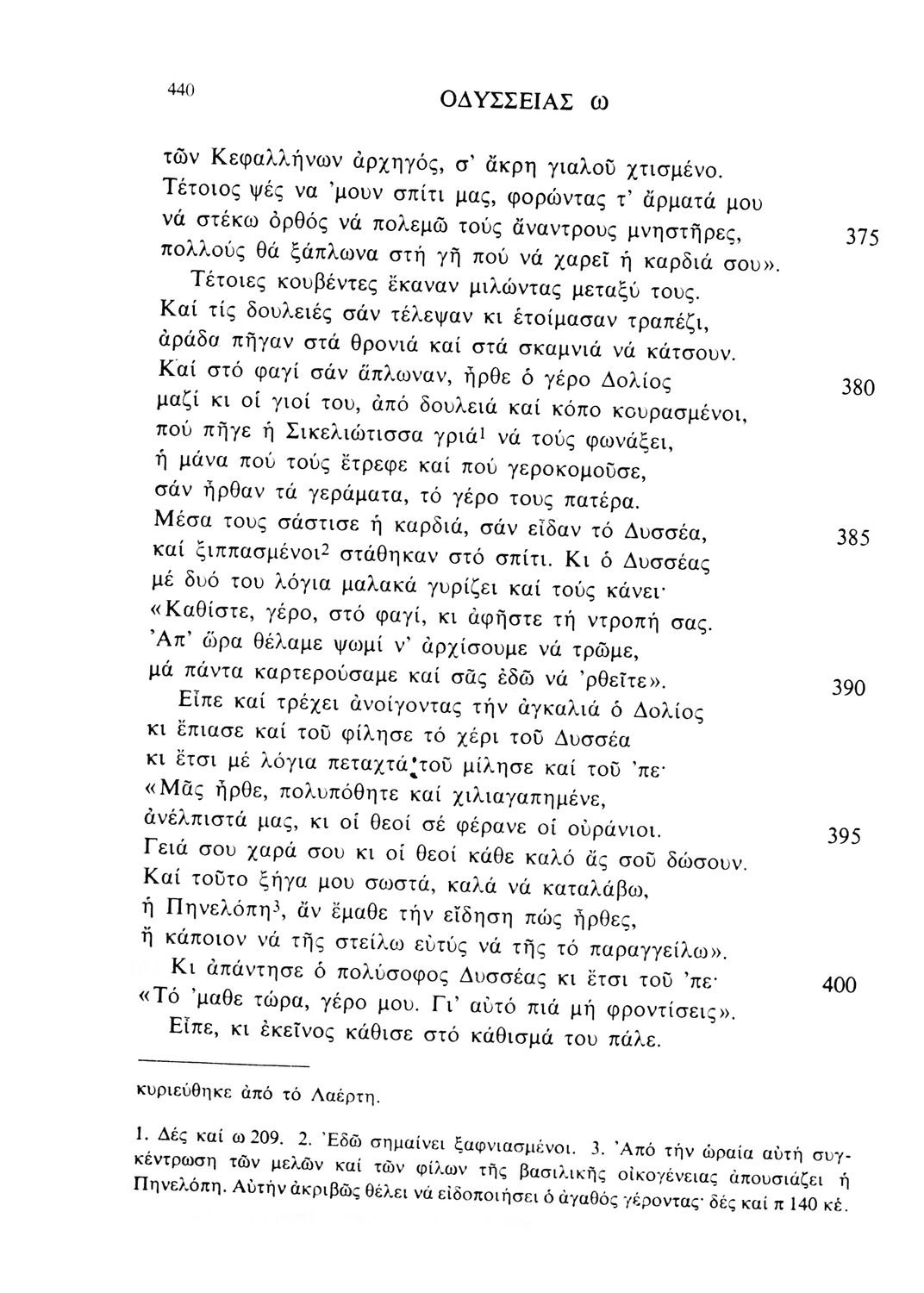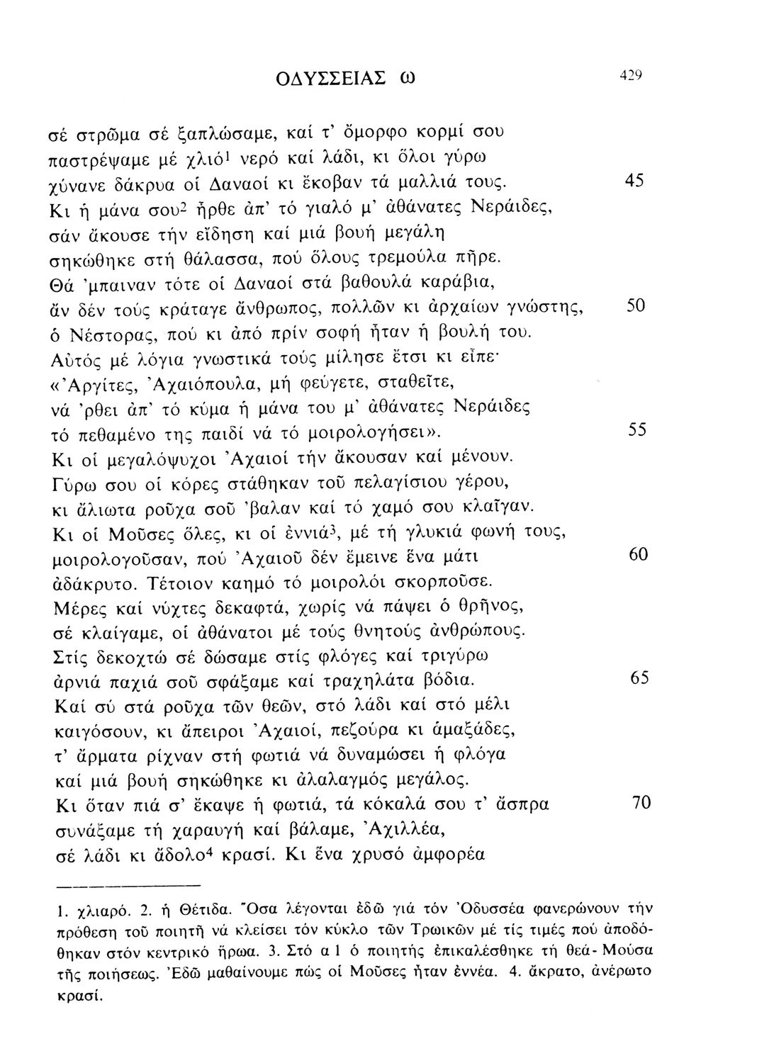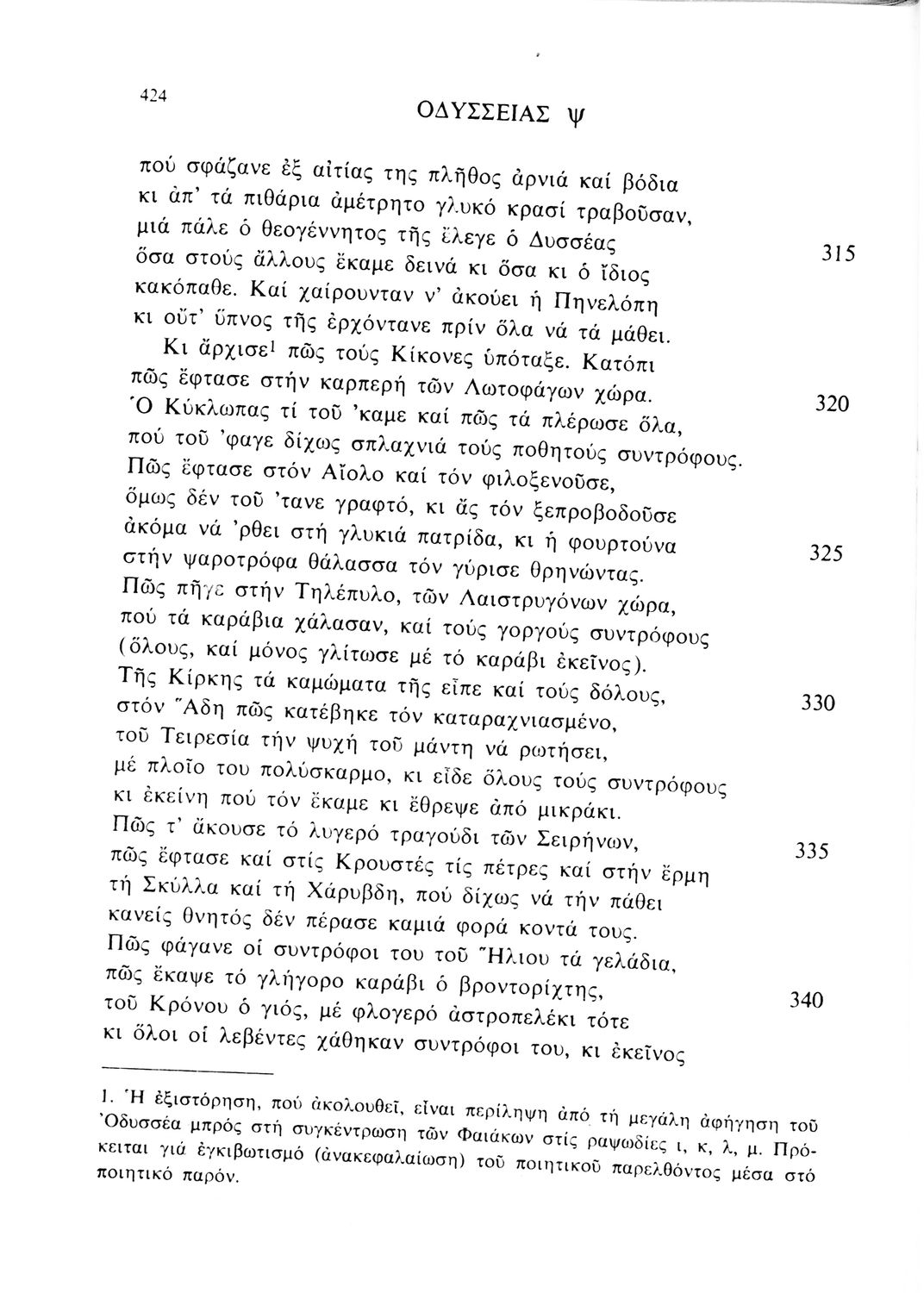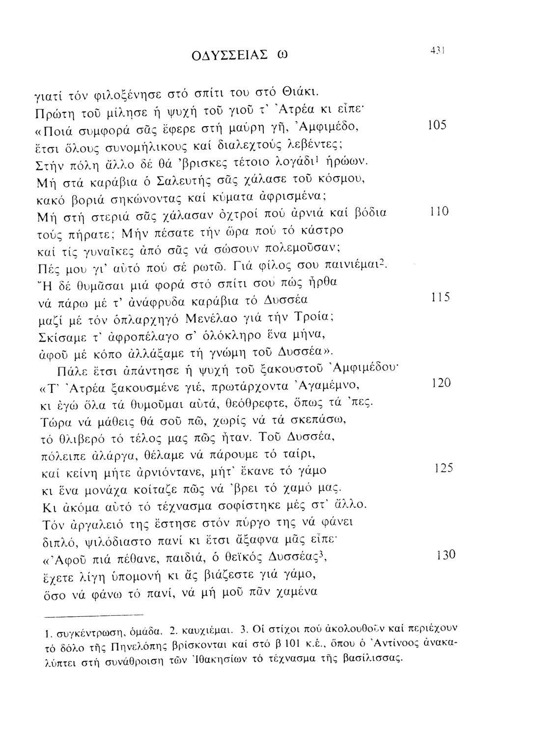 Σχολικό εγχειρίδιο Αρχαίων Ελληνικών. Το βιβλίο περιλαμβάνει εισαγωγή σχετικά με το έργο του Ομήρου, τη δομή και το περιεχόμενο της Οδύσσειας. Ακολουθεί το έπος της Οδύσσειας σε μετάφραση του Ζήσιμου Σιδέρη. Τα κείμενα συνοδεύουν ερμηνευτικές υποσημειώσεις και σχόλια. Η εισαγωγή και τα σχόλια είναι του Γεν. Επιθεωρητή Τριαντ. Ι. Δελή. Η ορθογραφική προσαρμογή της μετάφρασης έγινε από το Γεν. Επιθ. Κ. Μικρουδή.