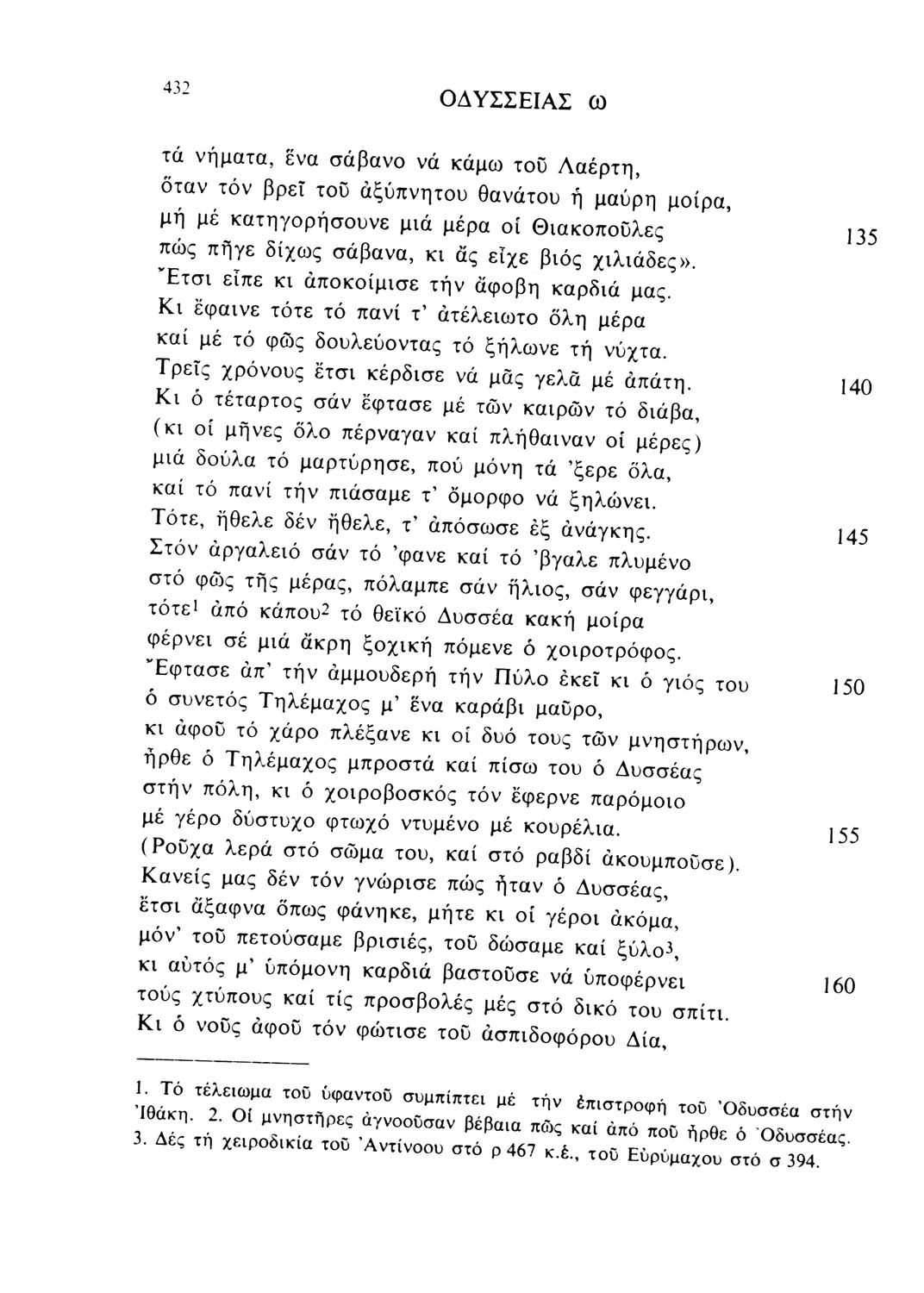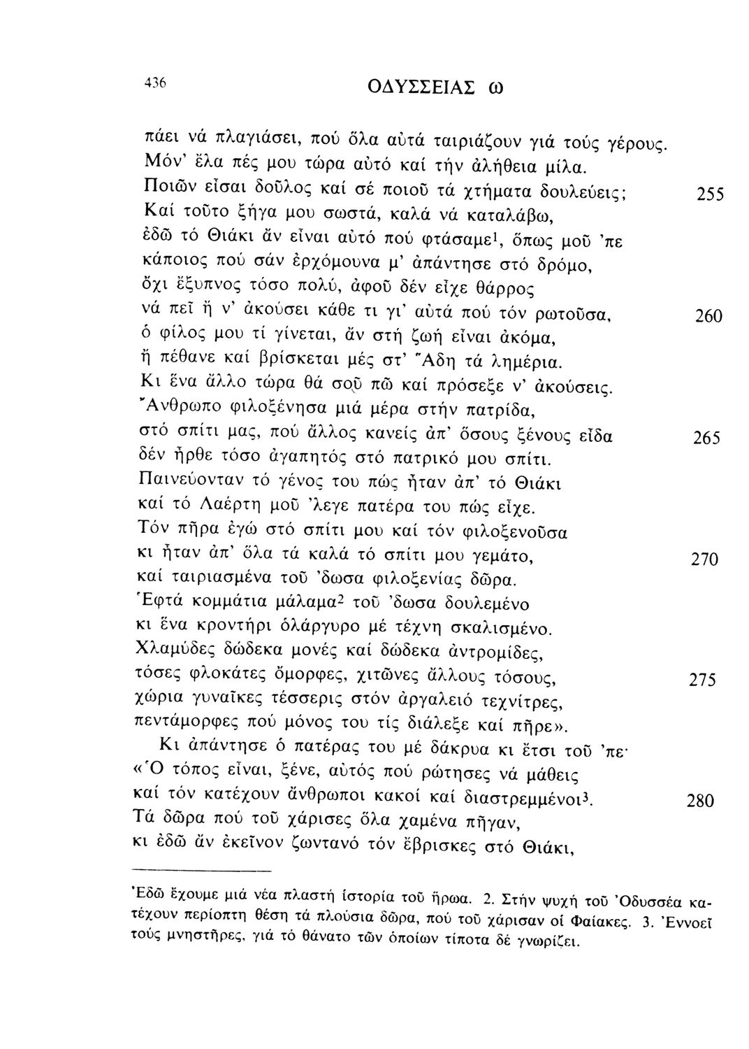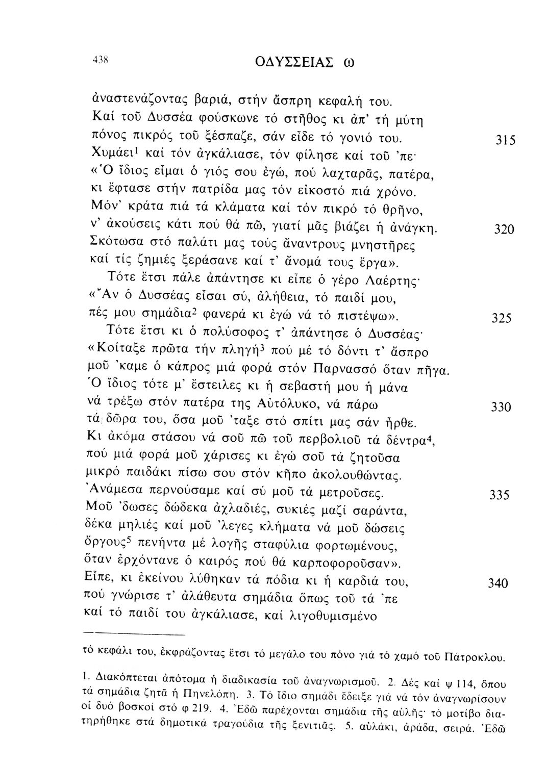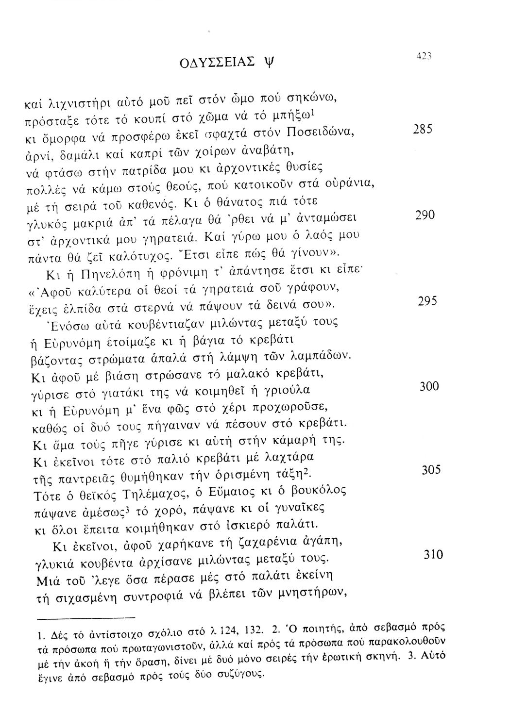 Σχολικό εγχειρίδιο Αρχαίων Ελληνικών. Το βιβλίο περιλαμβάνει εισαγωγή σχετικά με το έργο του Ομήρου, τη δομή και το περιεχόμενο της Οδύσσειας. Ακολουθεί το έπος της Οδύσσειας σε μετάφραση του Ζήσιμου Σιδέρη. Τα κείμενα συνοδεύουν ερμηνευτικές υποσημειώσεις και σχόλια. Η εισαγωγή και τα σχόλια είναι του Γεν. Επιθεωρητή Τριαντ. Ι. Δελή. Η ορθογραφική προσαρμογή της μετάφρασης έγινε από το Γεν. Επιθ. Κ. Μικρουδή.