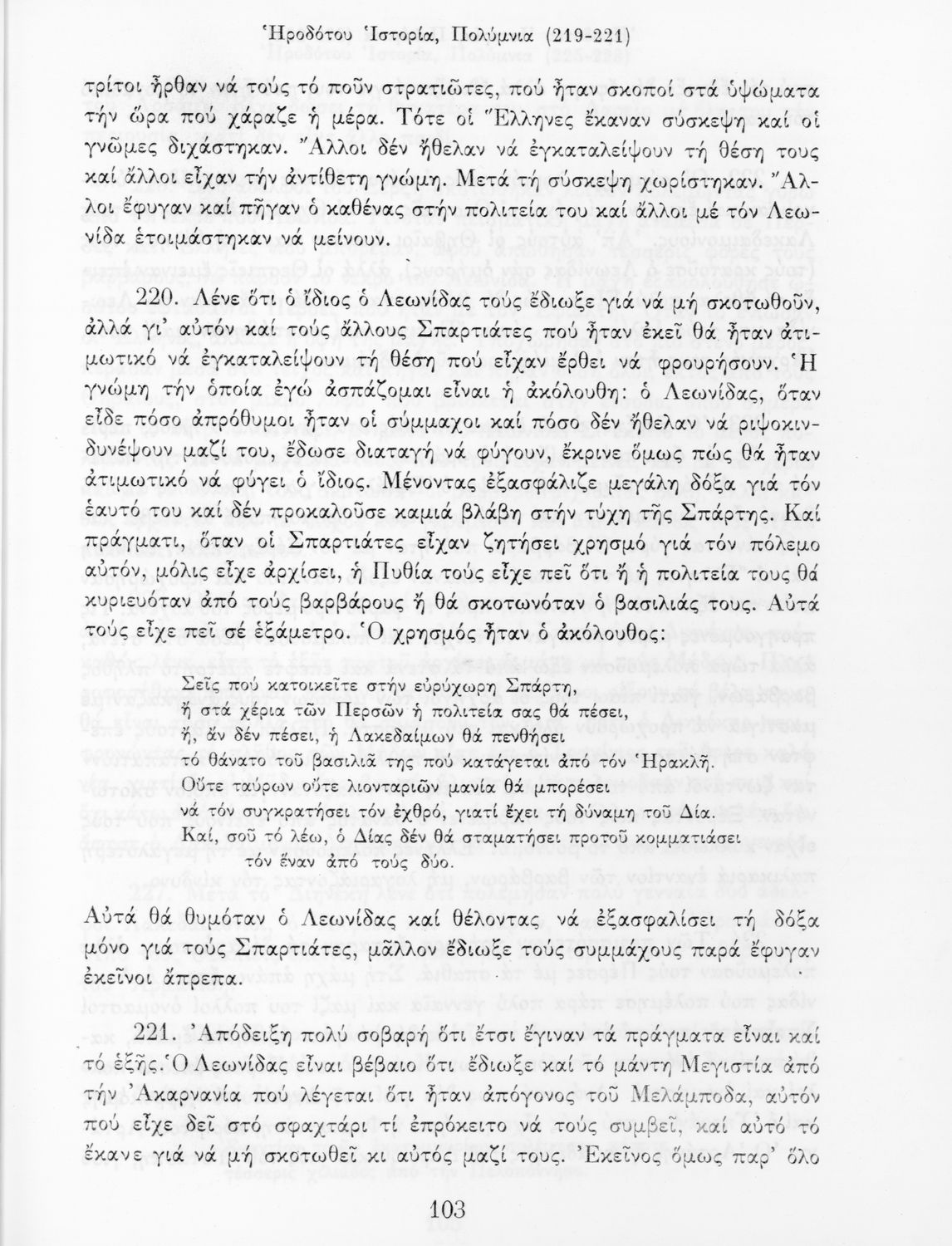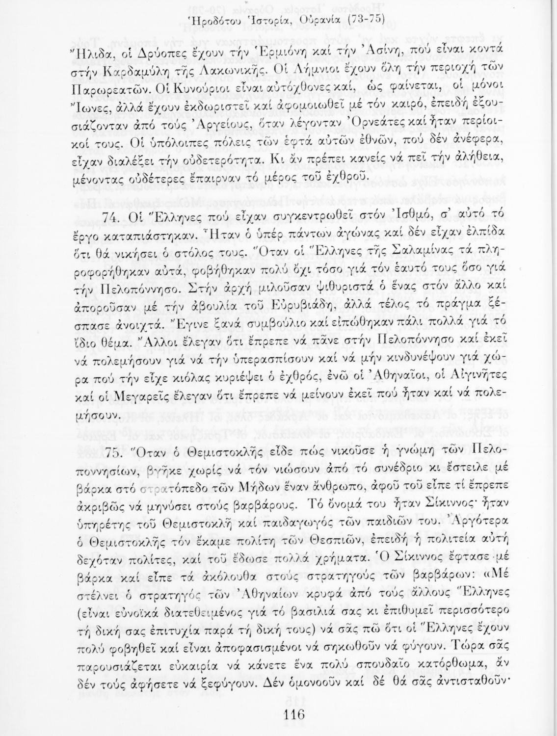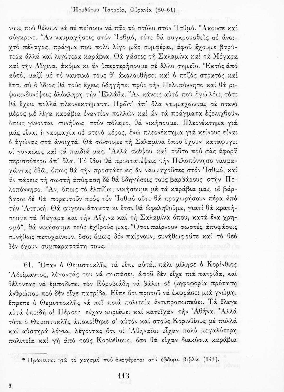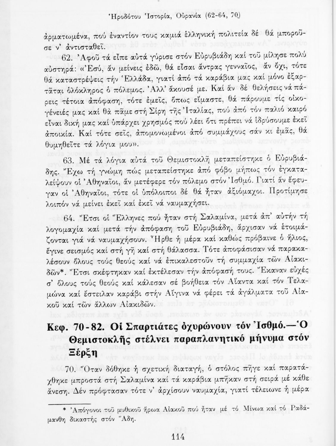 Σχολικό εγχειρίδιο Αρχαίων Ελληνικών Α΄ Γυμνασίου που περιλαμβάνει αποσπάσματα από την Ιστορία του Ηρόδοτου σε μετάφραση, εισαγωγή στη ζωή, το έργο και τη διάλεκτό του και ερμηνευτικά και πραγματολογικά σχόλια.