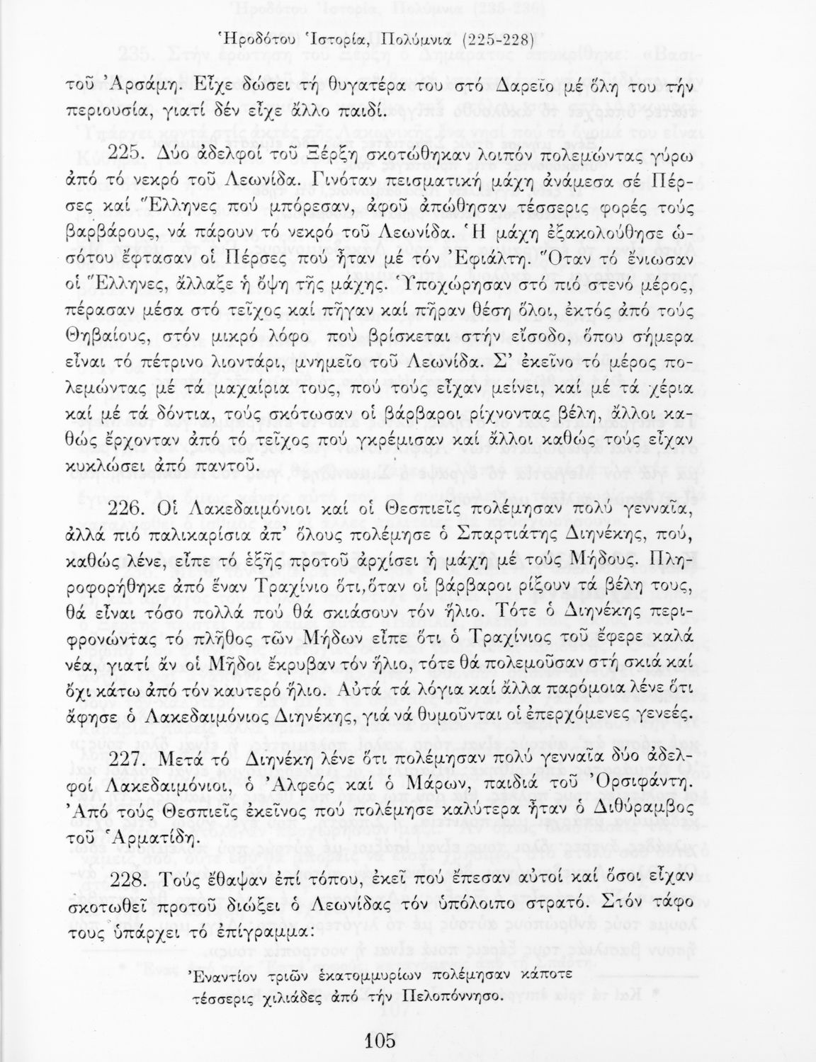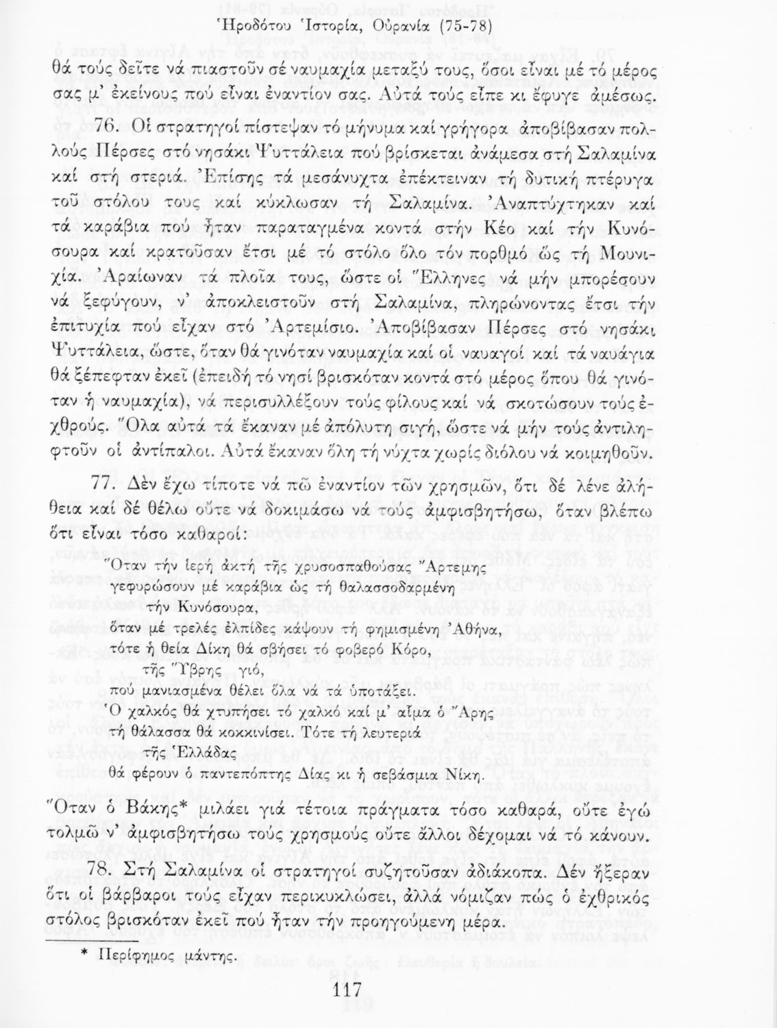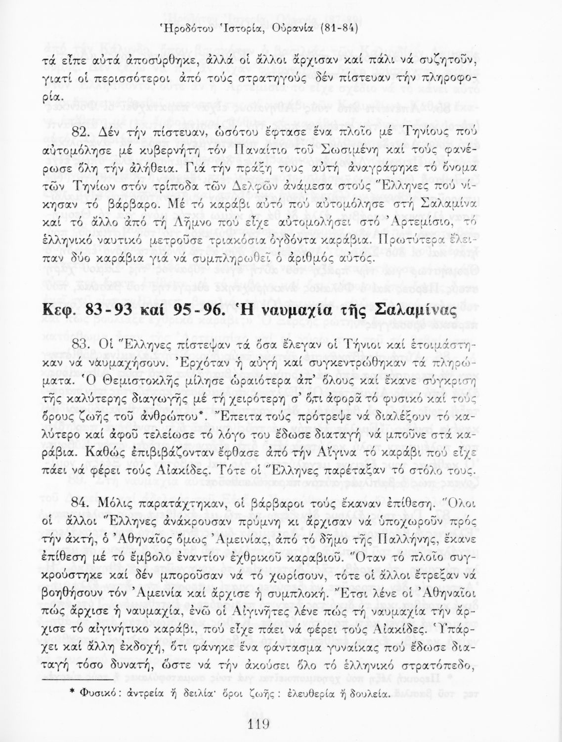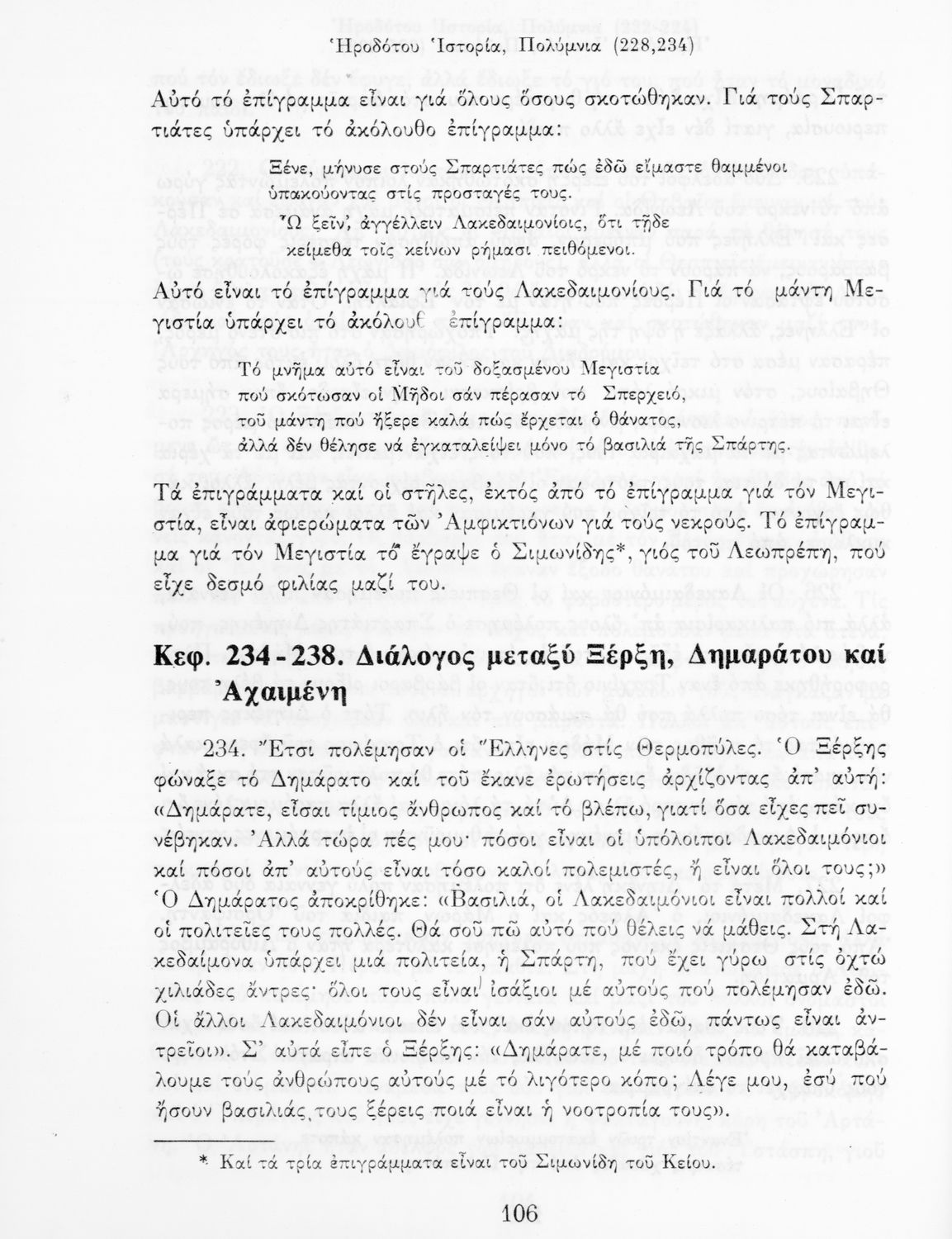 Σχολικό εγχειρίδιο Αρχαίων Ελληνικών Α΄ Γυμνασίου που περιλαμβάνει αποσπάσματα από την Ιστορία του Ηρόδοτου σε μετάφραση, εισαγωγή στη ζωή, το έργο και τη διάλεκτό του και ερμηνευτικά και πραγματολογικά σχόλια.