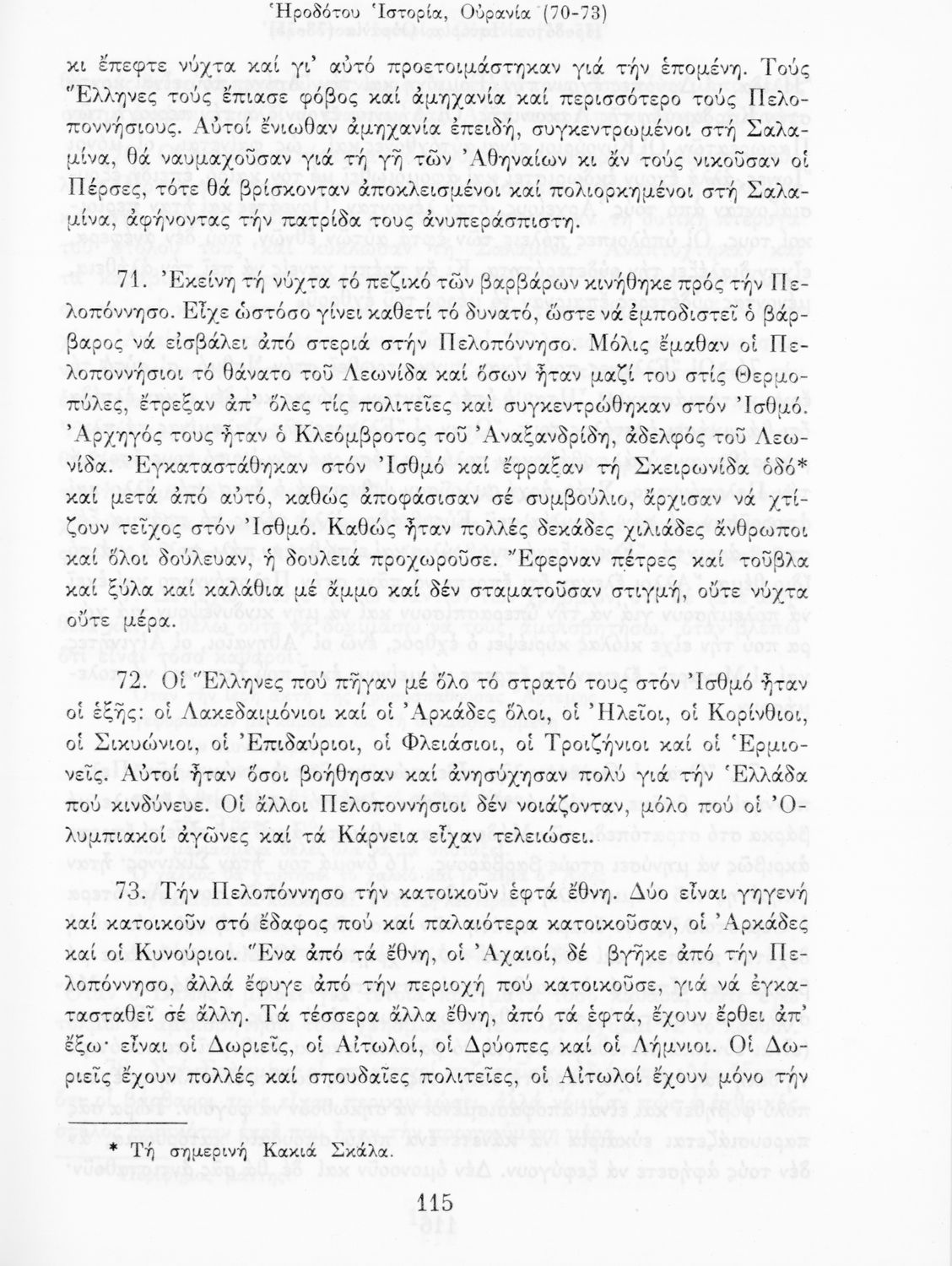 Σχολικό εγχειρίδιο Αρχαίων Ελληνικών Α΄ Γυμνασίου που περιλαμβάνει εισαγωγή στη ζωή και το έργο του Ηρόδοτου, και αποσπάσματα από τα 9 βιβλία της Ιστορίας του σε μετάφραση. Φέρει το σύμβολο της δικτατορίας.