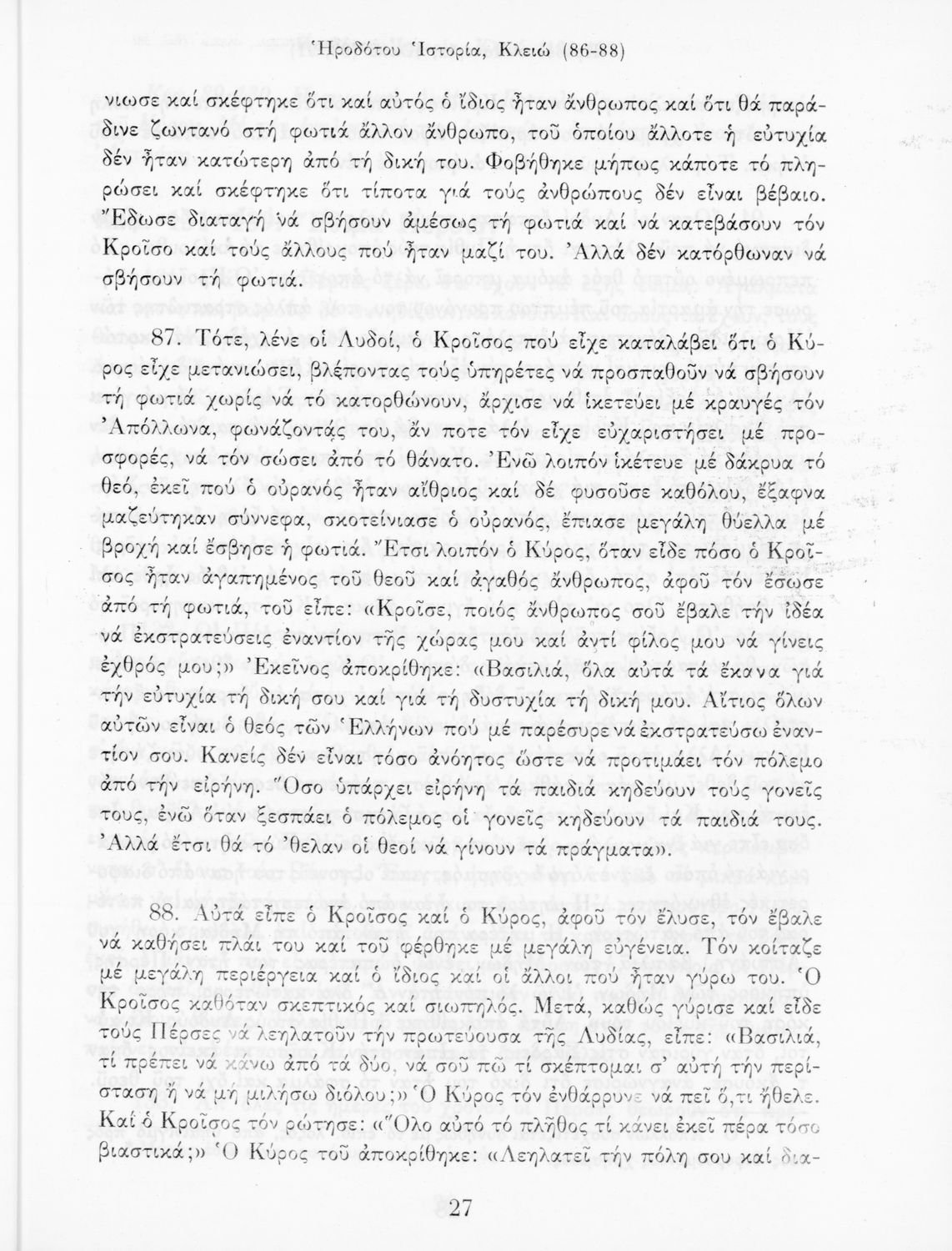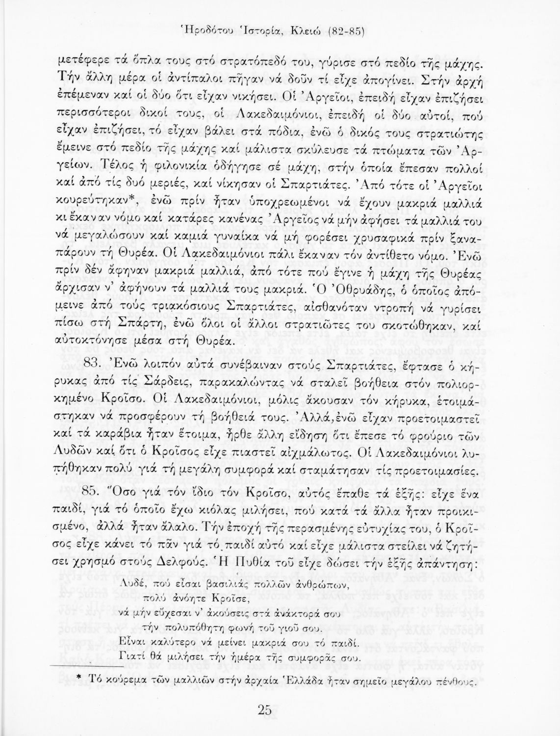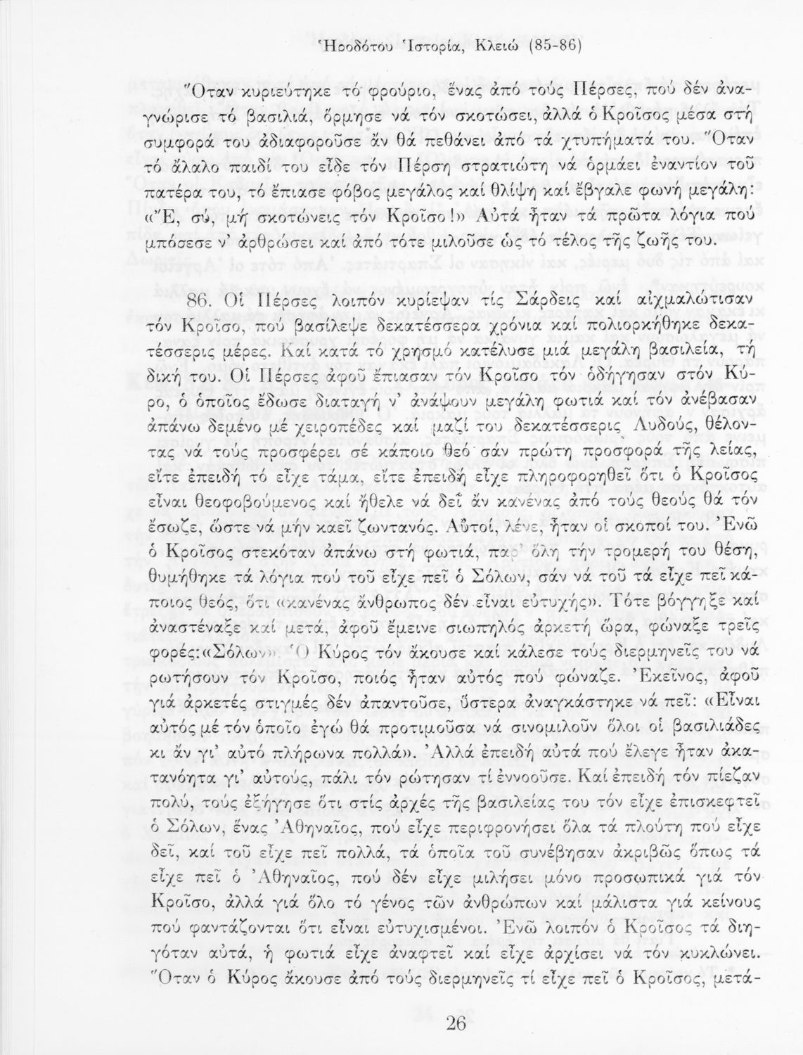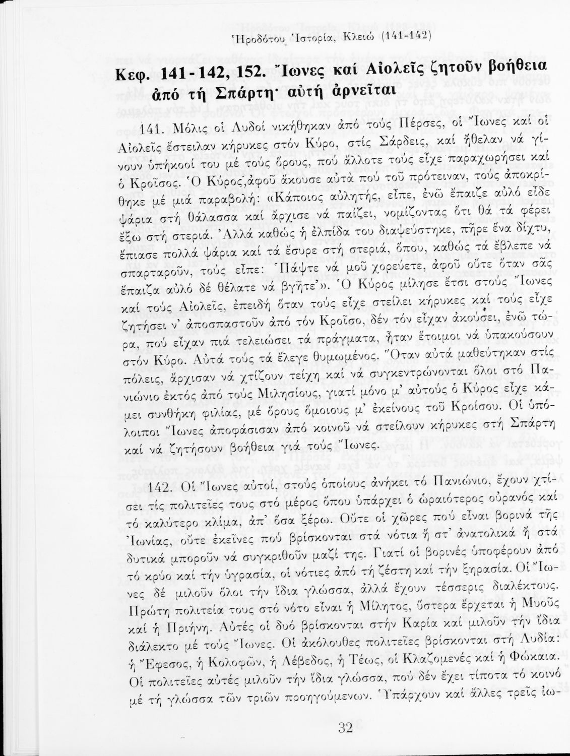 Σχολικό εγχειρίδιο Αρχαίων Ελληνικών Α΄ Γυμνασίου που περιλαμβάνει αποσπάσματα από την Ιστορία του Ηρόδοτου σε μετάφραση, εισαγωγή στη ζωή, το έργο και τη διάλεκτό του και ερμηνευτικά και πραγματολογικά σχόλια.