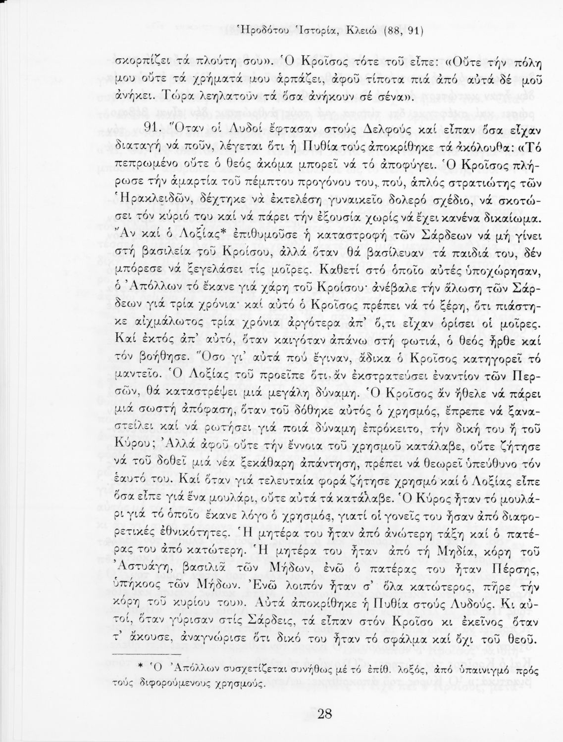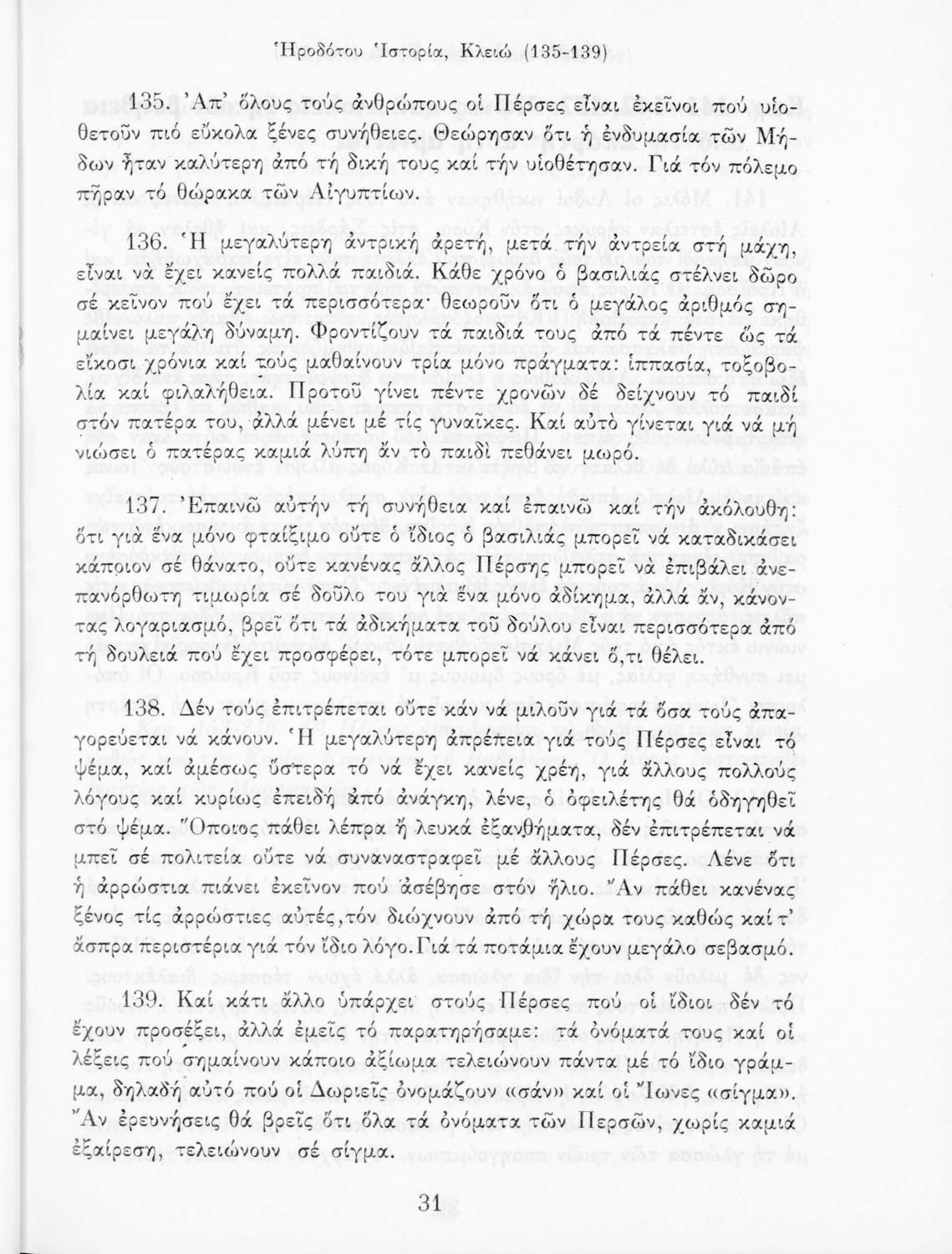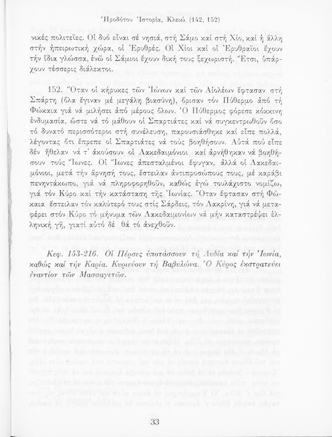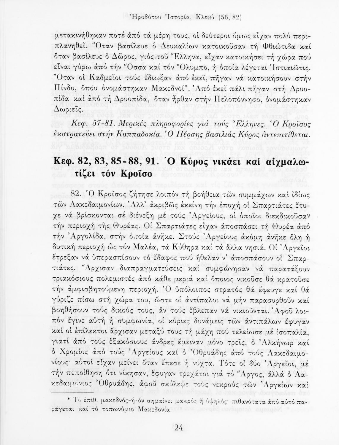 Σχολικό εγχειρίδιο Αρχαίων Ελληνικών Α΄ Γυμνασίου που περιλαμβάνει αποσπάσματα από την Ιστορία του Ηρόδοτου σε μετάφραση, εισαγωγή στη ζωή, το έργο και τη διάλεκτό του και ερμηνευτικά και πραγματολογικά σχόλια.