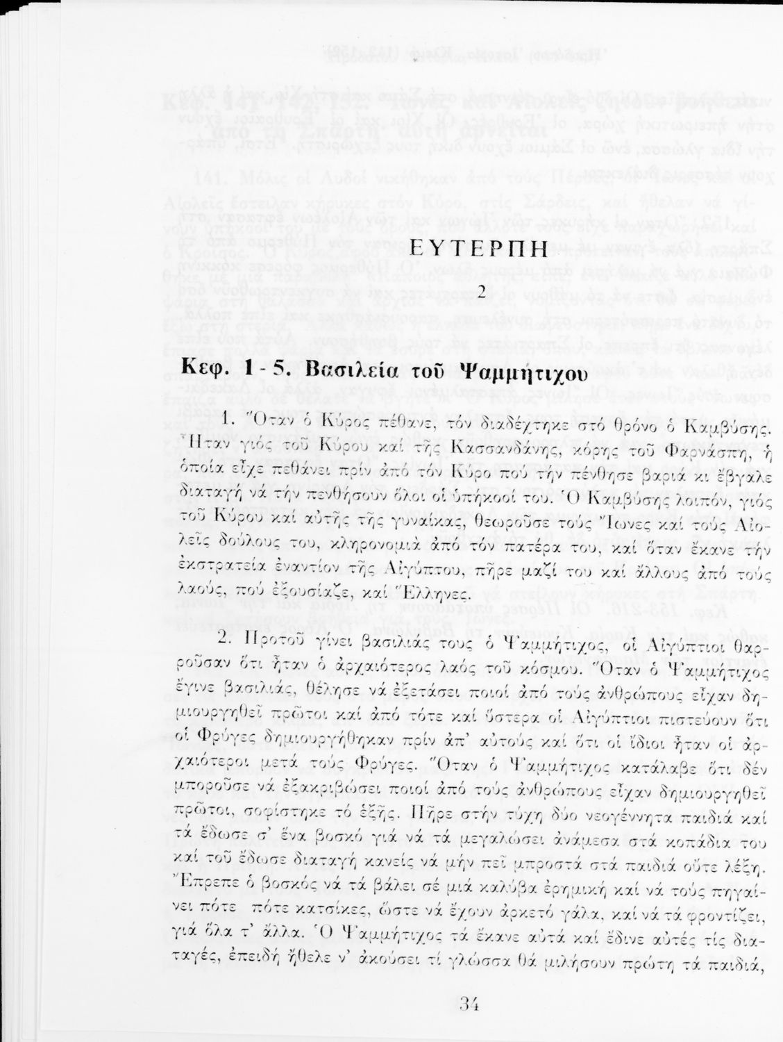 Σχολικό εγχειρίδιο Αρχαίων Ελληνικών Α΄ Γυμνασίου που περιλαμβάνει εισαγωγή στη ζωή και το έργο του Ηρόδοτου, και αποσπάσματα από τα 9 βιβλία της Ιστορίας του σε μετάφραση. Φέρει το σύμβολο της δικτατορίας.