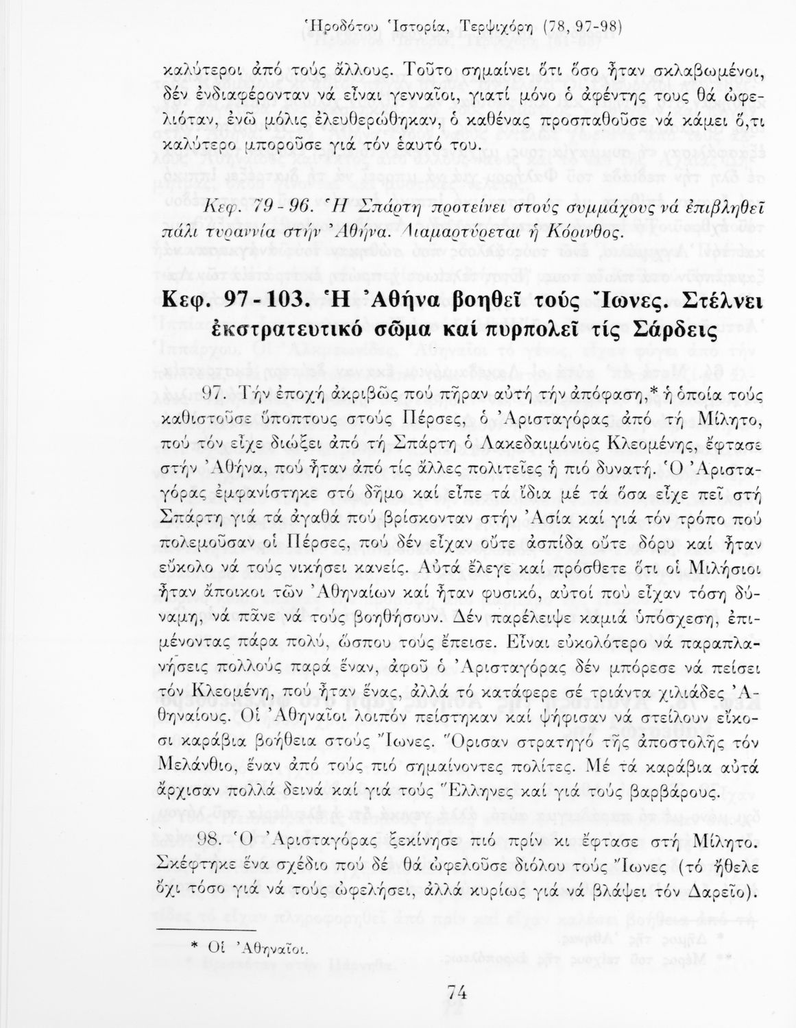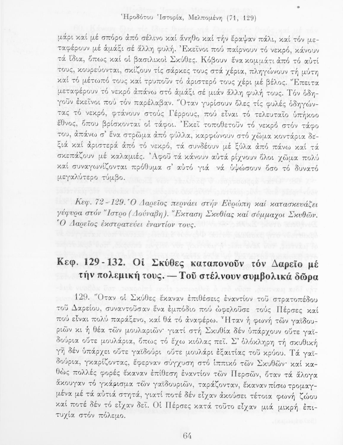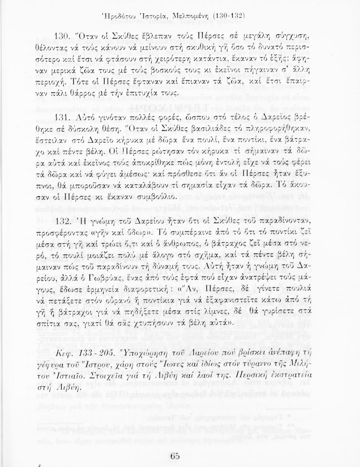 Σχολικό εγχειρίδιο Αρχαίων Ελληνικών Α΄ Γυμνασίου που περιλαμβάνει αποσπάσματα από την Ιστορία του Ηρόδοτου σε μετάφραση, εισαγωγή στη ζωή, το έργο και τη διάλεκτό του και ερμηνευτικά και πραγματολογικά σχόλια.