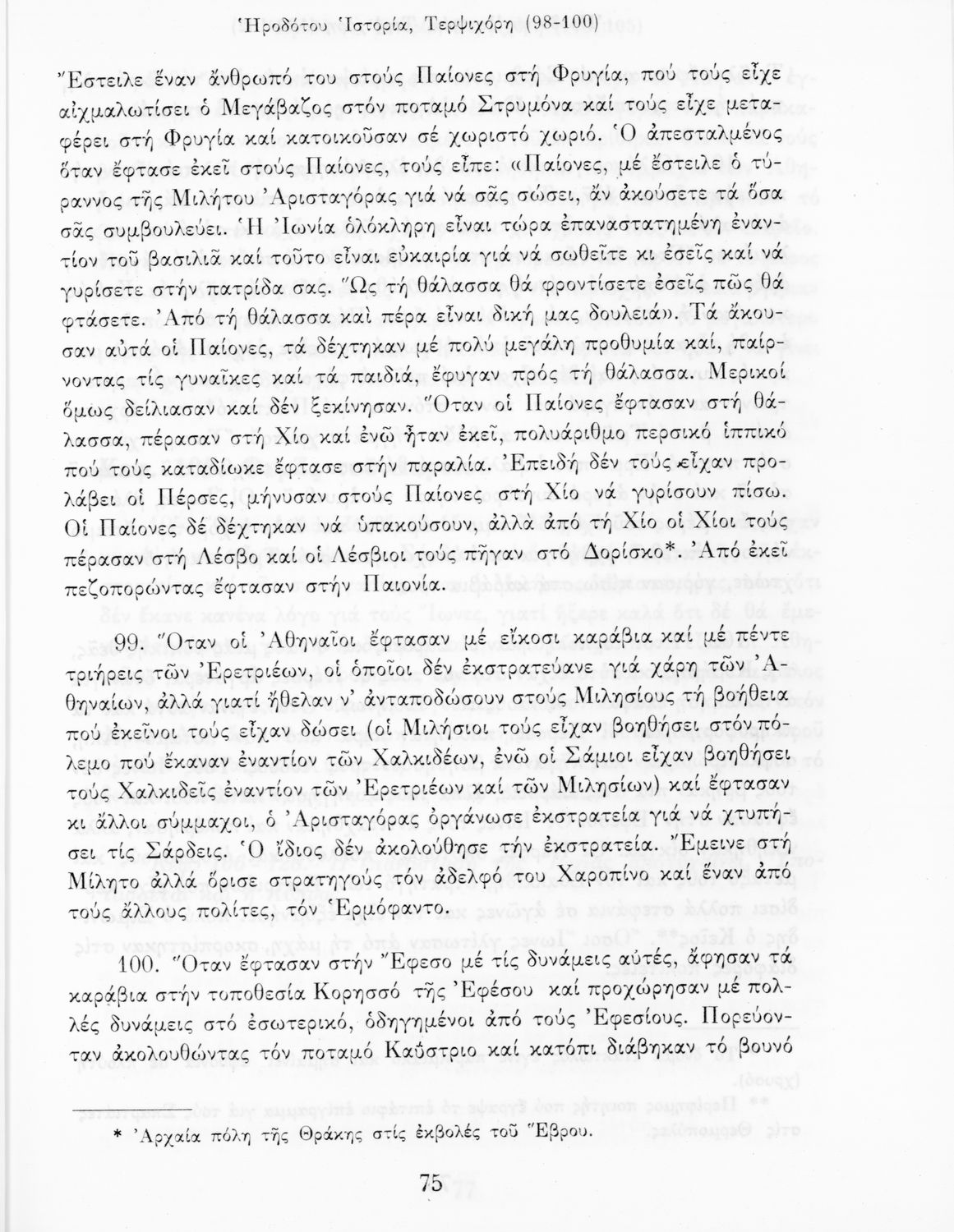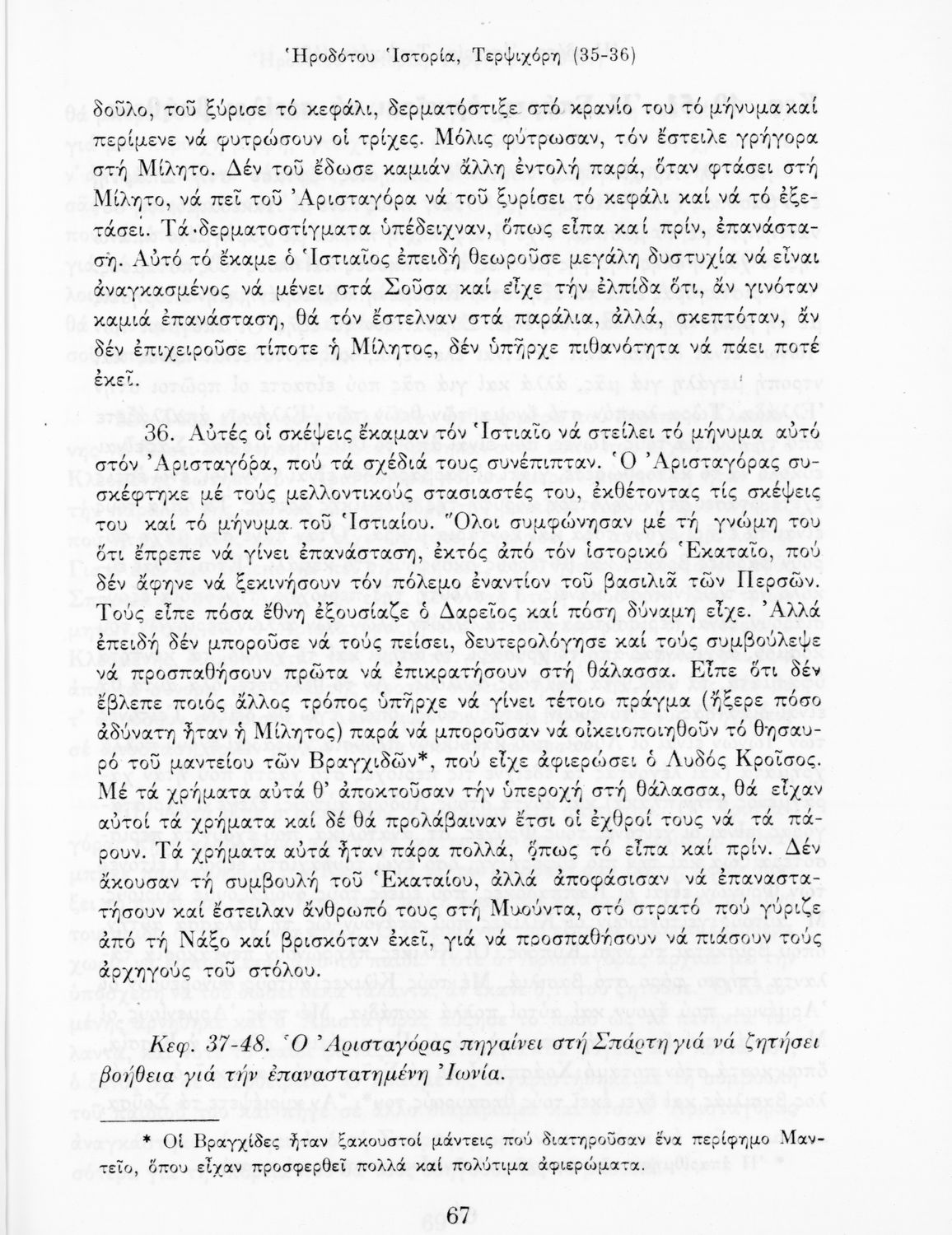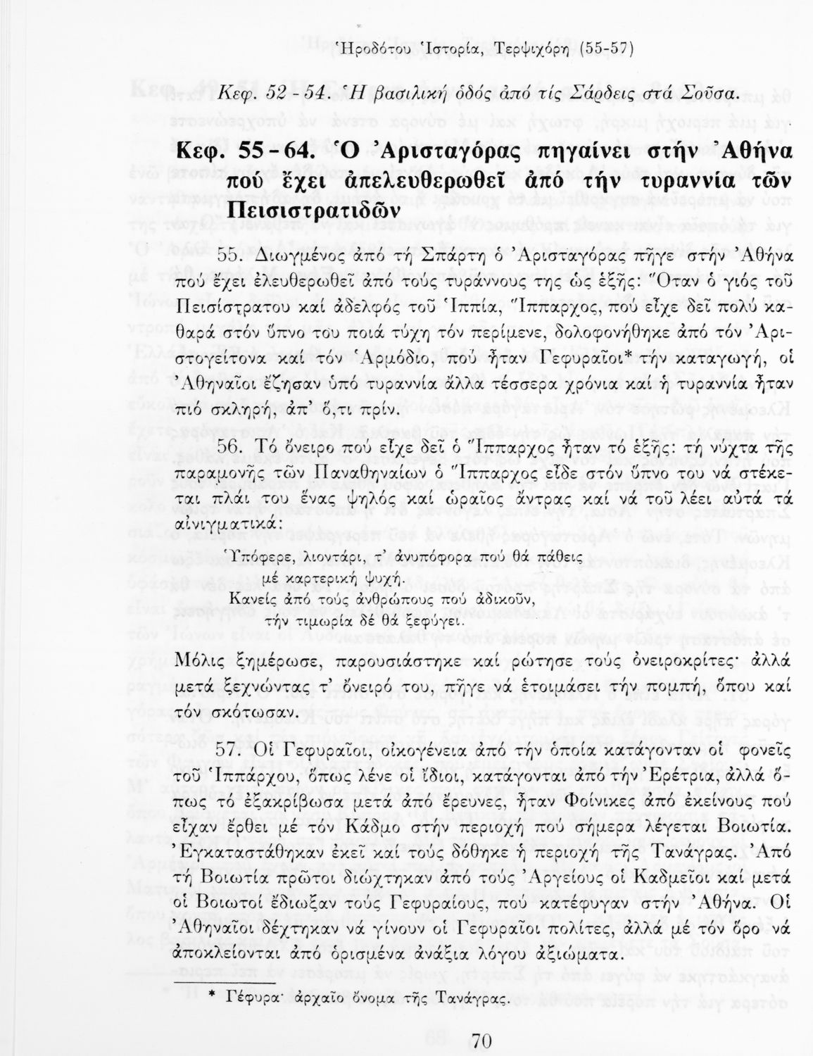 Σχολικό εγχειρίδιο Αρχαίων Ελληνικών Α΄ Γυμνασίου που περιλαμβάνει αποσπάσματα από την Ιστορία του Ηρόδοτου σε μετάφραση, εισαγωγή στη ζωή, το έργο και τη διάλεκτό του και ερμηνευτικά και πραγματολογικά σχόλια.