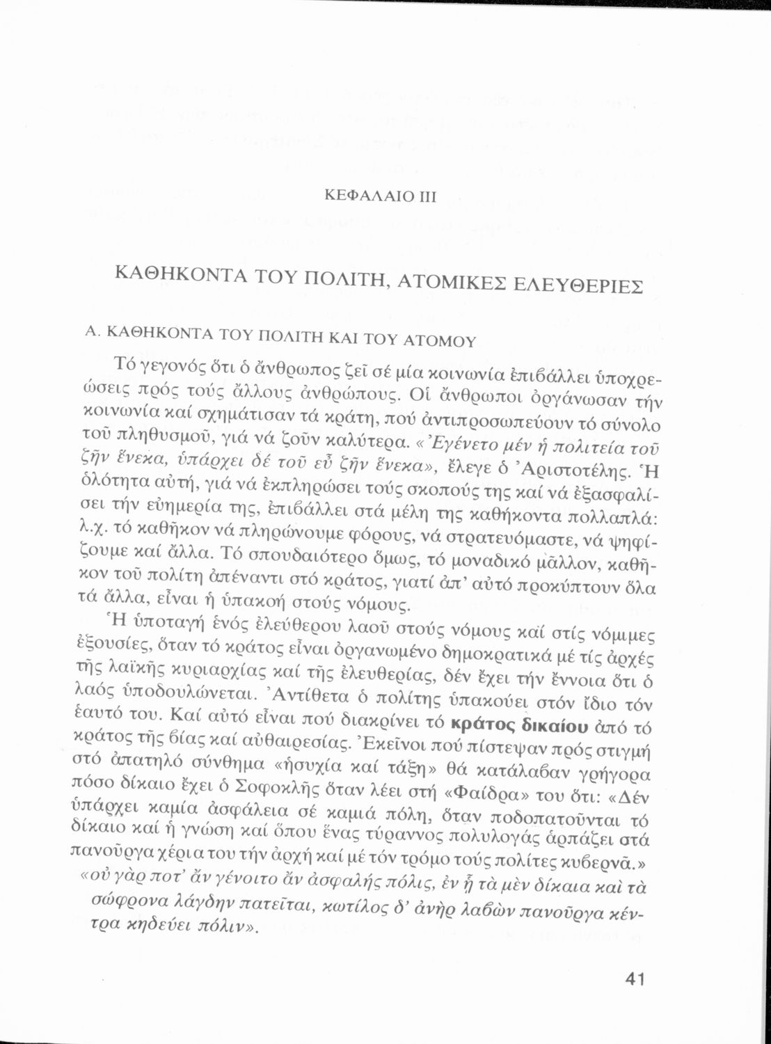 Βαθμίδα εκπαίδευσης: Δευτεροβάθμια Τάξη: Γ' Λυκείου Μάθημα: Αγωγή Του Πολίτη Γλώσσα: Δημοτική Παρουσίαση περιεχομένου: Σχολικό εγχειρίδιο Αγωγής του Πολίτη ΣΤ΄ Γυμνασίου που πραγματεύεται θέματα κρατικής οργάνωσης, θεσμών και δημοσιονομικής πολιτικής και παρουσιάζει τα πολιτεύματα, τη διάκριση των εξουσιών και τη λειτουργία του συντάγματος. |