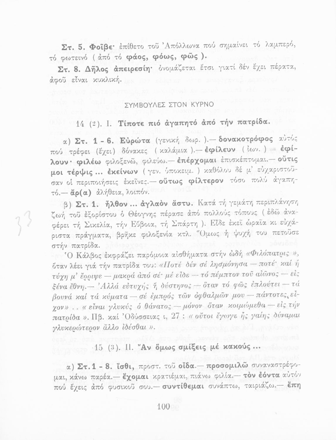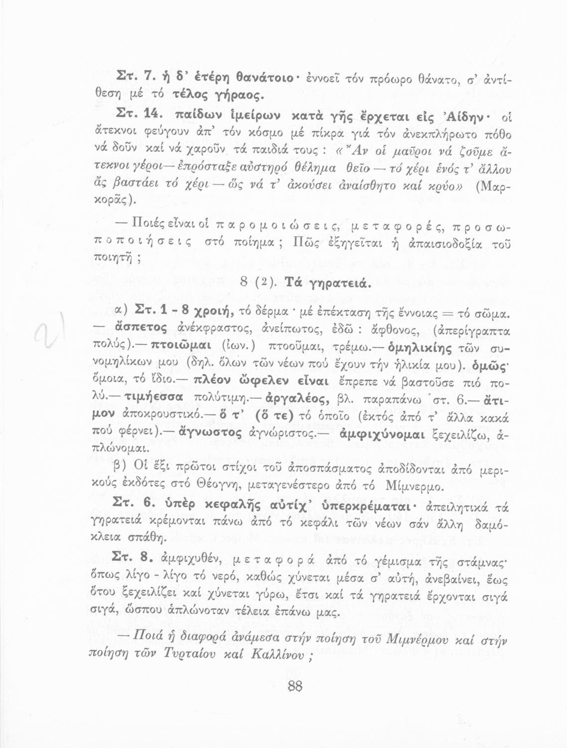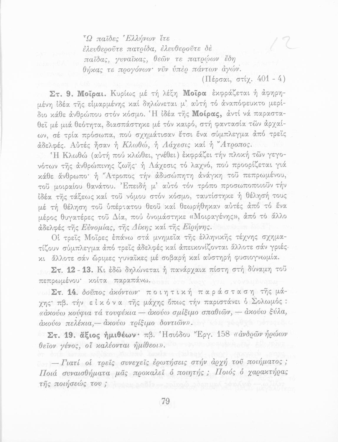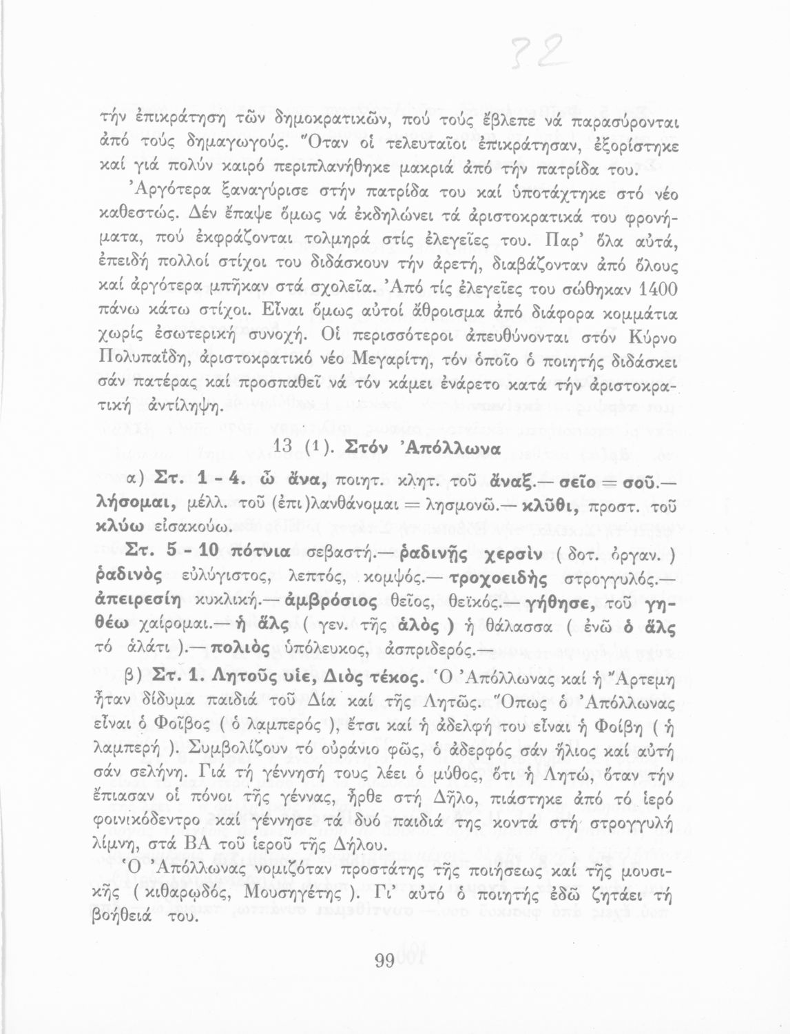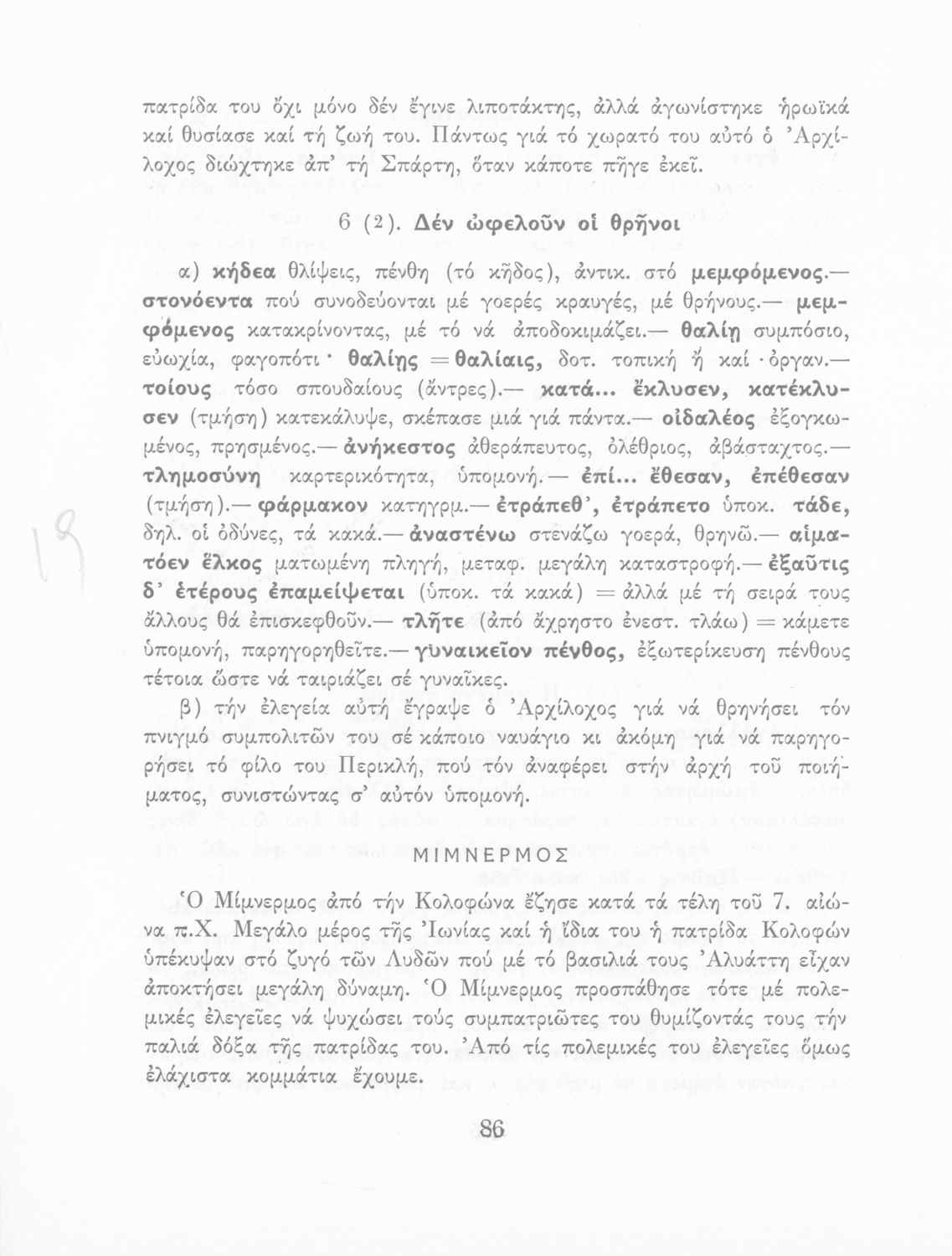 Σχολικό εγχειρίδιο Αρχαίων Ελληνικών Γ΄ Λυκείου που περιλαμβάνει εισαγωγή στη λυρική ποίηση, έργα αρχαίων Ελλήνων ποιητών, ερμηνευτικά και πραγματολογικά σχόλια, και λεξιλογικές παρατηρήσεις. Η εισαγωγή, τα σημειώματα και οι ερμηνευτικές σημειώσεις μεταγλωττίστηκαν από τον επ. Γεν. Επιθεωρητή Μ.Ε. Δορμπαράκη.