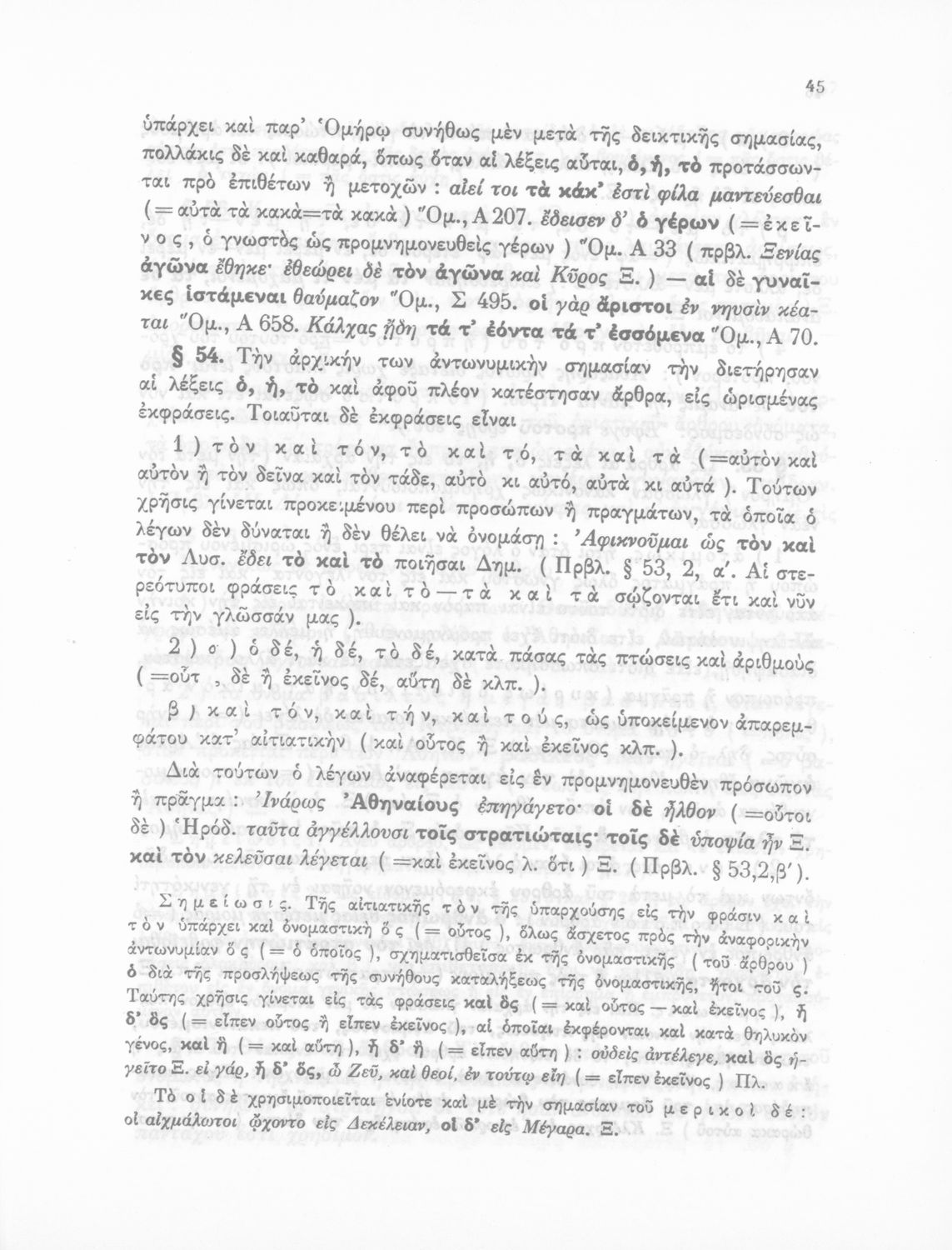 Σχολικό εγχειρίδιο Αρχαίων Ελληνικών Γ΄ και Δ΄ Γυμνασίου που εξετάζει τα μέρη του λόγου και την σύνταξή τους. Φέρει από το σύμβολο της επταετίας.