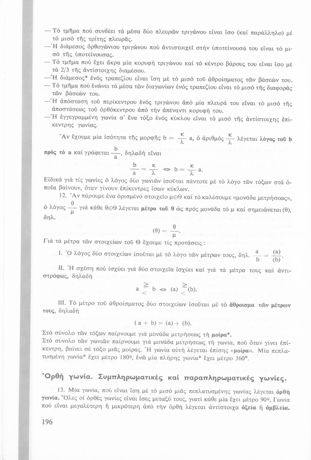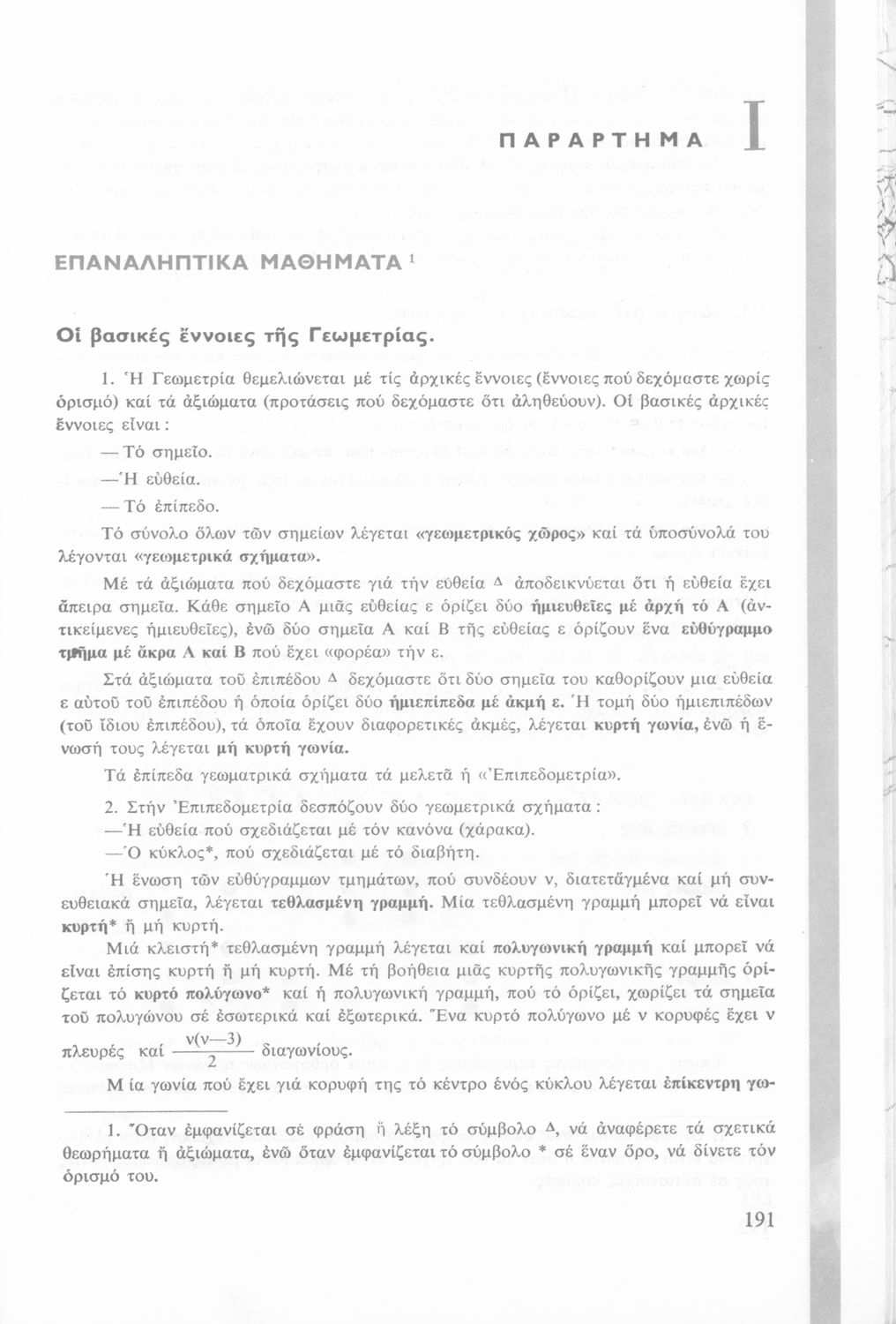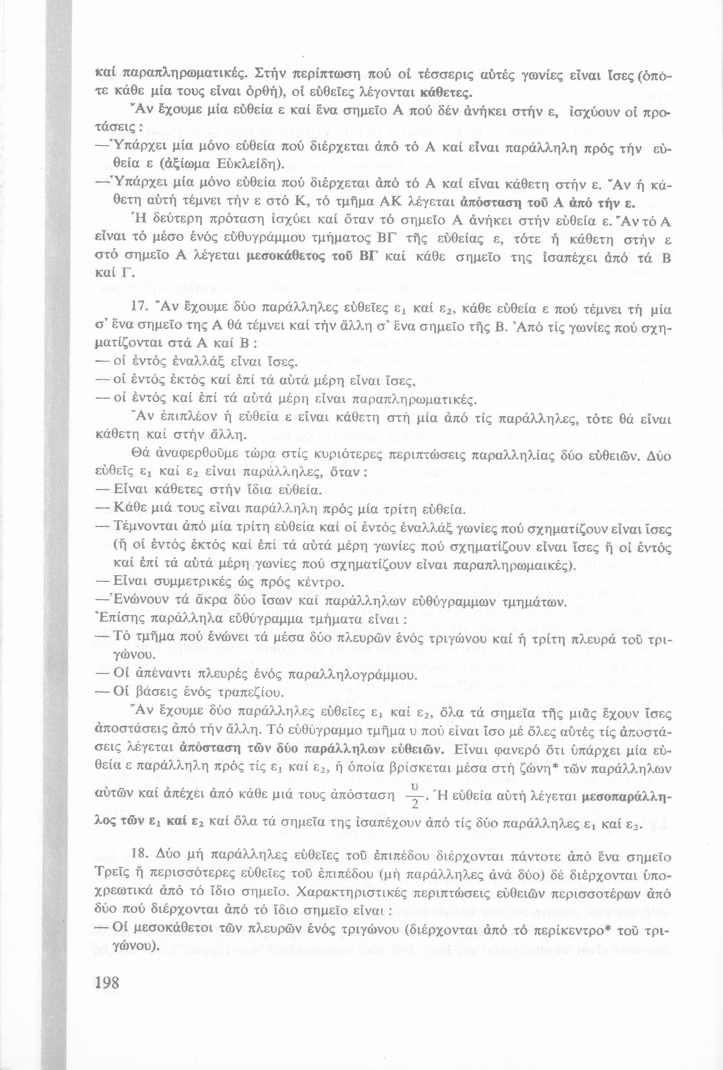 Σχολικό εγχειρίδιο Γεωμετρίας Α΄ Λυκείου χωρισμένο σε θεωρήματα, λυμένες ασκήσεις, ασκήσεις και επαναλήψεις κεφαλαίου. Περιέχει ένα παράρτημα με επαναληπτικά μαθήματα και ένα με ευρετήριο όρων.