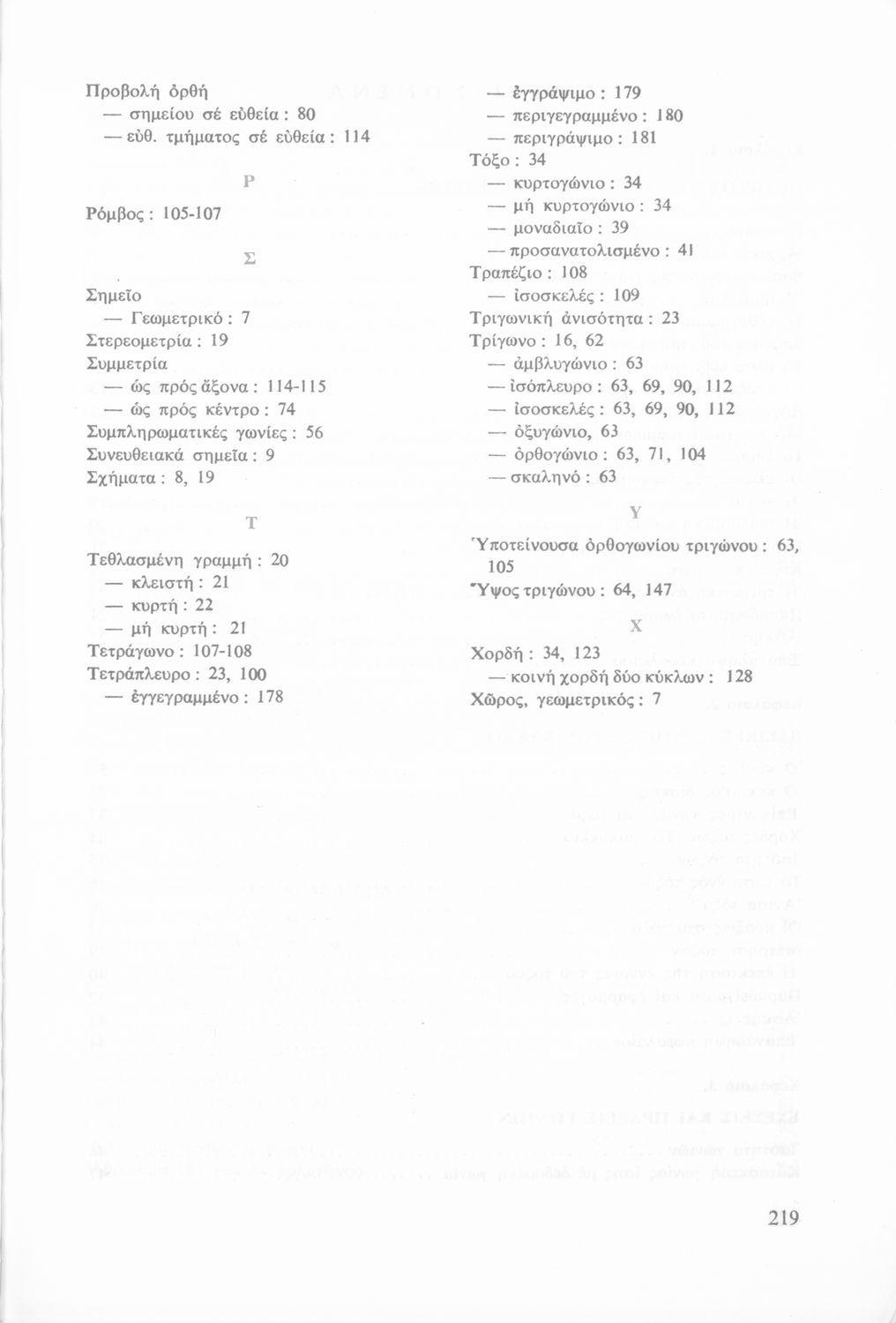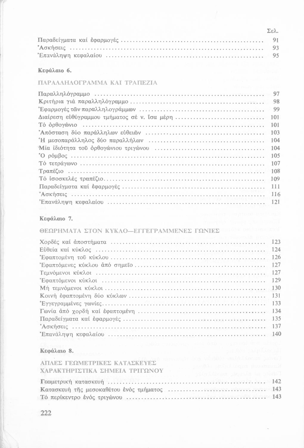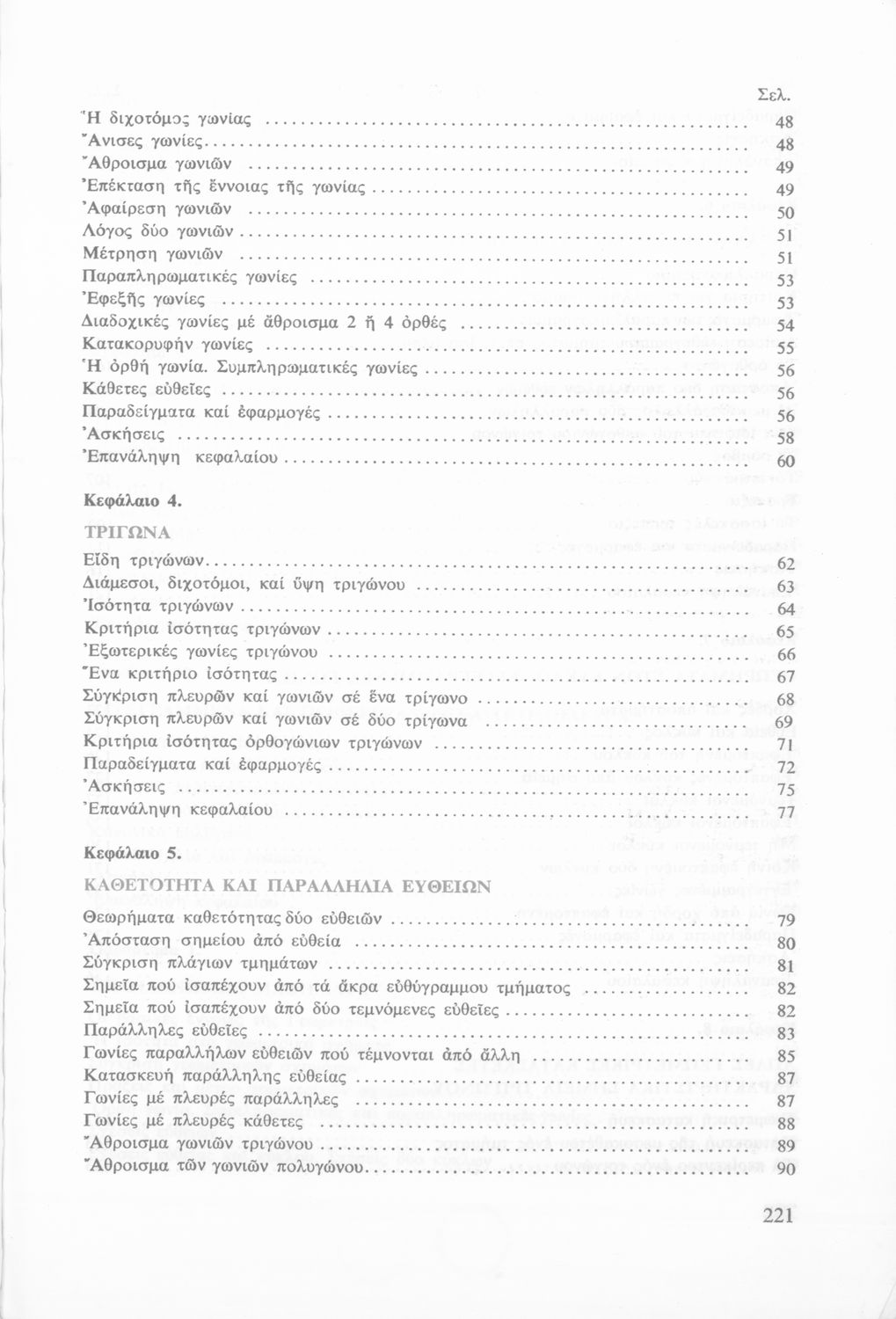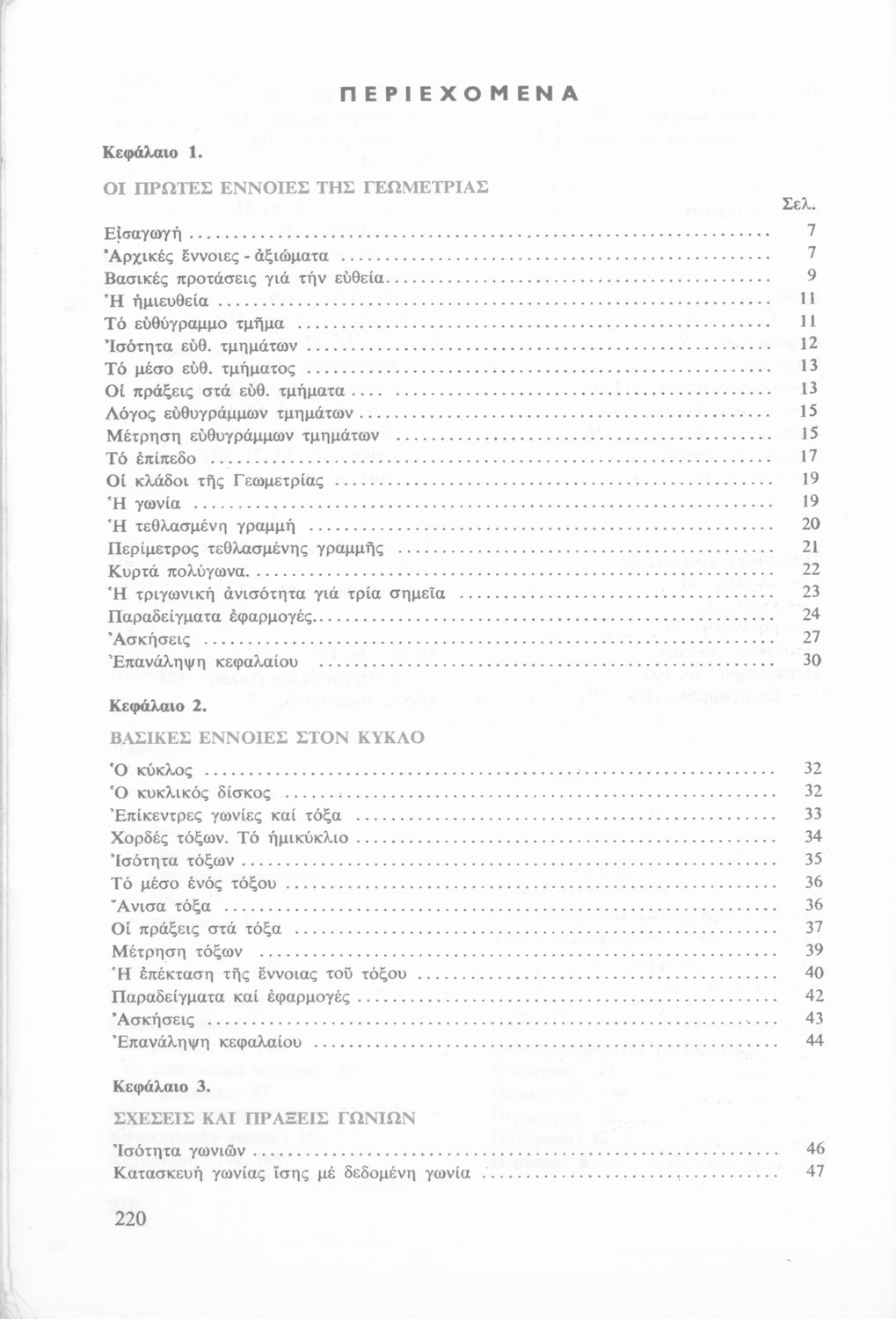 Σχολικό εγχειρίδιο Γεωμετρίας Α΄ Λυκείου χωρισμένο σε θεωρήματα, λυμένες ασκήσεις, ασκήσεις και επαναλήψεις κεφαλαίου. Περιέχει ένα παράρτημα με επαναληπτικά μαθήματα και ένα με ευρετήριο όρων.