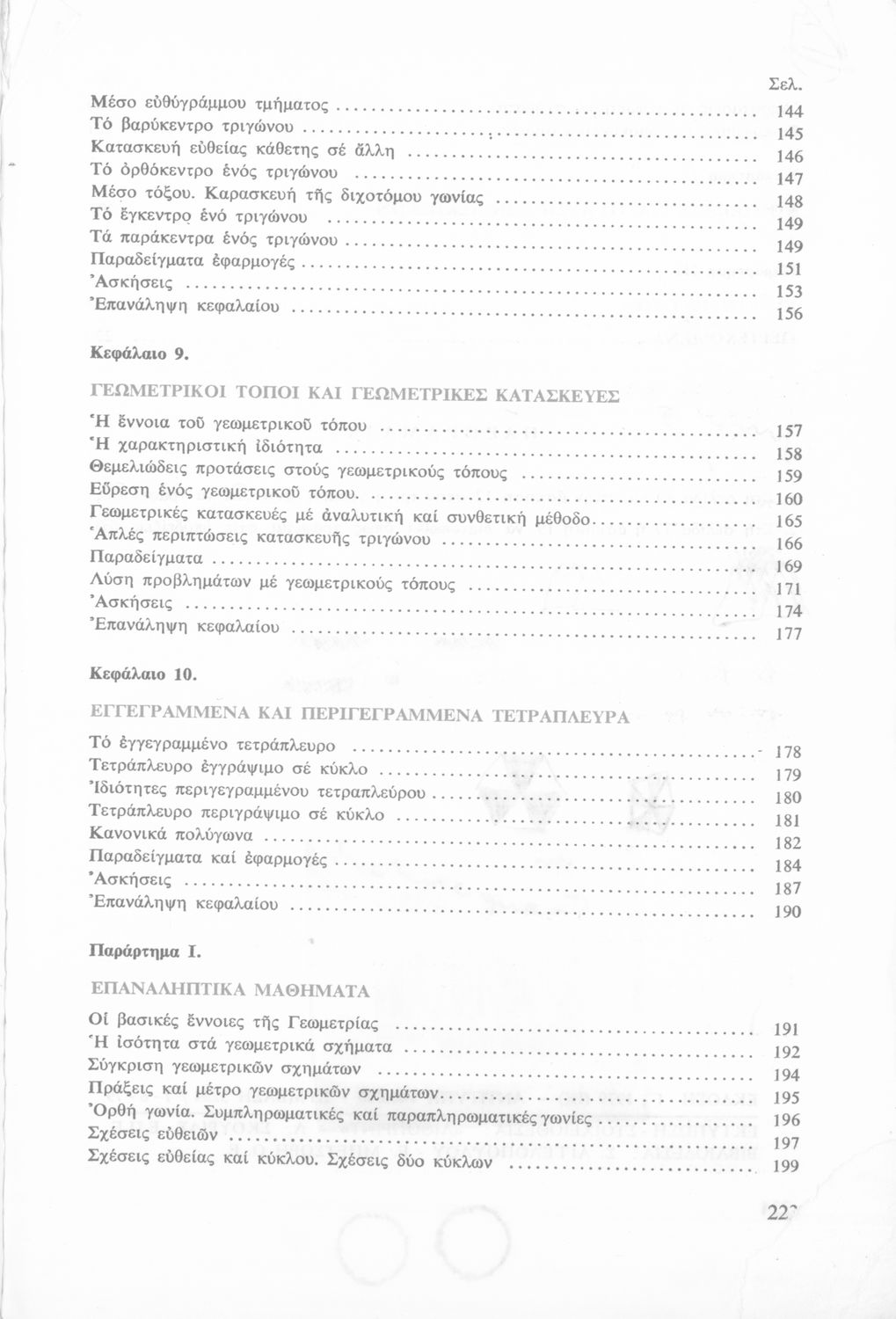 Σχολικό εγχειρίδιο Γεωμετρίας Γ΄ Γυμνασίου χωρισμένο σε θεωρήματα, λυμένες ασκήσεις, ασκήσεις και επαναλήψεις κεφαλαίου. Περιέχει ένα παράρτημα με επαναληπτικά μαθήματα και ένα με ευρετήριο όρων.
