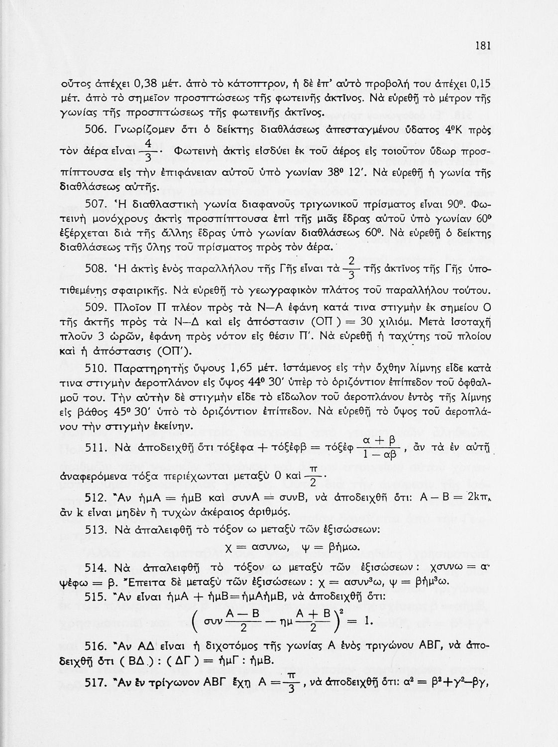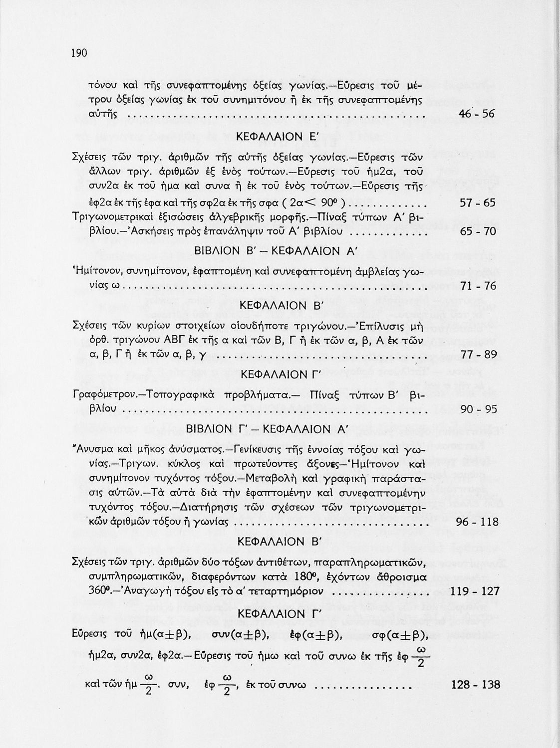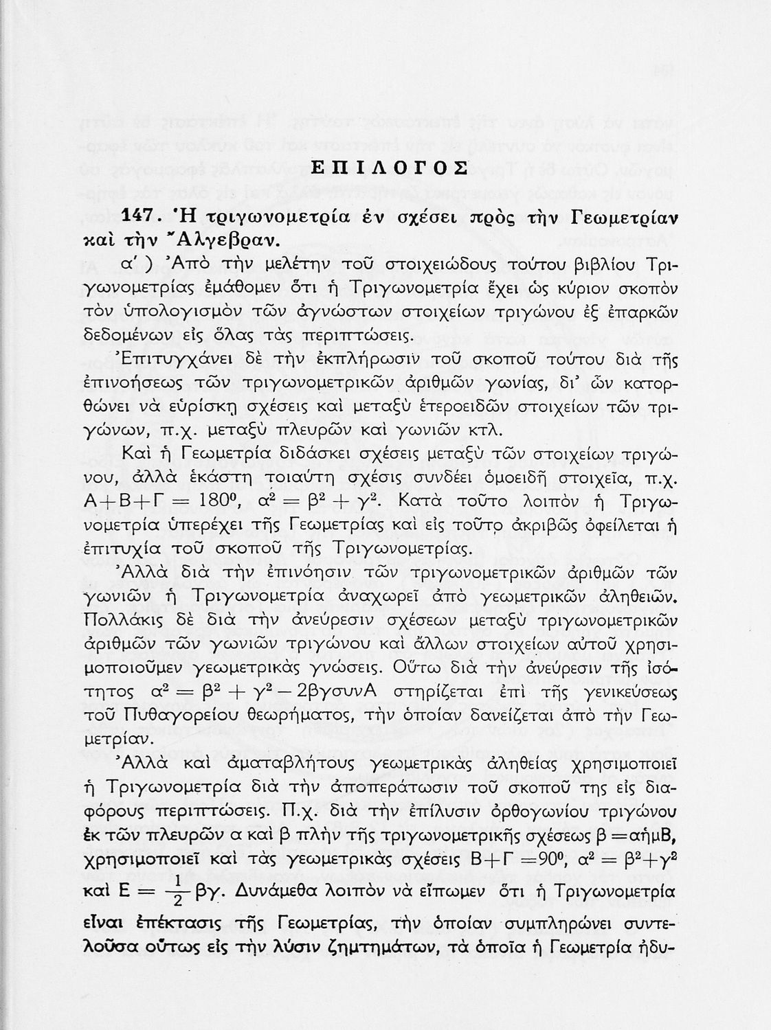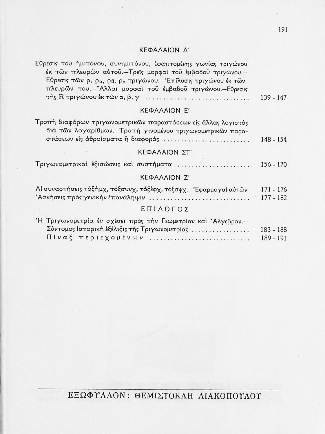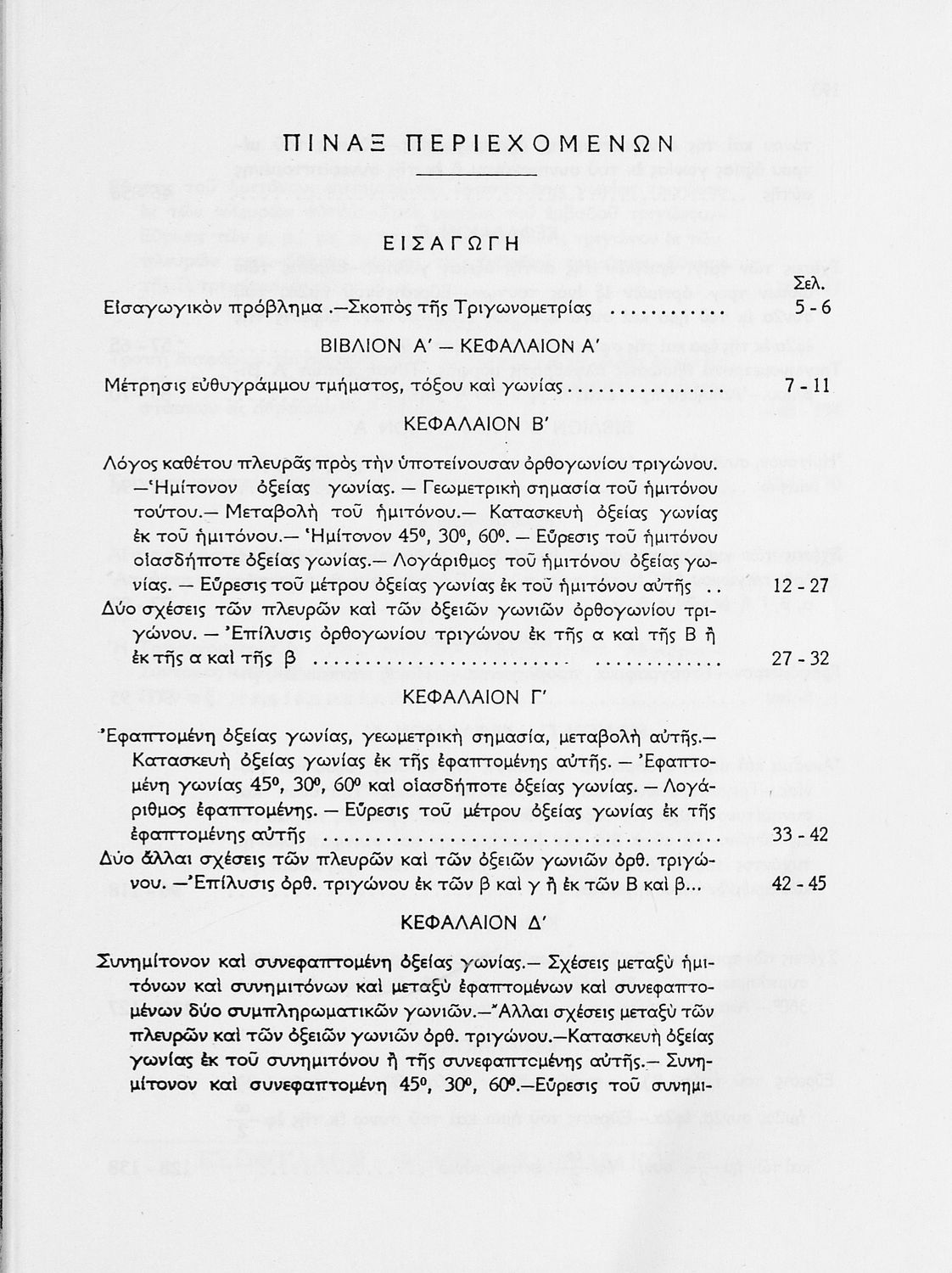 Σχολικό εγχειρίδιο Τριγωνομετρίας για τις Δ΄, Ε΄ και ΣΤ΄ Γυμνασίου που περιλαμβάνει θεωρία και ασκήσεις. Φέρει το σύμβολο της δικτατορίας.