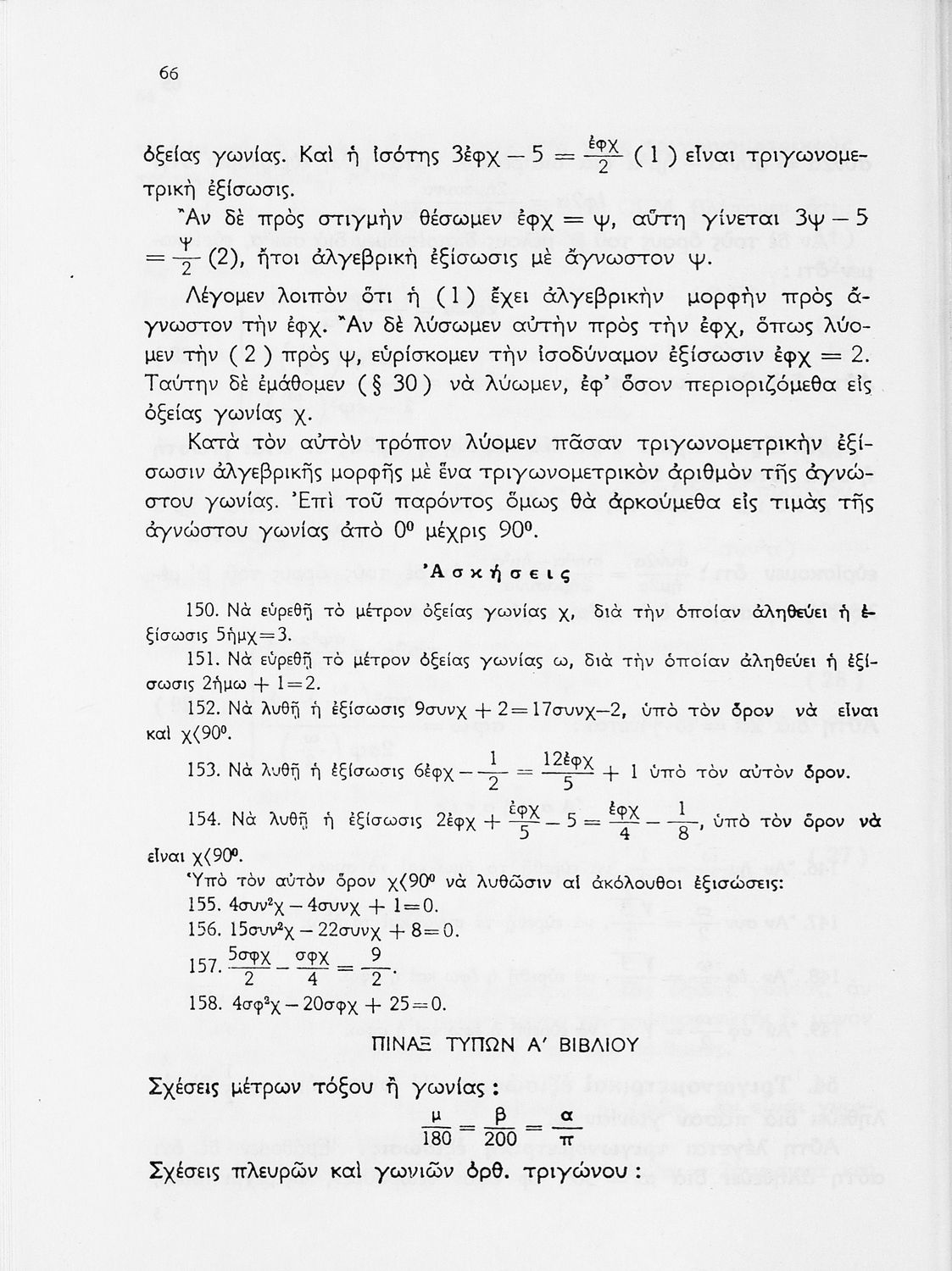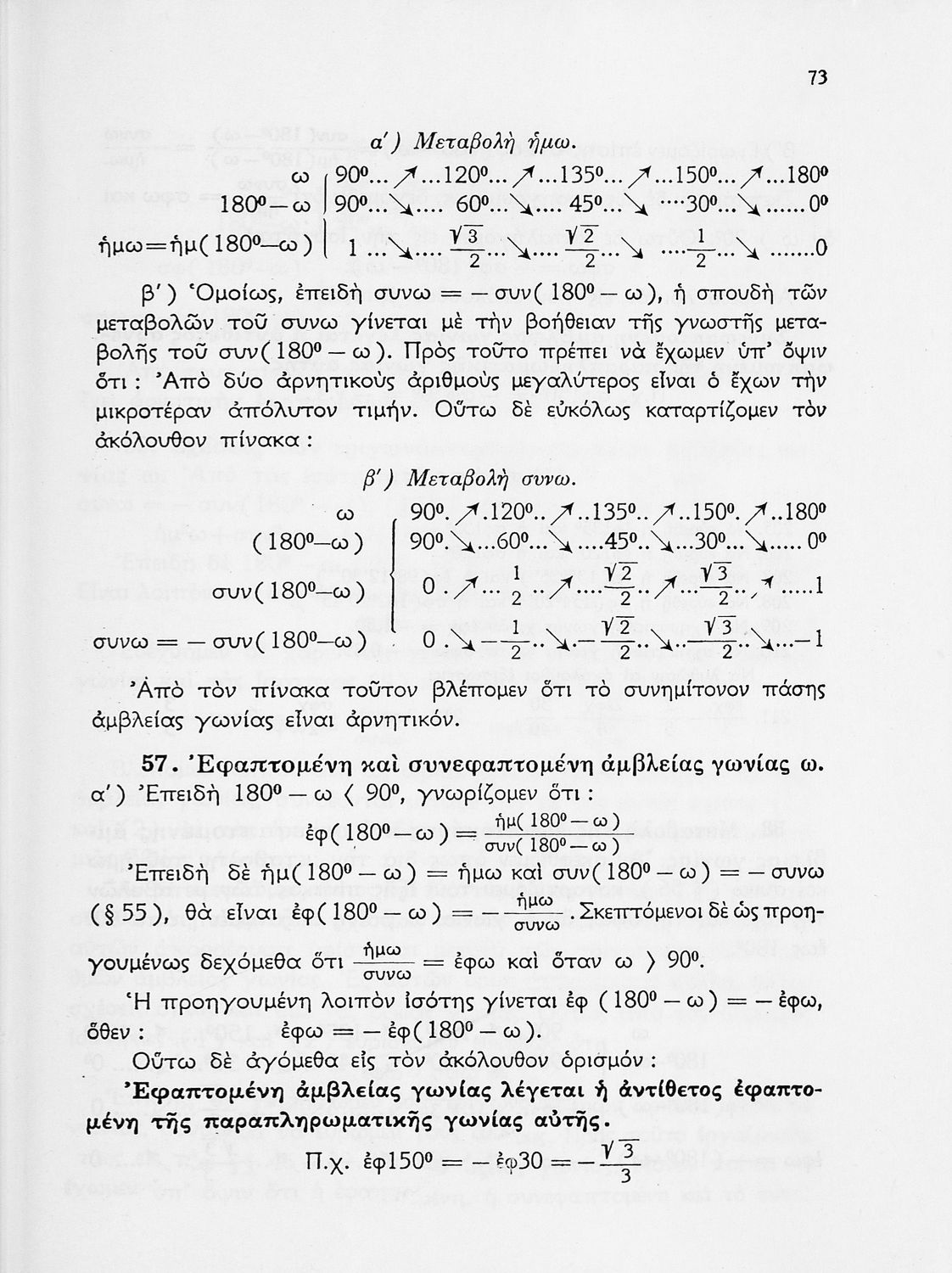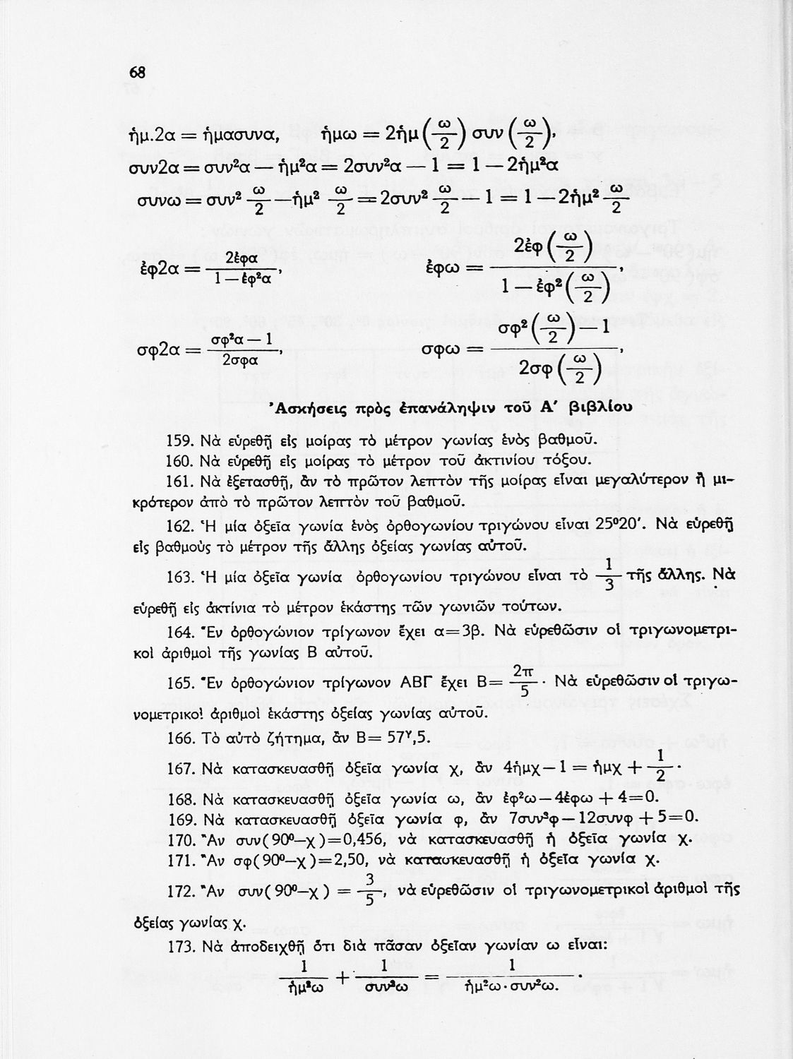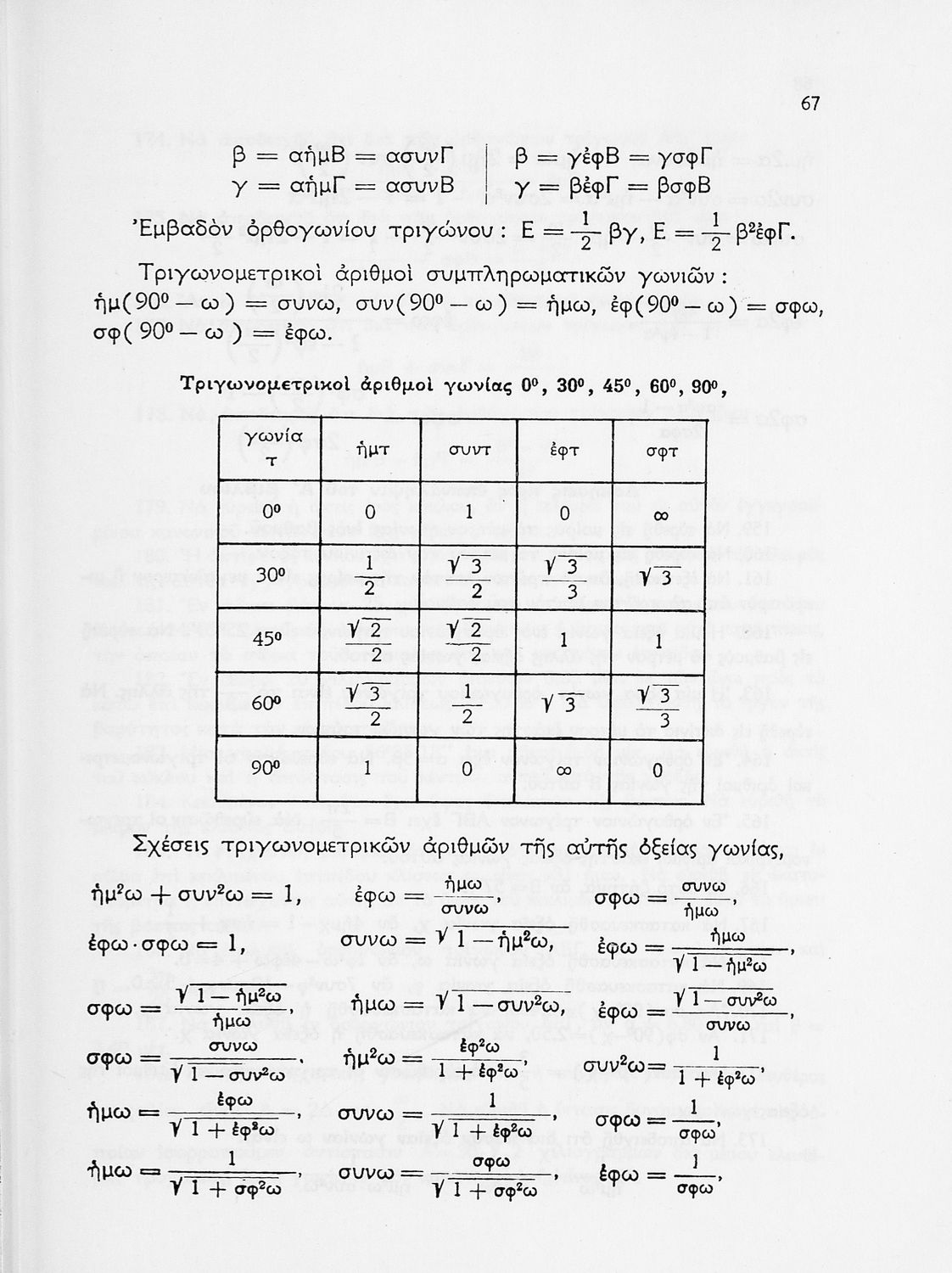 Σχολικό εγχειρίδιο Τριγωνομετρίας για τις Δ΄, Ε΄ και ΣΤ΄ Γυμνασίου που περιλαμβάνει θεωρία και ασκήσεις. Φέρει το σύμβολο της δικτατορίας.