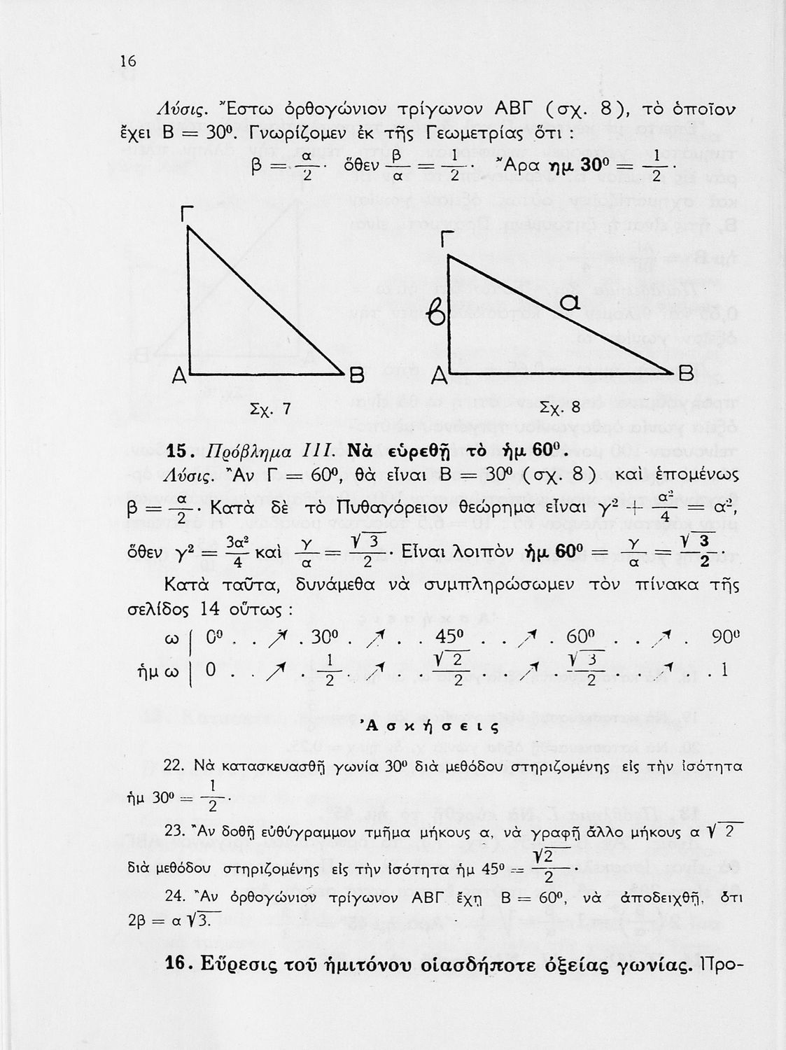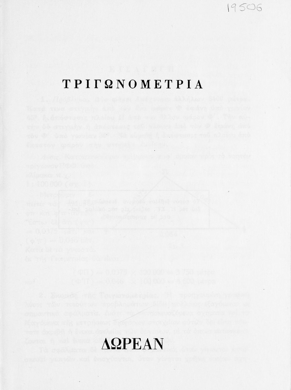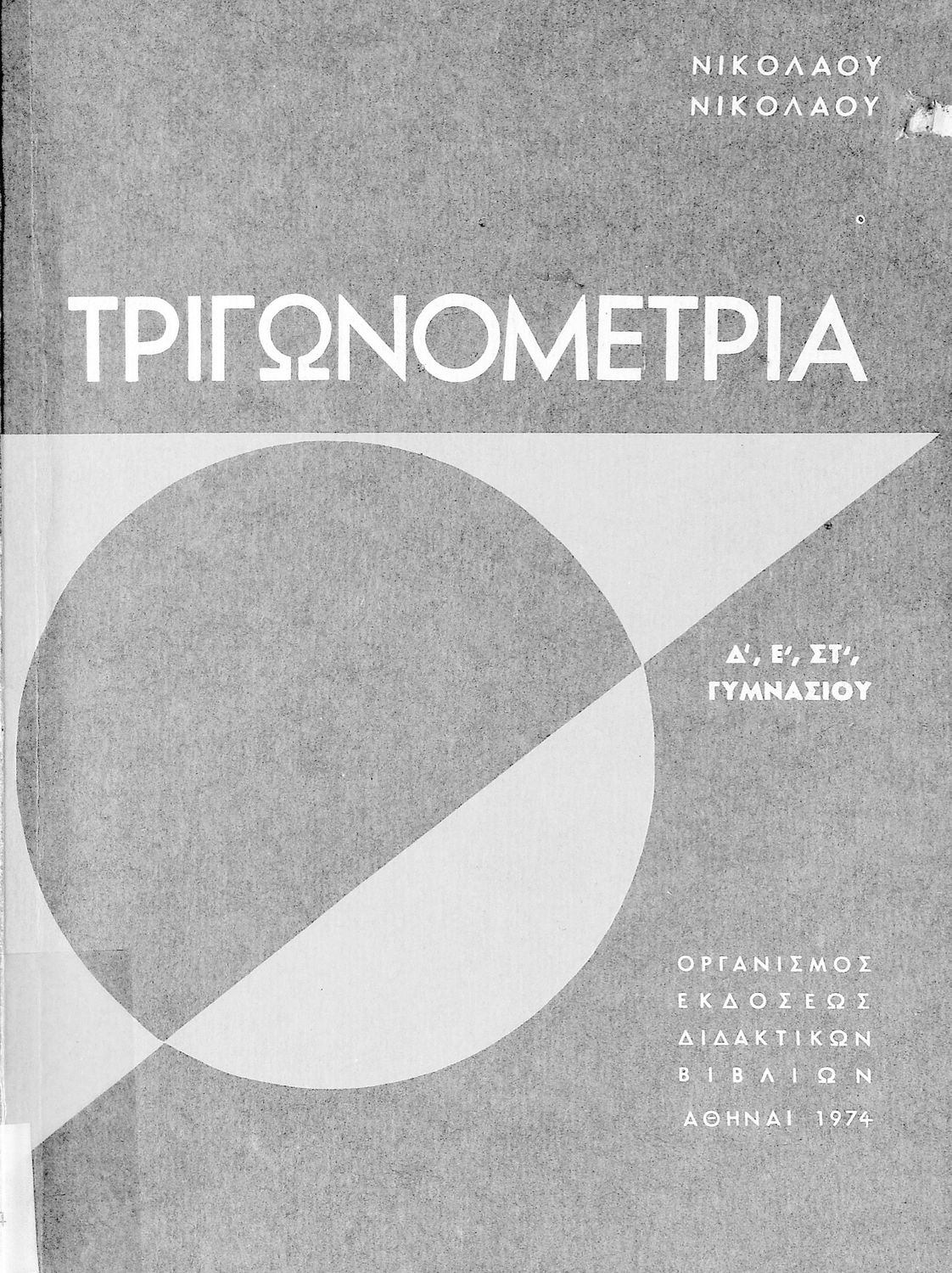 Σχολικό εγχειρίδιο Τριγωνομετρίας για τις Δ΄, Ε΄ και ΣΤ΄ Γυμνασίου που περιλαμβάνει θεωρία και ασκήσεις. Φέρει το σύμβολο της δικτατορίας.