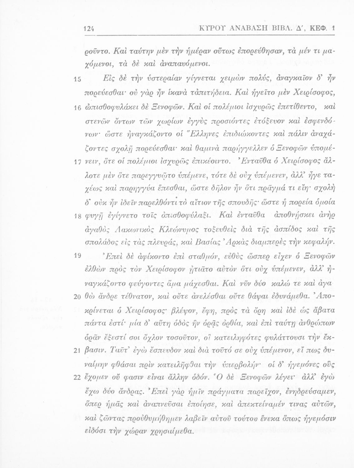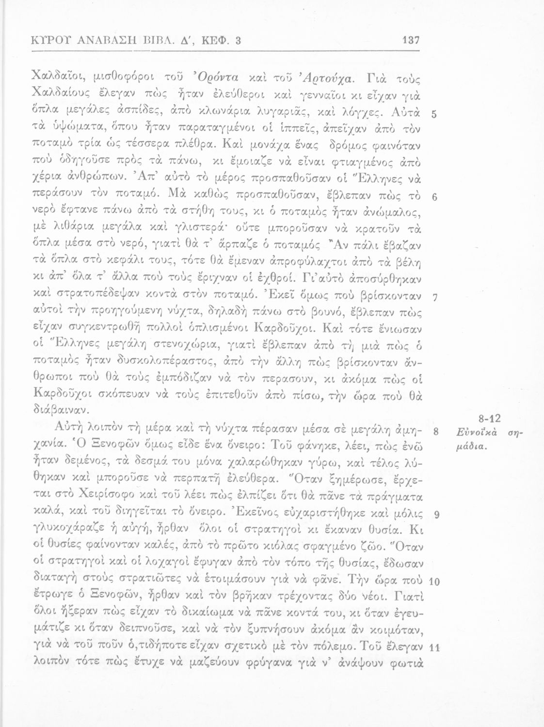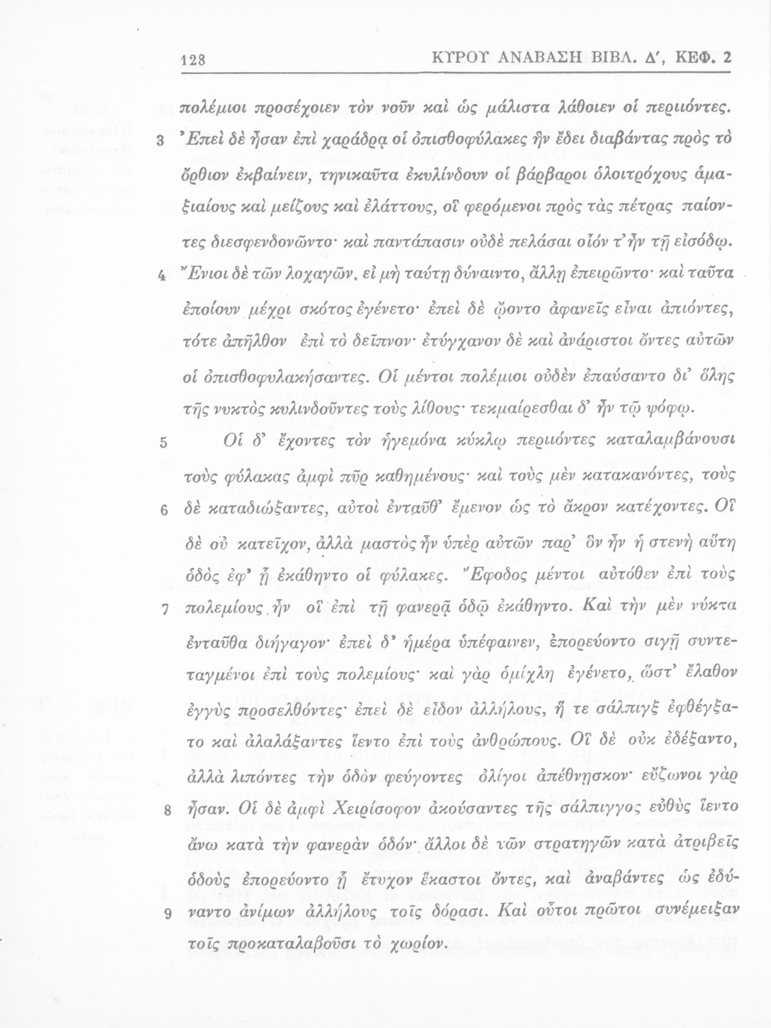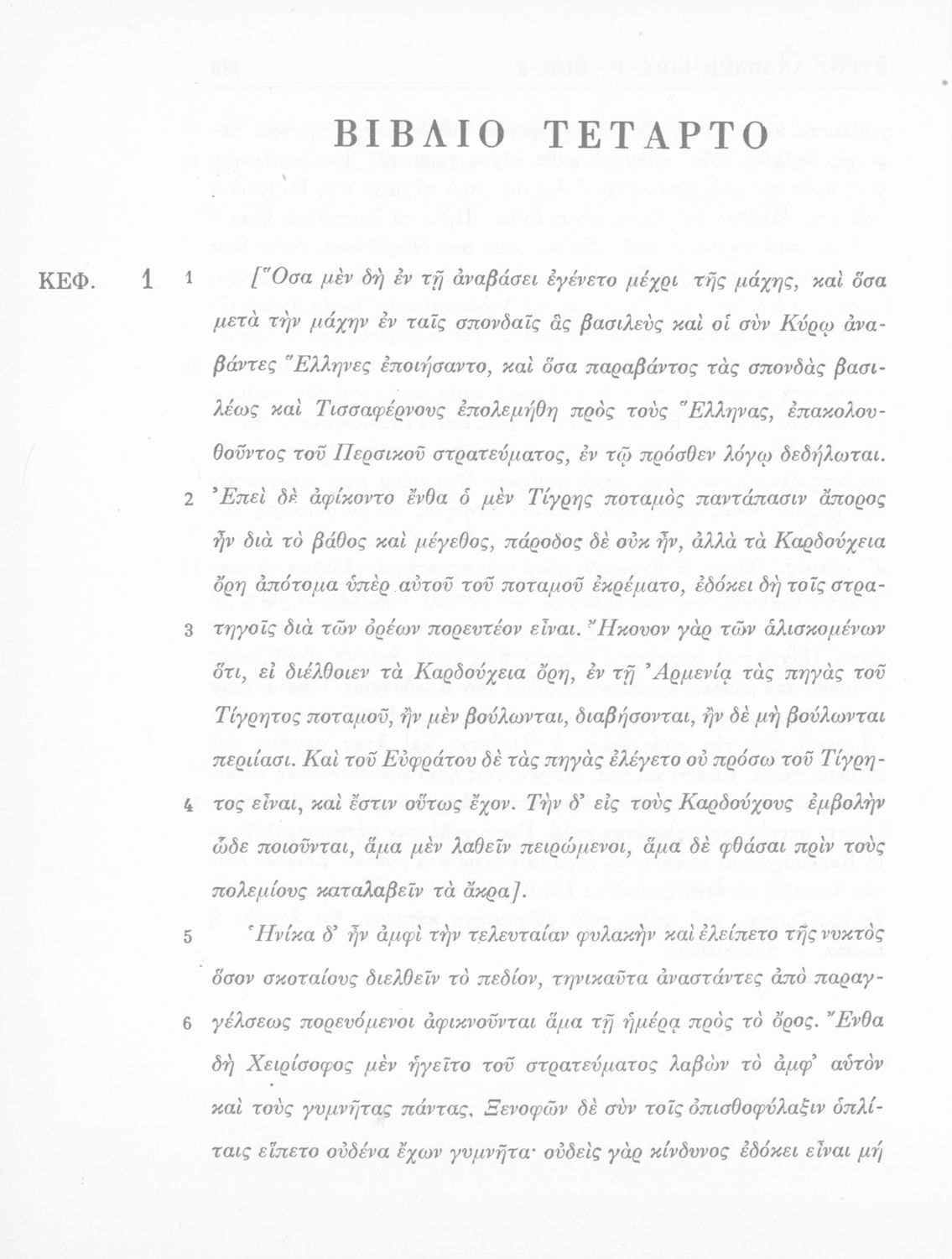 Σχολικό εγχειρίδιο της Γ' Ελληνικού Σχολείου και Αστικών Σχολείων για το μάθημα των Αρχαίων Ελληνικών. Το σύγγραμμα περιλαμβάνει κείμενα κατ΄ επιλογή από τα τέσσερα τελευταία βιβλία του έργου Κύρου Ανάβασις. ...