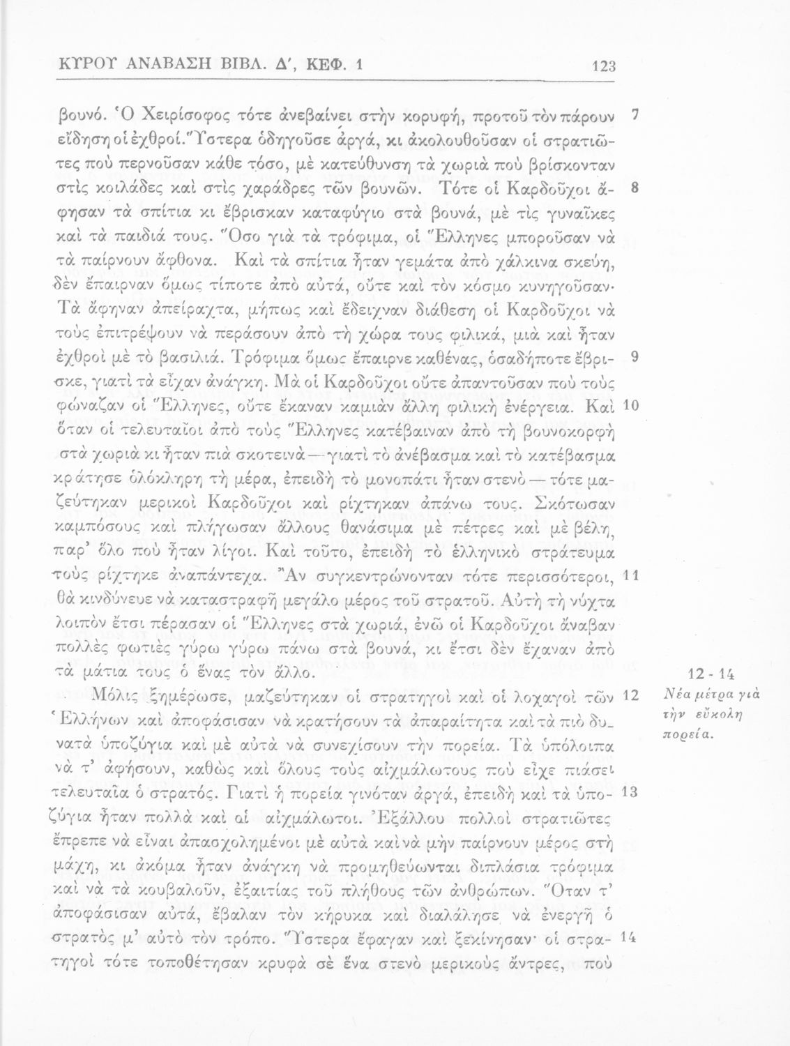 Σχολικό εγχειρίδιο Αρχαίων Ελληνικών α΄ Γυμνασίου που περιλαμβάνει μετάφραση του έργου του Ξενοφώντα Κύρου Ανάβασις, εισαγωγικά σχόλια για τη ζωή και το έργο του, και ερμηνευτικές παρατηρήσεις.