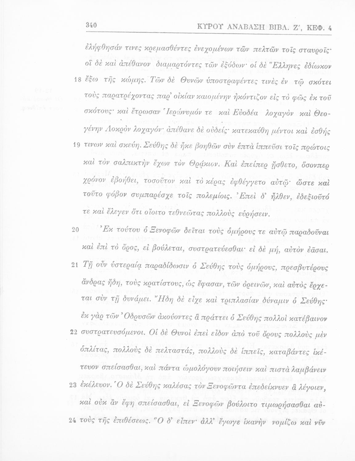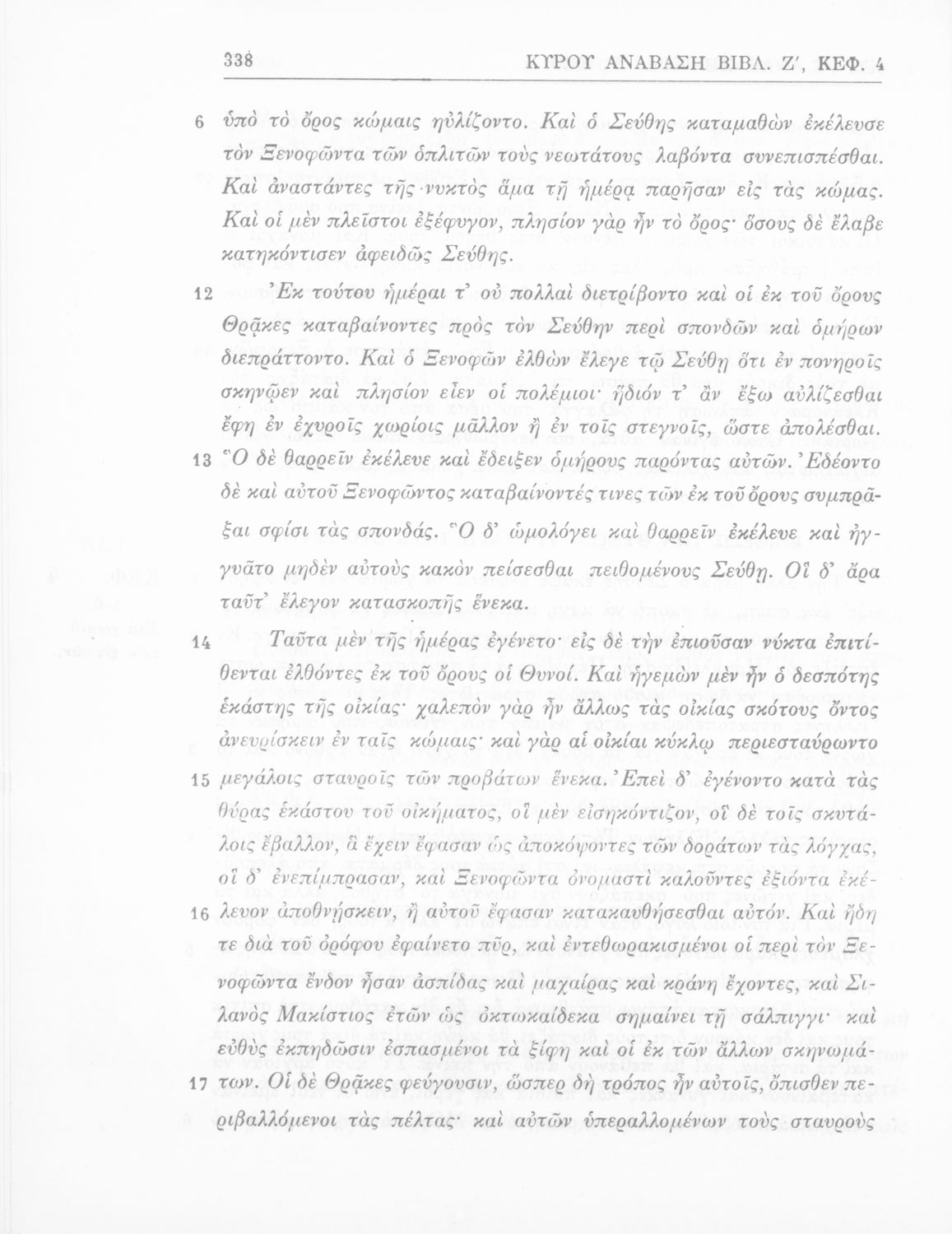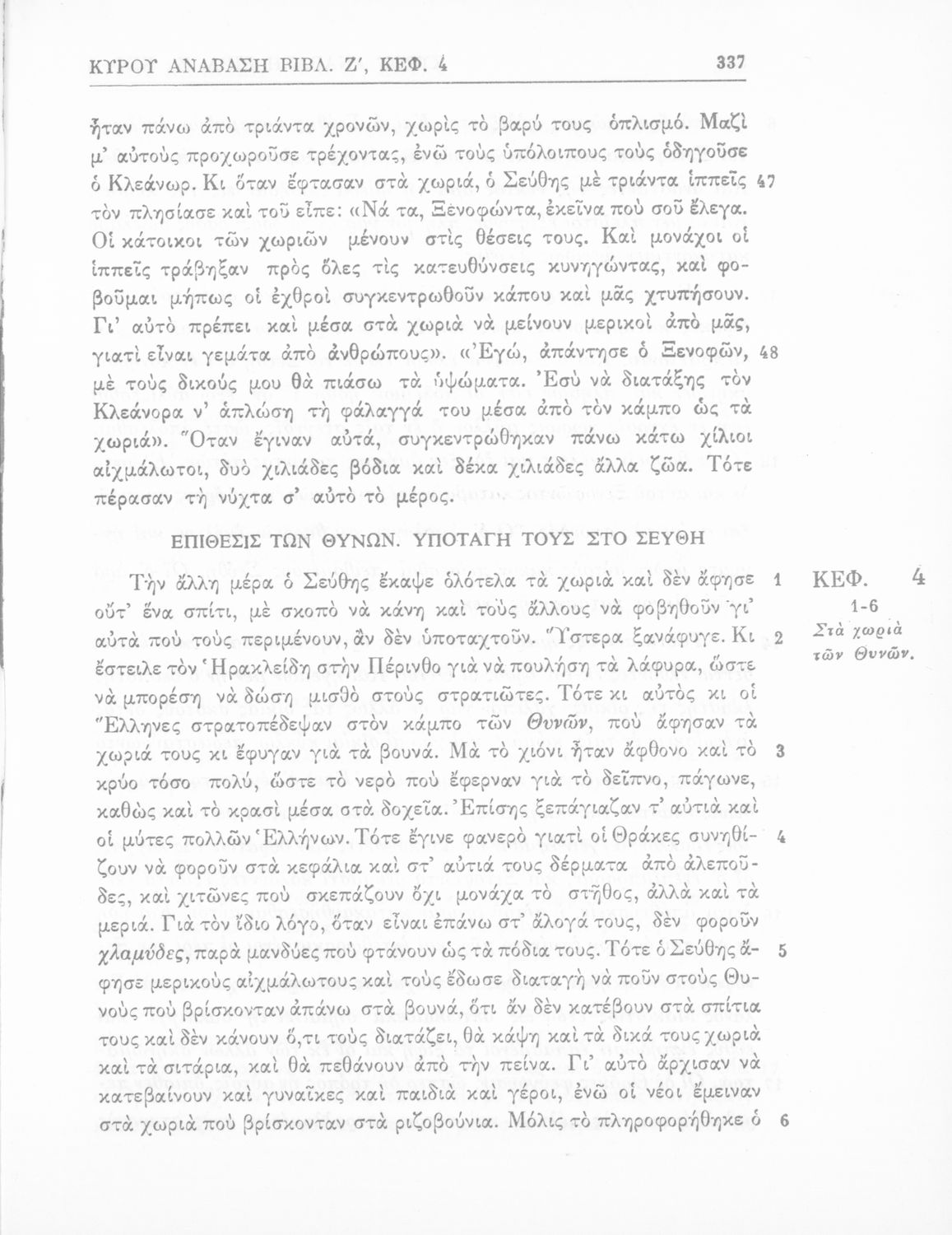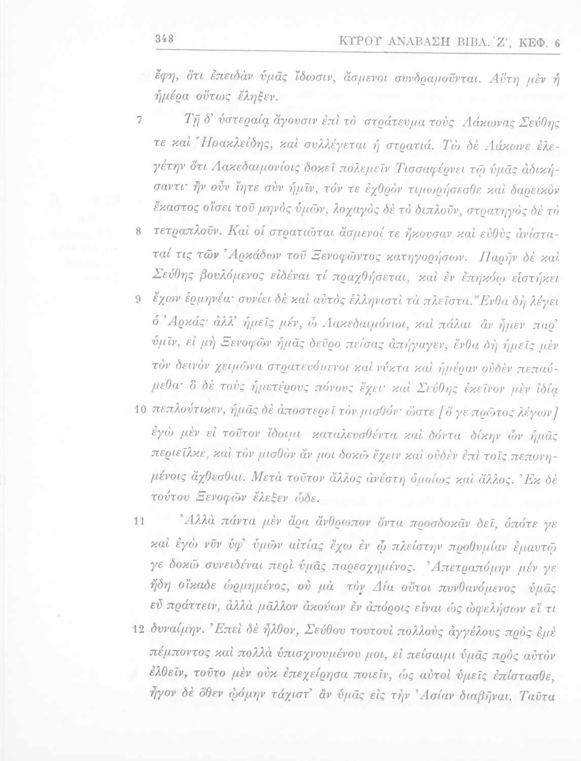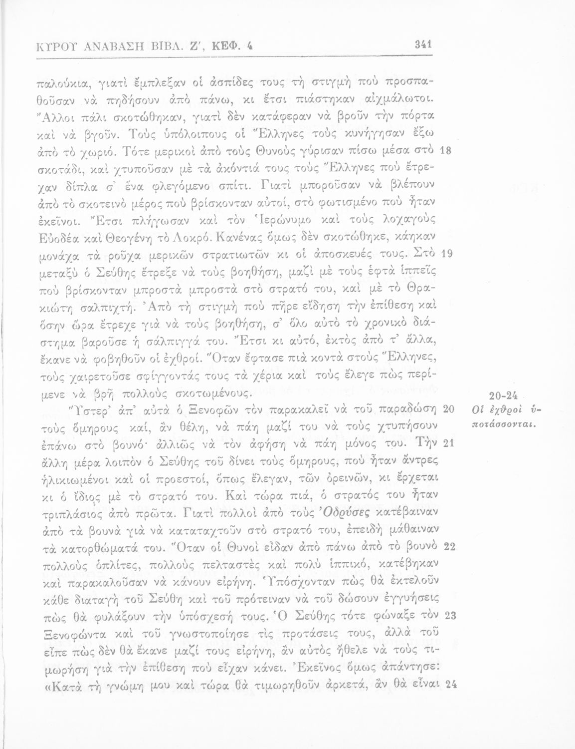 Σχολικό εγχειρίδιο της Γ' Ελληνικού Σχολείου και Αστικών Σχολείων για το μάθημα των Αρχαίων Ελληνικών. Το σύγγραμμα περιλαμβάνει κείμενα κατ΄ επιλογή από τα τέσσερα τελευταία βιβλία του έργου Κύρου Ανάβασις. ...