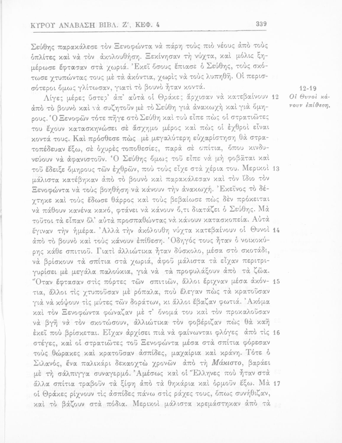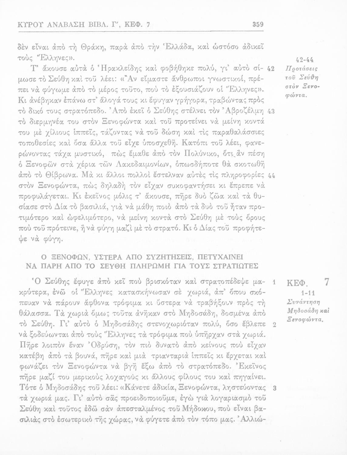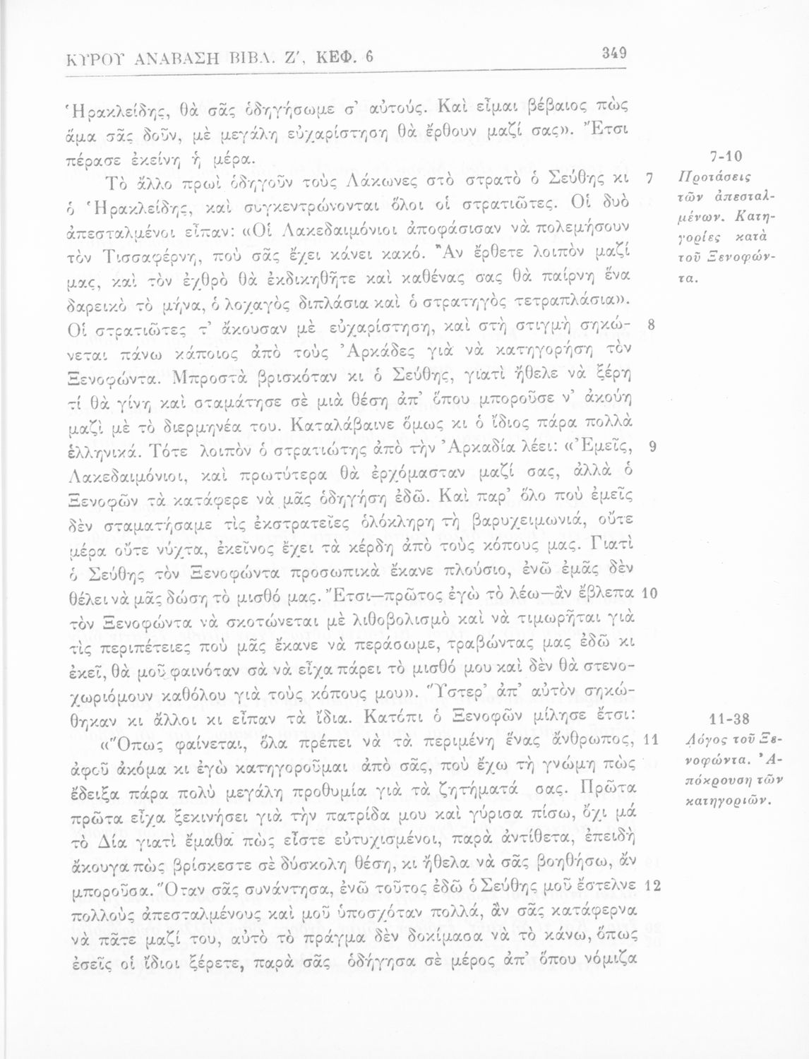 Σχολικό εγχειρίδιο Αρχαίων Ελληνικών α΄ Γυμνασίου που περιλαμβάνει μετάφραση του έργου του Ξενοφώντα Κύρου Ανάβασις, εισαγωγικά σχόλια για τη ζωή και το έργο του, και ερμηνευτικές παρατηρήσεις.