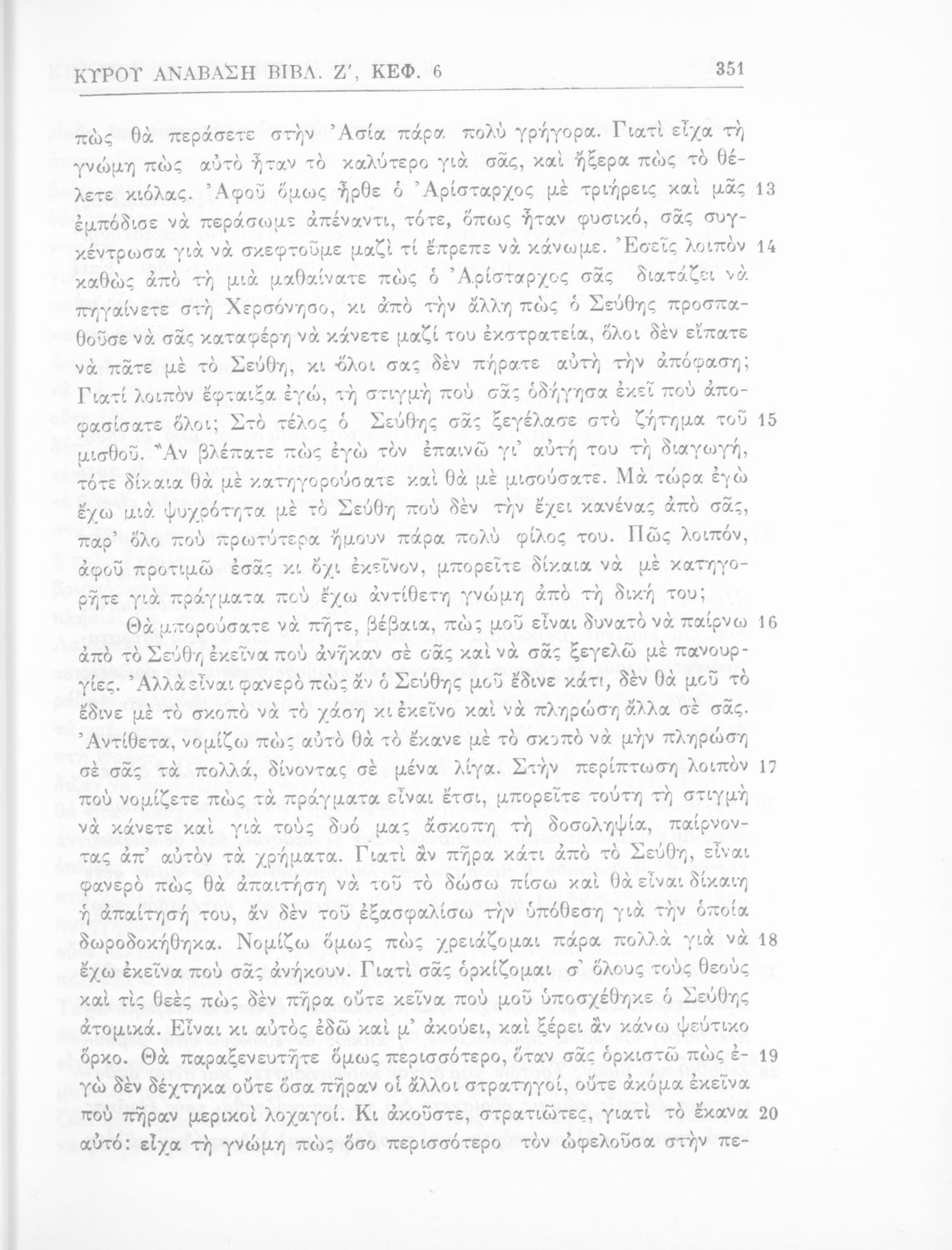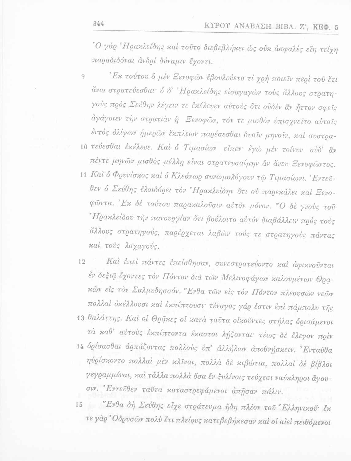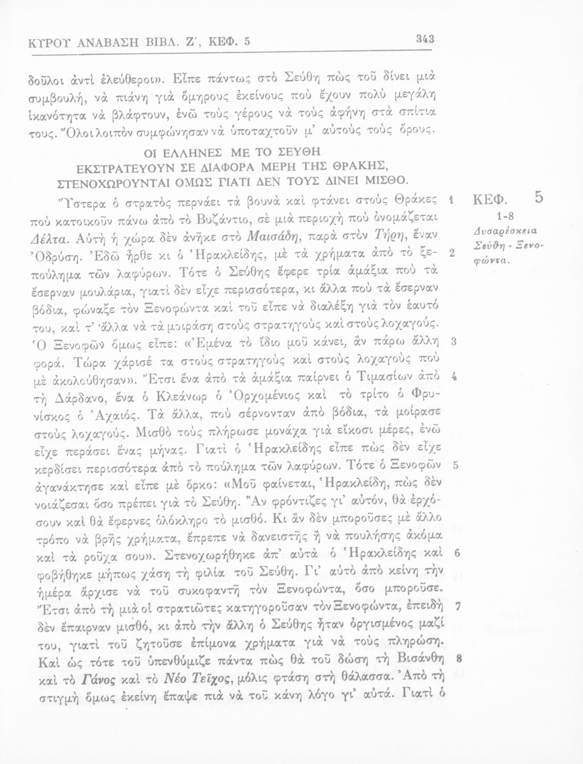 Σχολικό εγχειρίδιο Αρχαίων Ελληνικών α΄ Γυμνασίου που περιλαμβάνει μετάφραση του έργου του Ξενοφώντα Κύρου Ανάβασις, εισαγωγικά σχόλια για τη ζωή και το έργο του, και ερμηνευτικές παρατηρήσεις.