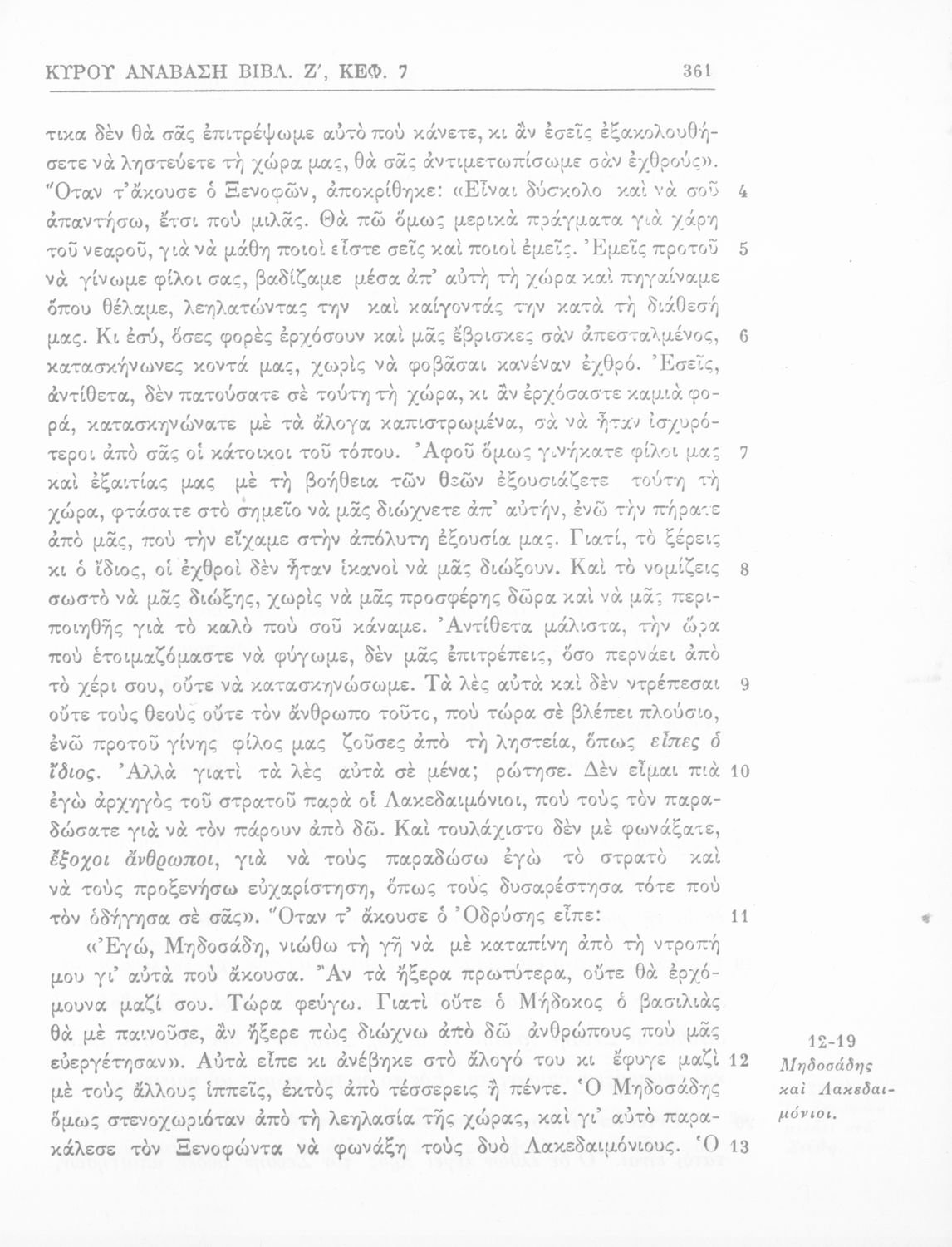 Σχολικό εγχειρίδιο Αρχαίων Ελληνικών α΄ Γυμνασίου που περιλαμβάνει μετάφραση του έργου του Ξενοφώντα Κύρου Ανάβασις, εισαγωγικά σχόλια για τη ζωή και το έργο του, και ερμηνευτικές παρατηρήσεις.