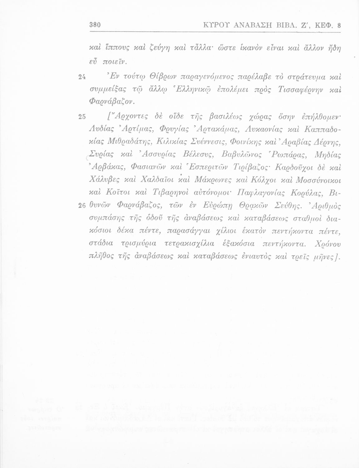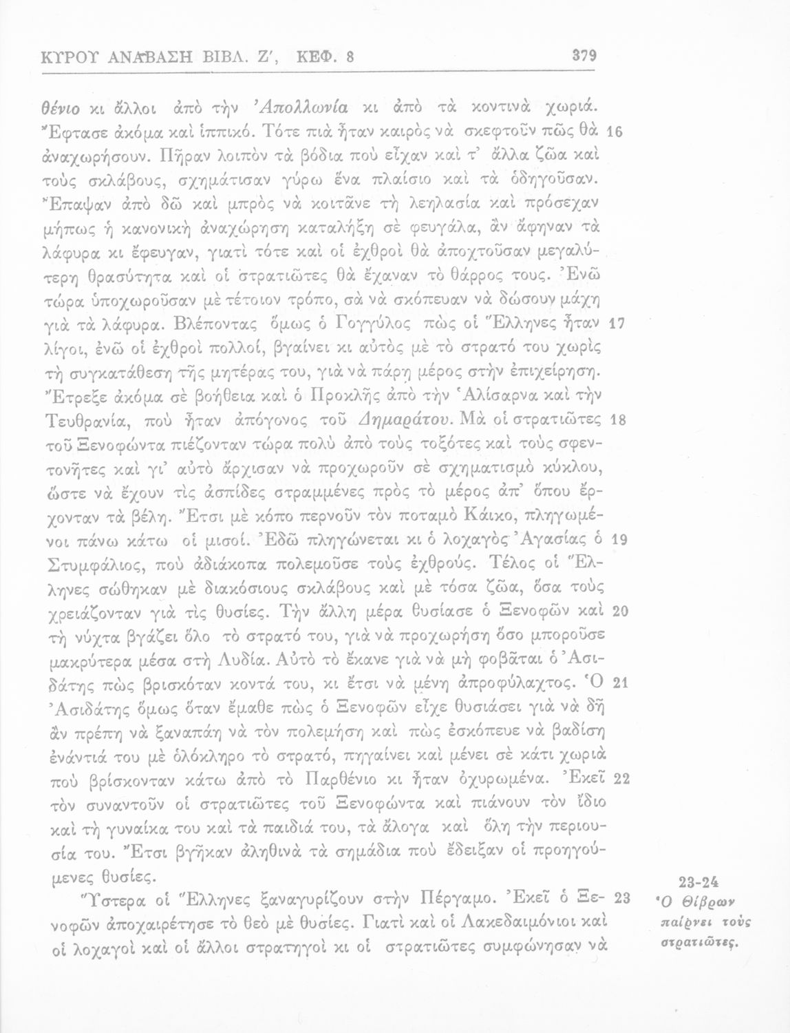 Σχολικό εγχειρίδιο της Γ' Ελληνικού Σχολείου και Αστικών Σχολείων για το μάθημα των Αρχαίων Ελληνικών. Το σύγγραμμα περιλαμβάνει κείμενα κατ΄ επιλογή από τα τέσσερα τελευταία βιβλία του έργου Κύρου Ανάβασις. ...