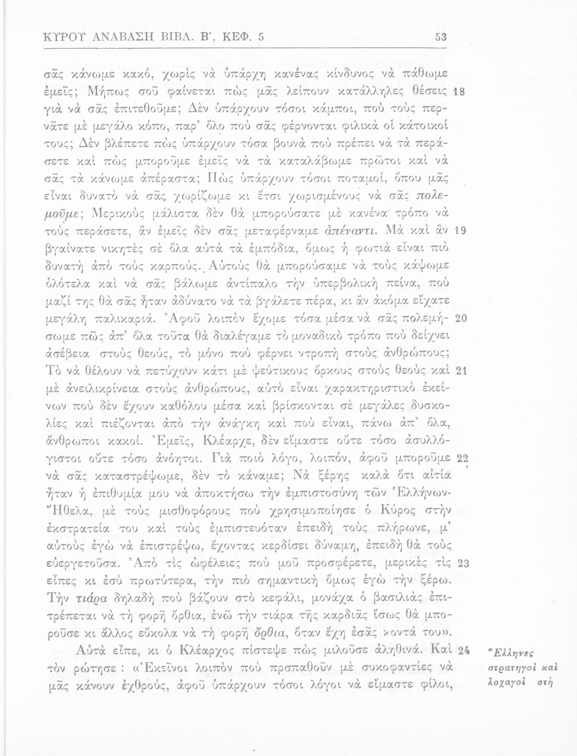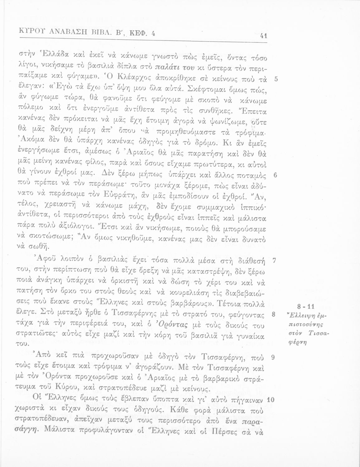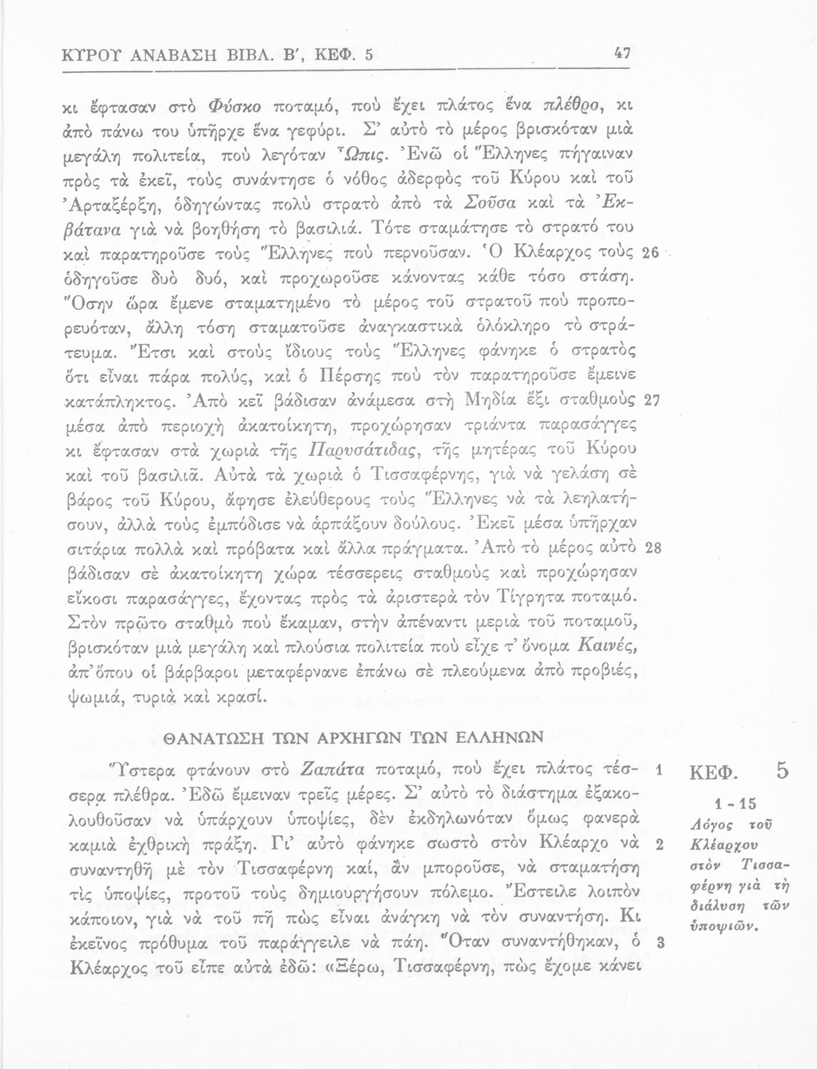 Σχολικό εγχειρίδιο Αρχαίων Ελληνικών α΄ Γυμνασίου που περιλαμβάνει μετάφραση του έργου του Ξενοφώντα Κύρου Ανάβασις, εισαγωγικά σχόλια για τη ζωή και το έργο του, και ερμηνευτικές παρατηρήσεις.