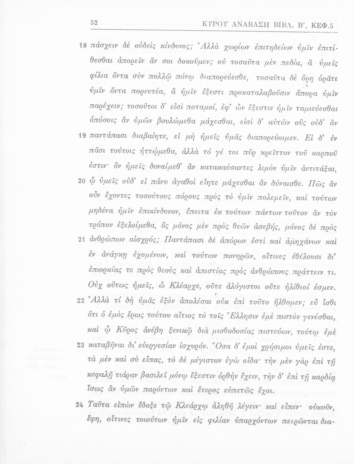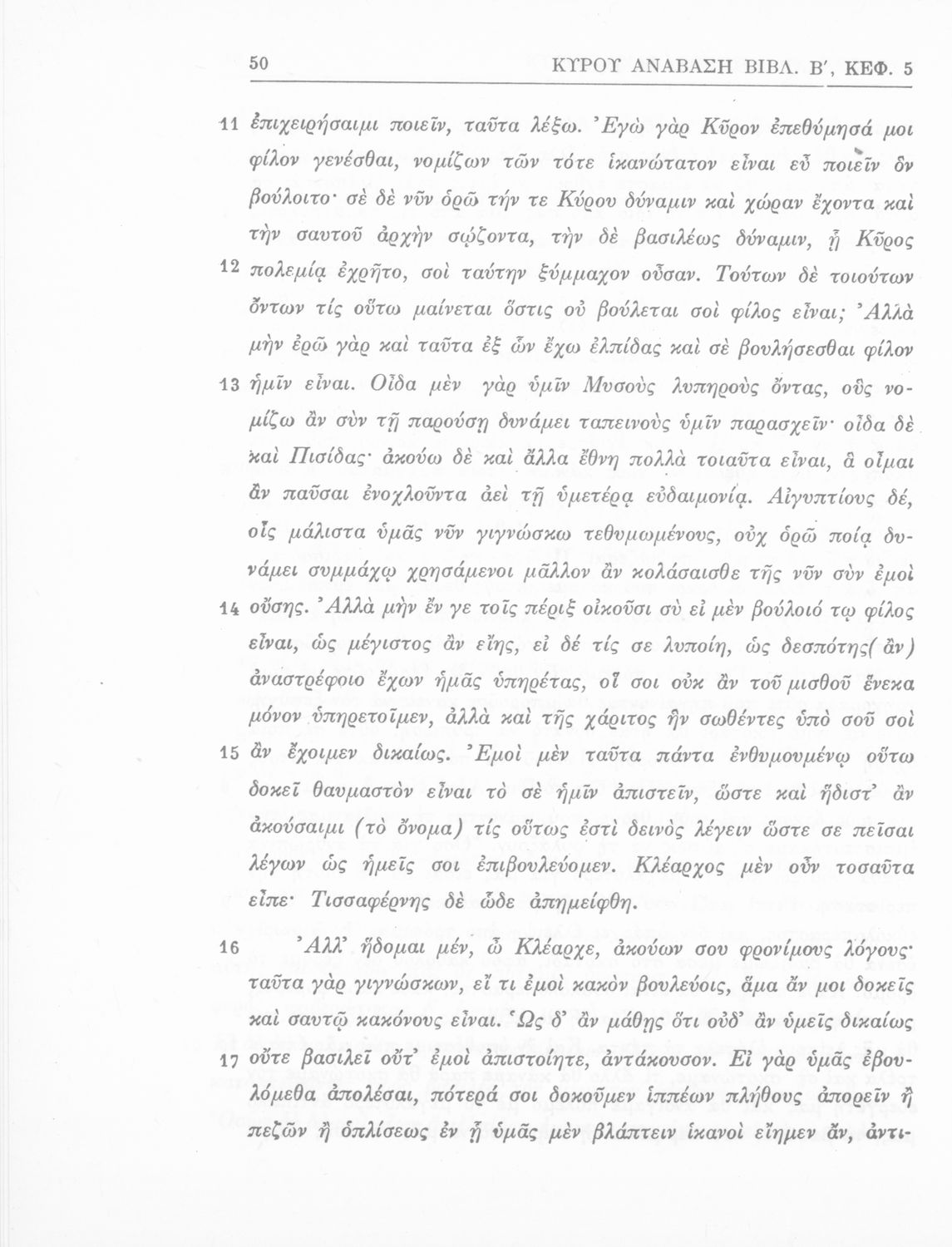 Σχολικό εγχειρίδιο Αρχαίων Ελληνικών Β΄ Γυμνασίου που περιλαμβάνει αποσπάσματα από το έργο του Ξενοφώντα Κύρου Ανάβασις, ερμηνευτικές σημειώσεις και πραγματολογικά σχόλια.