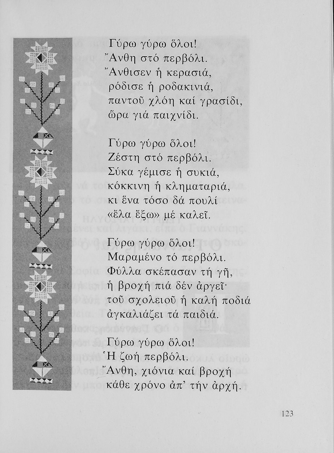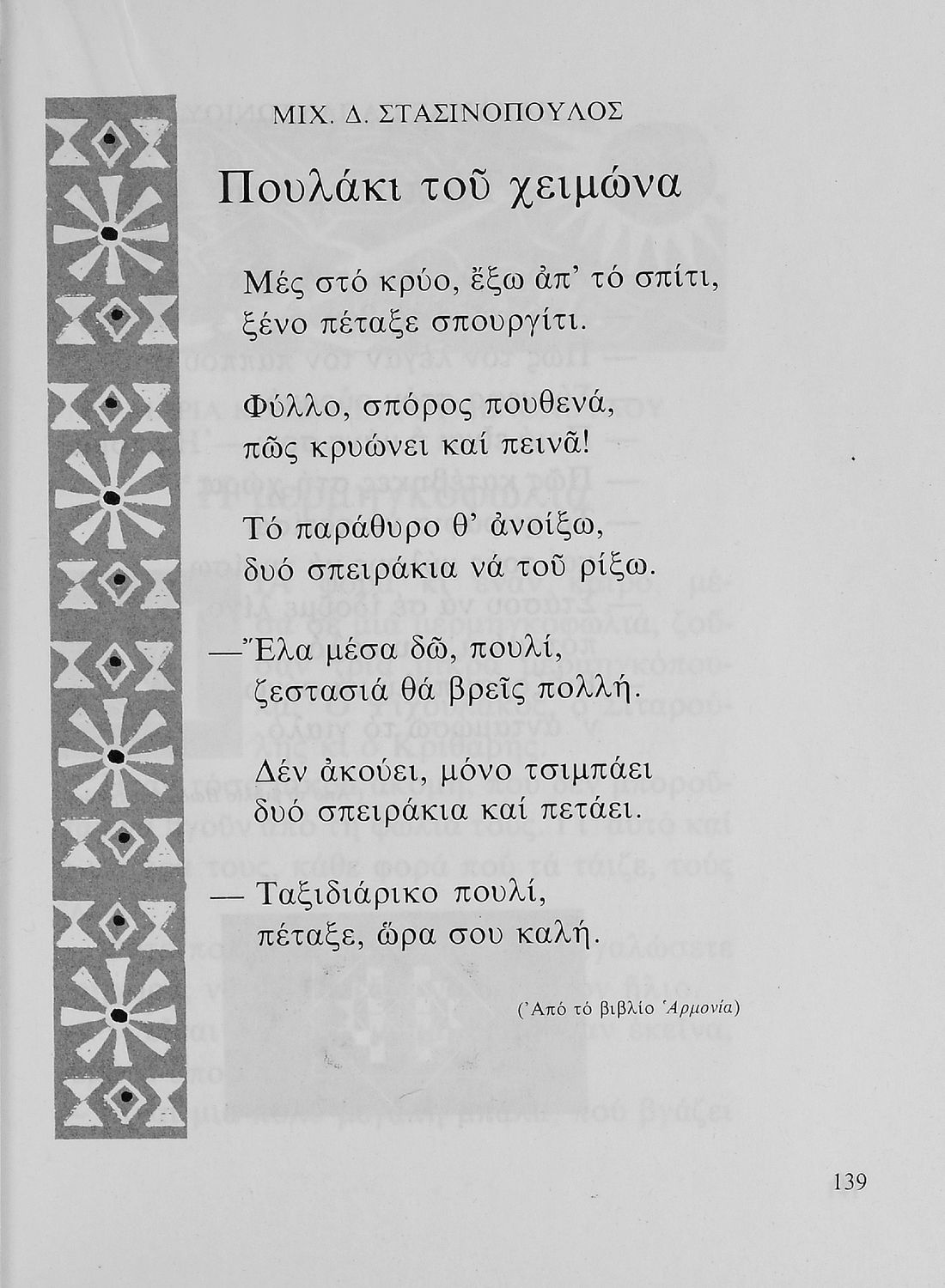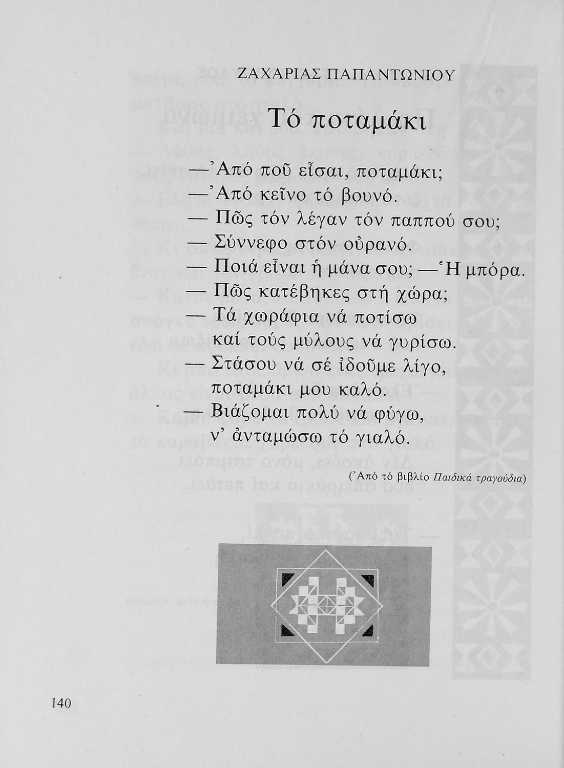 Αναγνωστικό που περιλαμβάνει πεζά και ποιήματα της νέας ελληνικής λογοτεχνίας για τους μαθητές του Δημοτικού. Το βιβλίο είναι αφιερωμένο στη μνήμη του Ζαχαρία Παπαντωνίου και αναδημοσιεύει αρκετά κείμενα από τα αναγνωστικά των εκπαιδευτικών μεταρρυθμίσεων του Ελευθερίου Βενιζέλου.