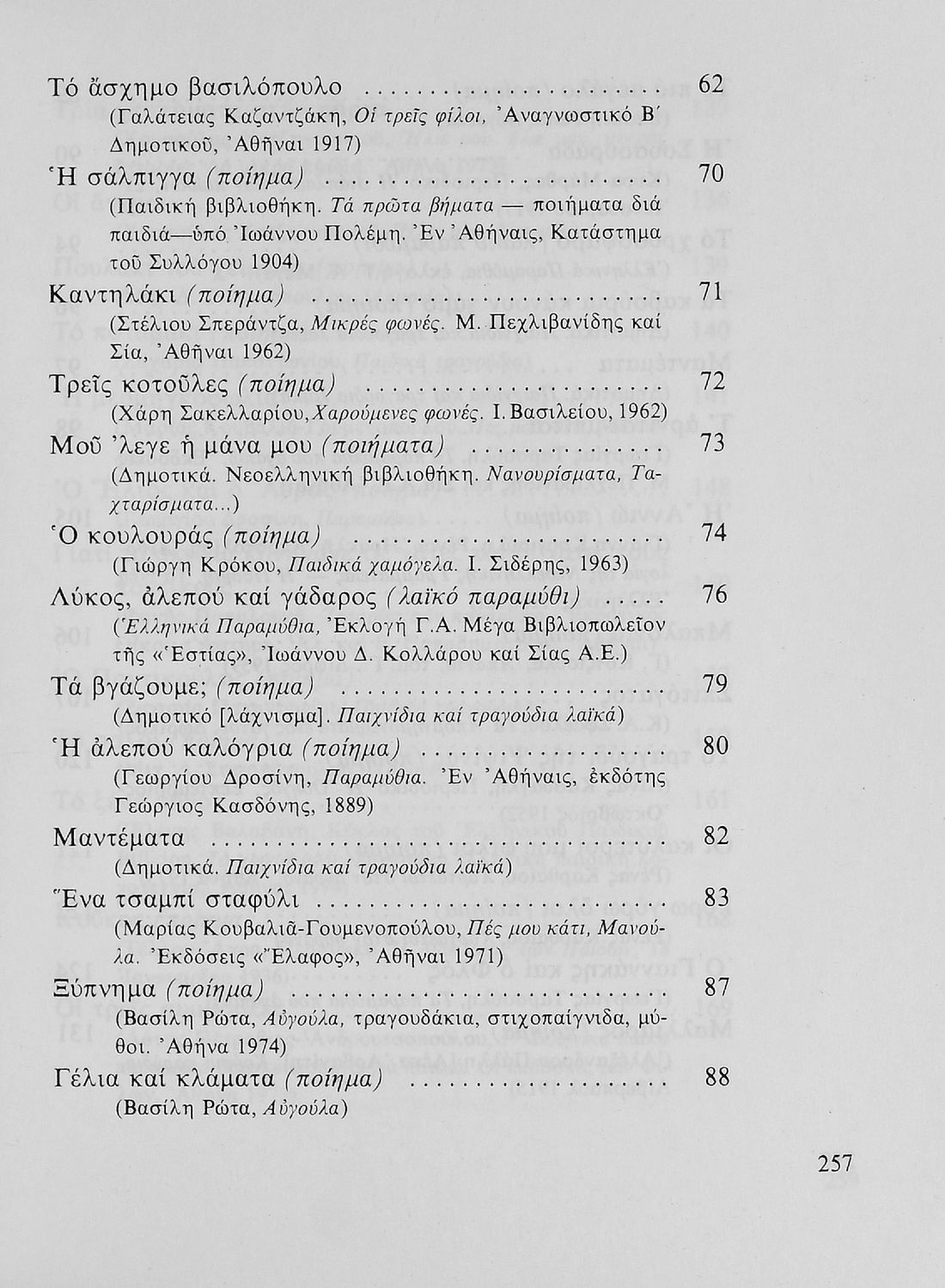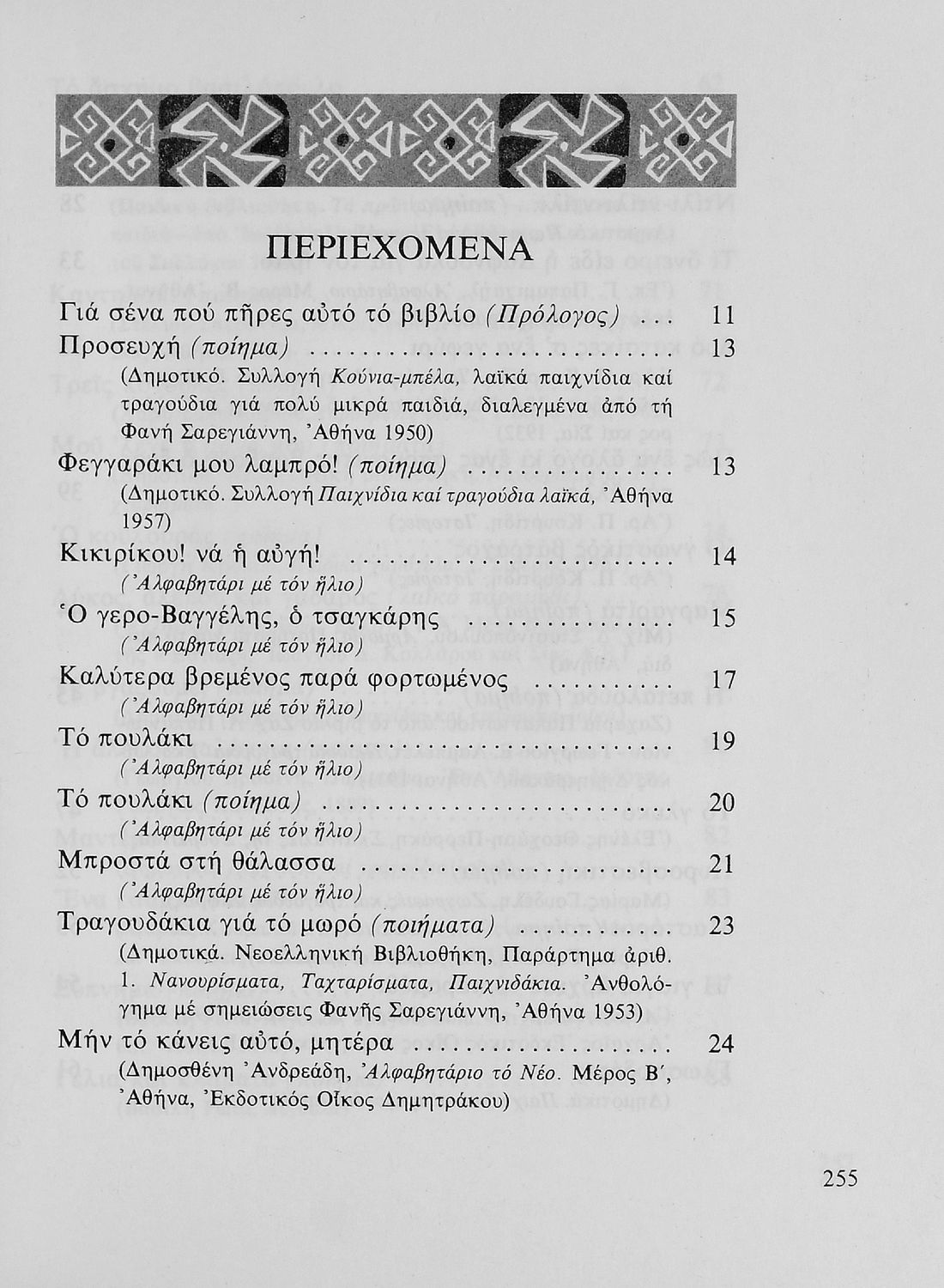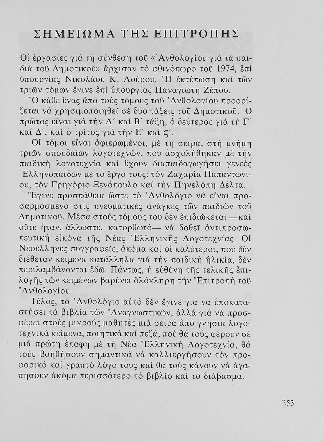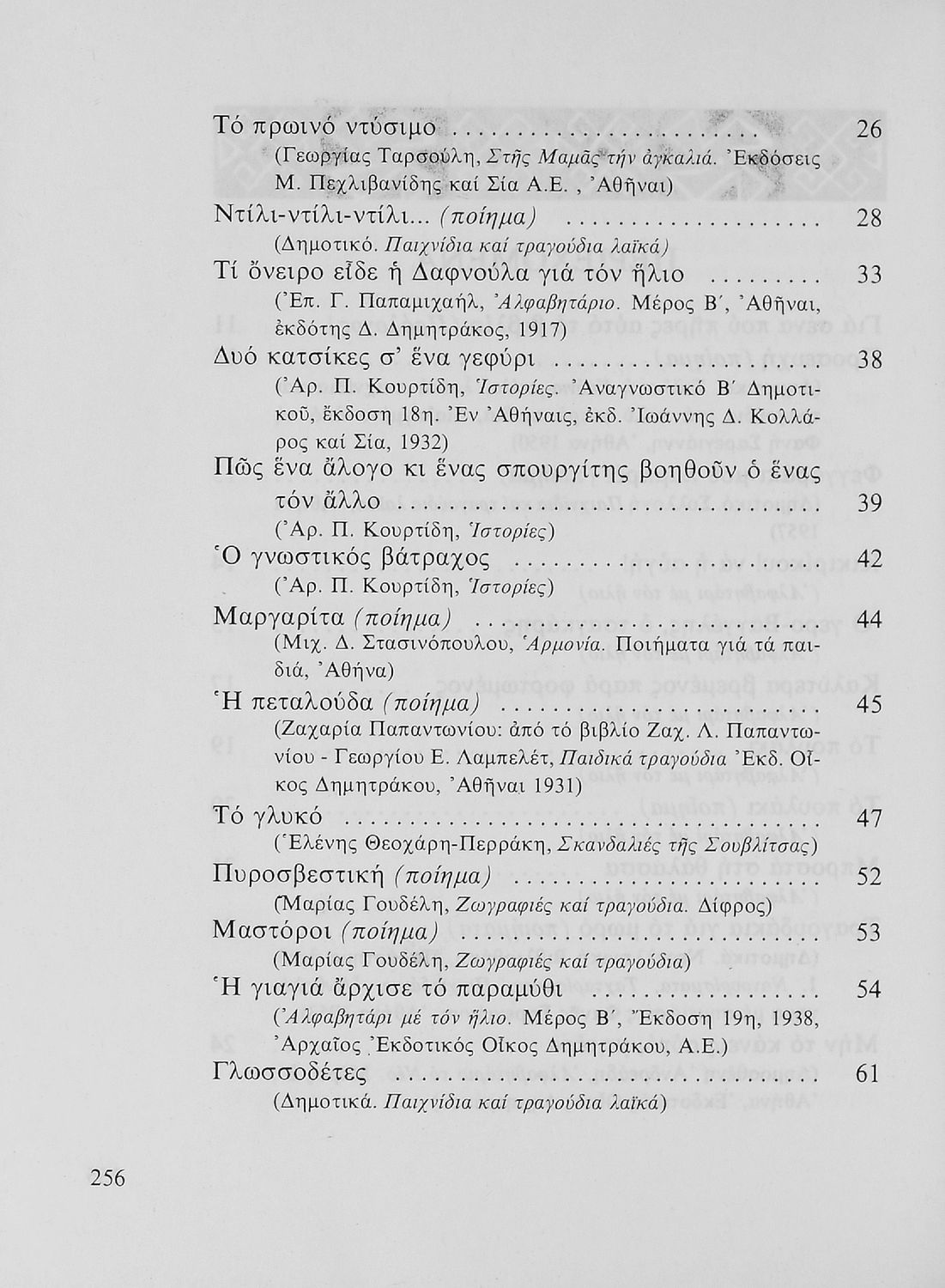 Αναγνωστικό που περιλαμβάνει πεζά και ποιήματα της νέας ελληνικής λογοτεχνίας για τους μαθητές του Δημοτικού. Το βιβλίο είναι αφιερωμένο στη μνήμη του Ζαχαρία Παπαντωνίου και αναδημοσιεύει αρκετά κείμενα από τα αναγνωστικά των εκπαιδευτικών μεταρρυθμίσεων του Ελευθερίου Βενιζέλου.