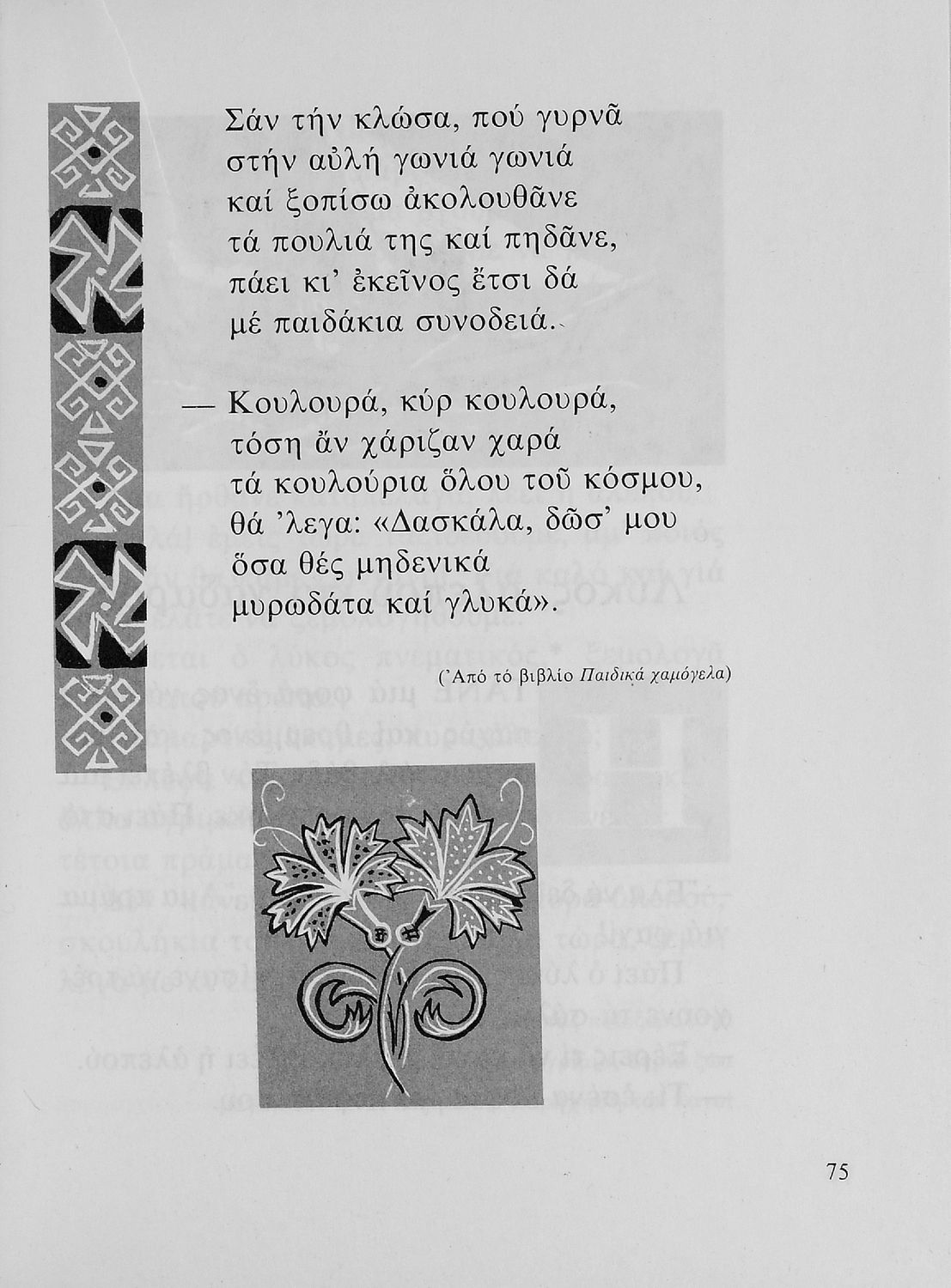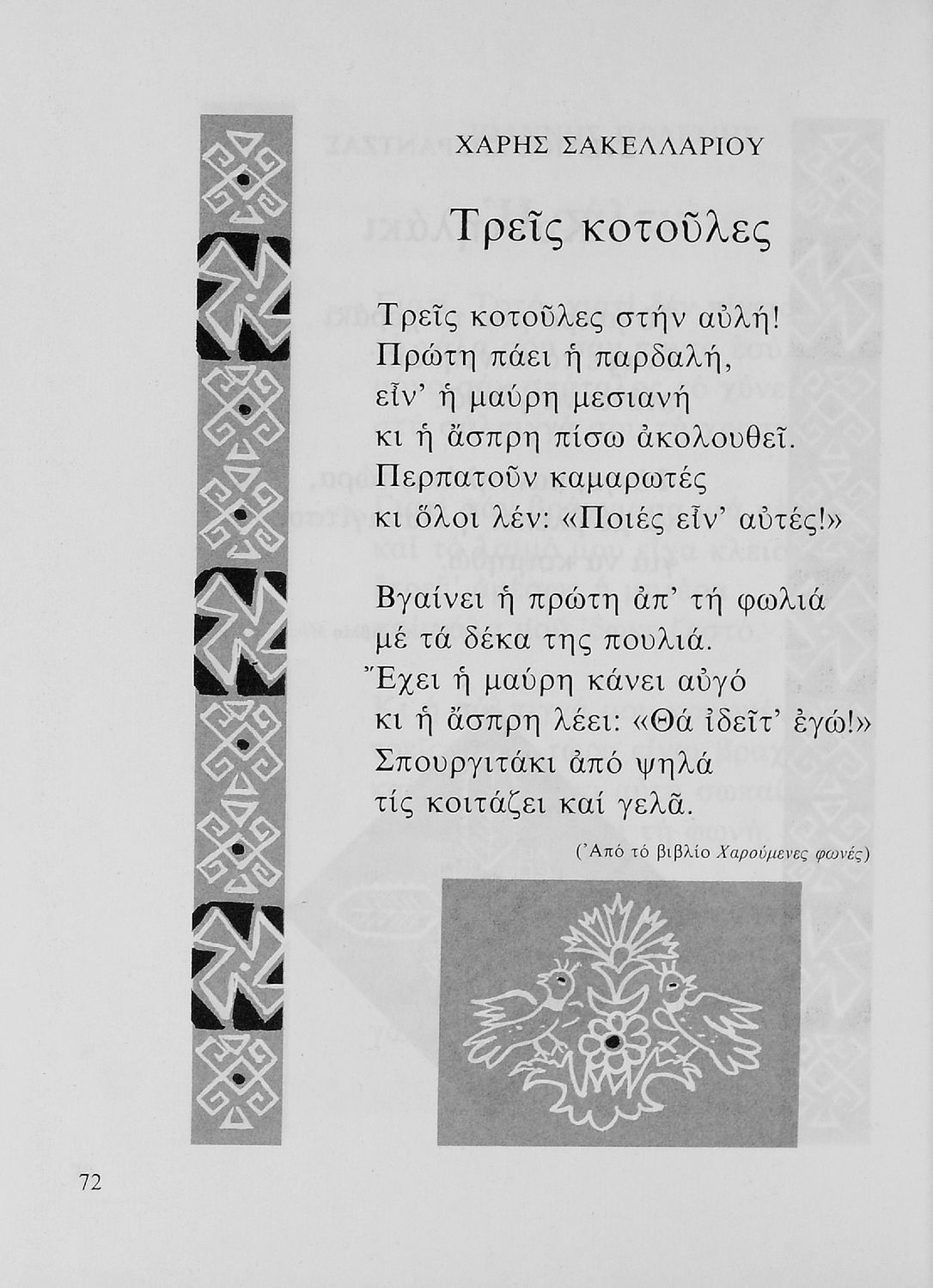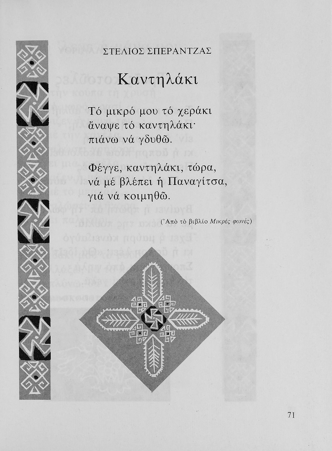 Αναγνωστικό που περιλαμβάνει πεζά και ποιήματα της νέας ελληνικής λογοτεχνίας για τους μαθητές του Δημοτικού. Το βιβλίο είναι αφιερωμένο στη μνήμη του Ζαχαρία Παπαντωνίου και αναδημοσιεύει αρκετά κείμενα από τα αναγνωστικά των εκπαιδευτικών μεταρρυθμίσεων του Ελευθερίου Βενιζέλου.