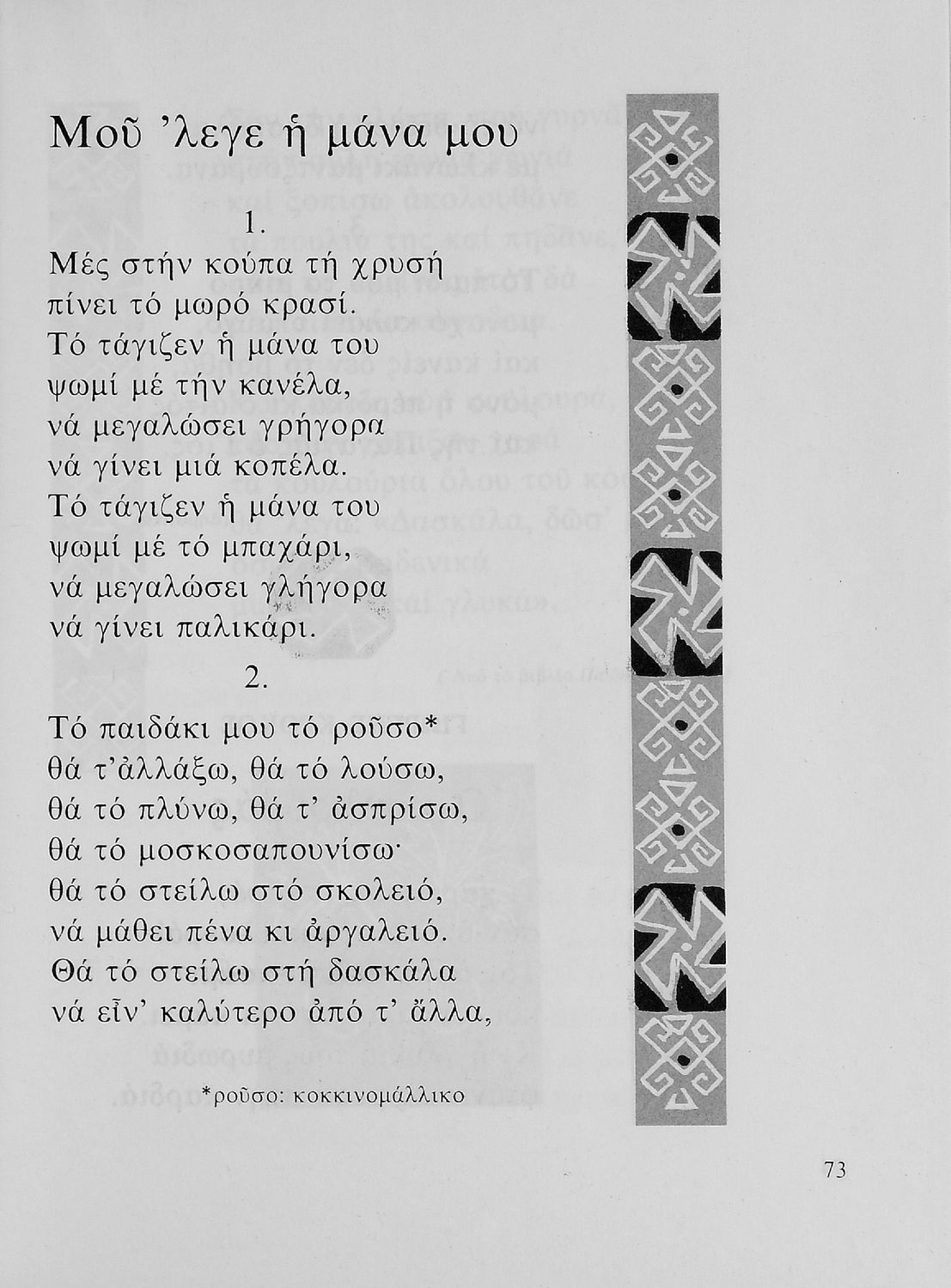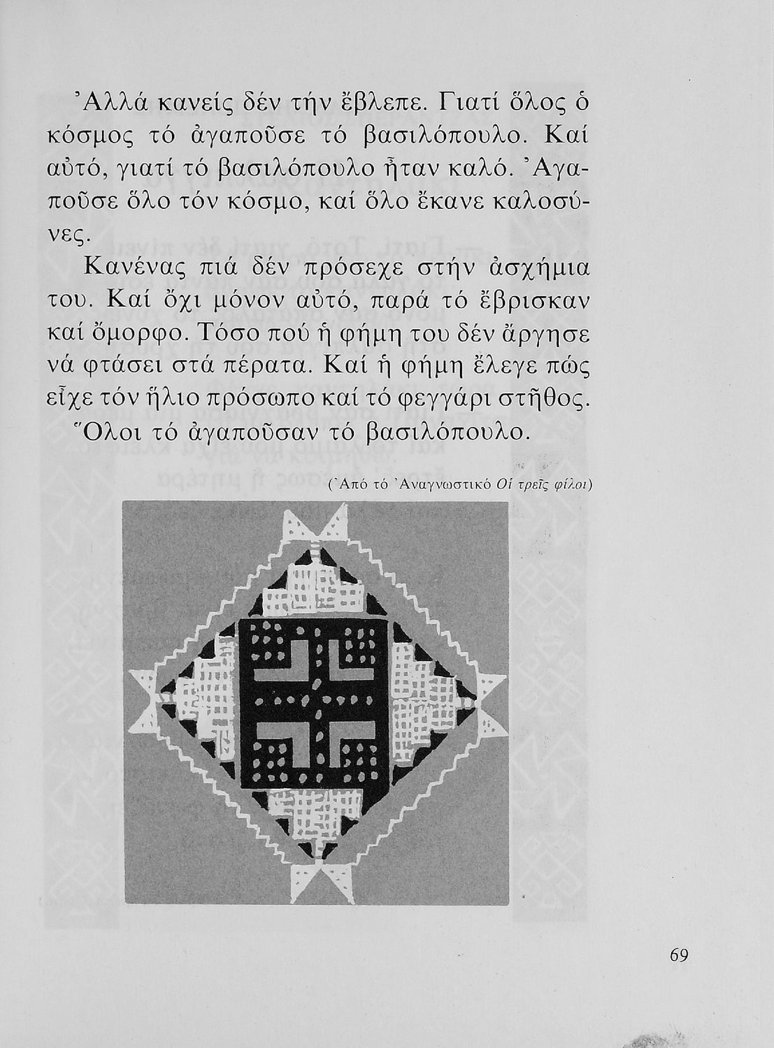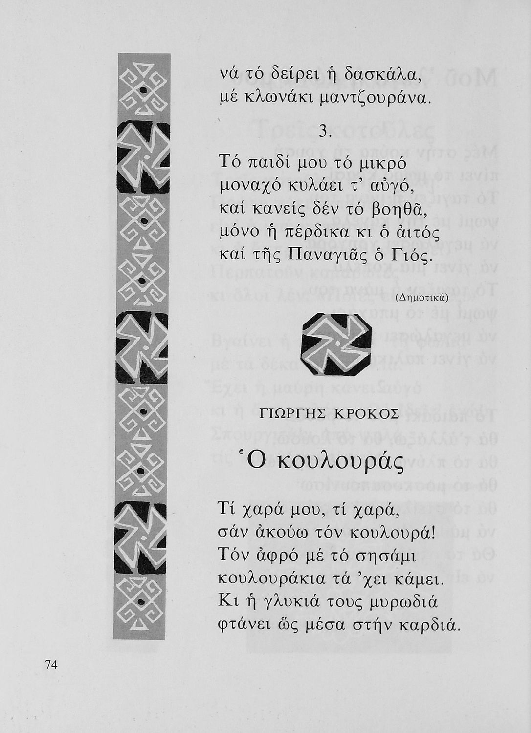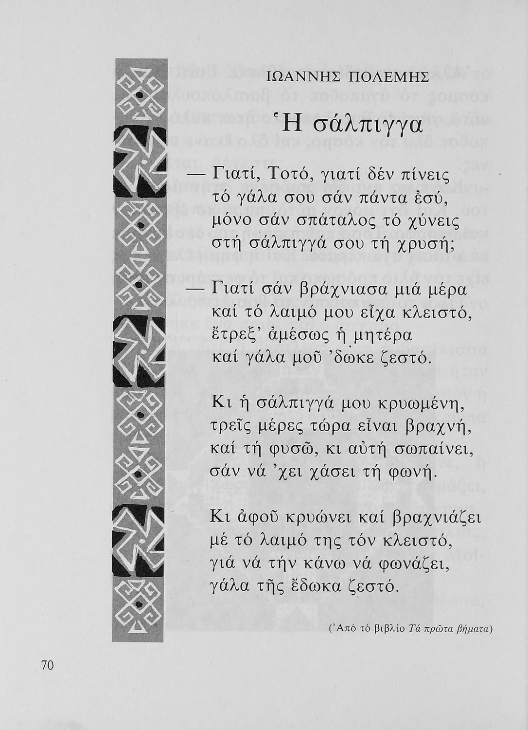 Αναγνωστικό που περιλαμβάνει πεζά και ποιήματα της νέας ελληνικής λογοτεχνίας για τους μαθητές του Δημοτικού. Το βιβλίο είναι αφιερωμένο στη μνήμη του Ζαχαρία Παπαντωνίου και αναδημοσιεύει αρκετά κείμενα από τα αναγνωστικά των εκπαιδευτικών μεταρρυθμίσεων του Ελευθερίου Βενιζέλου.