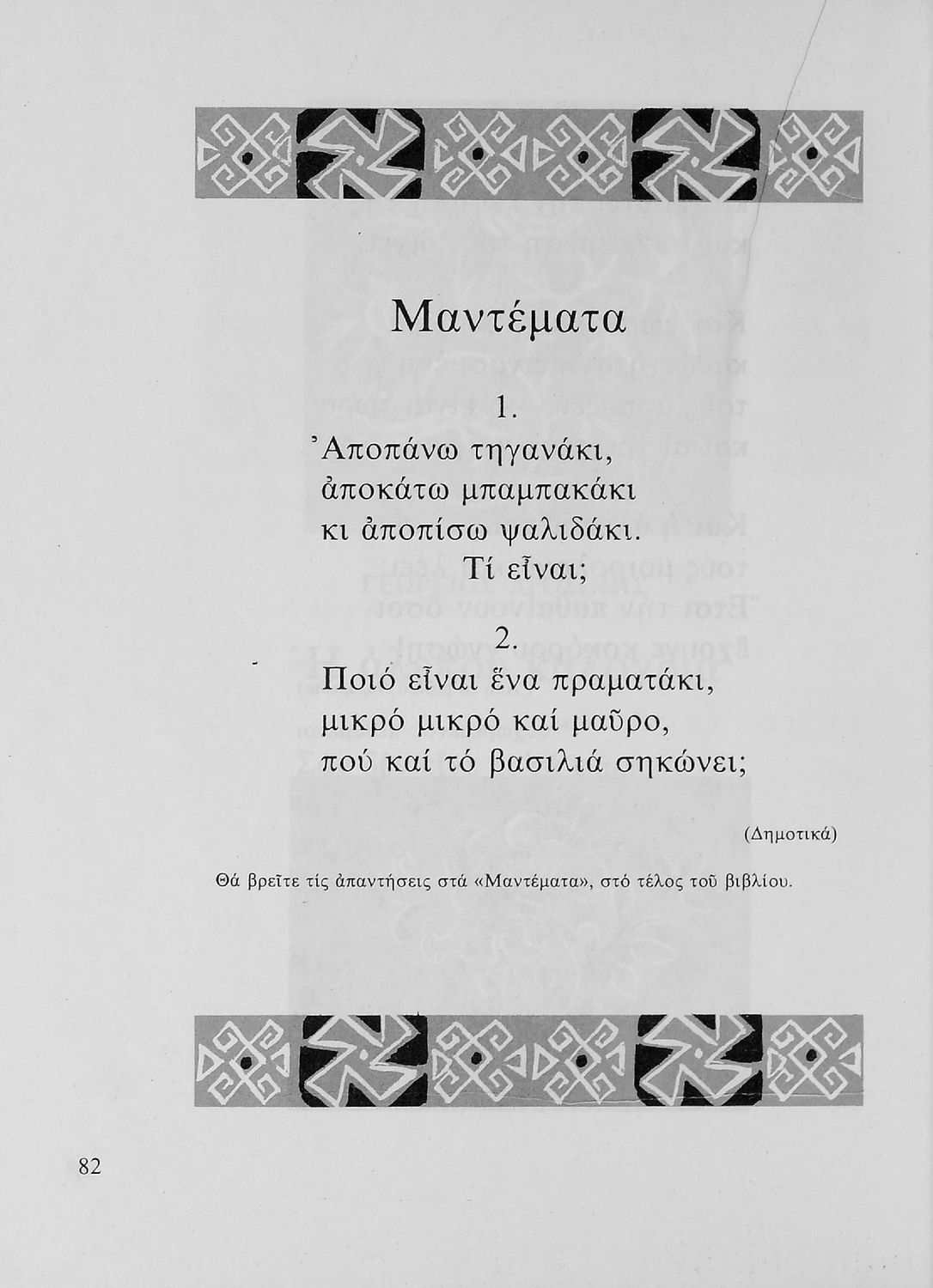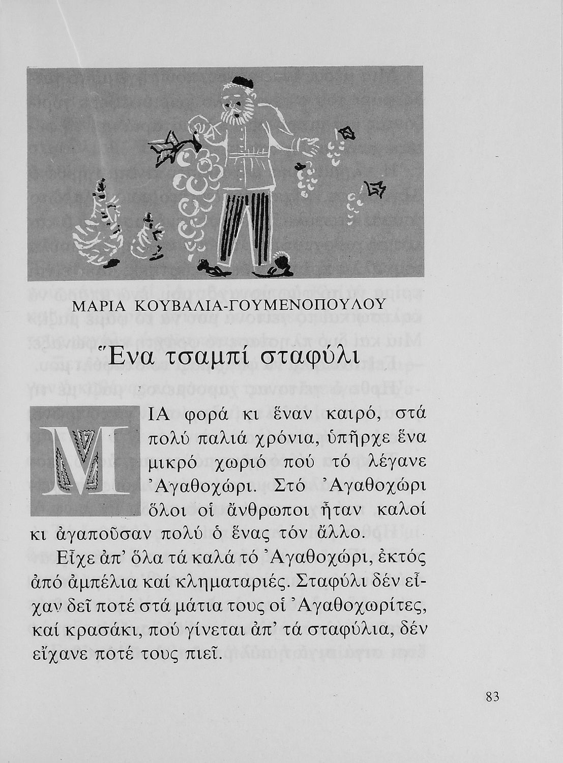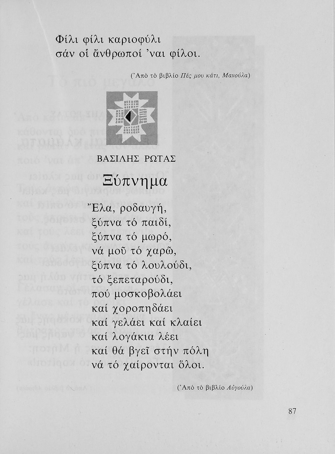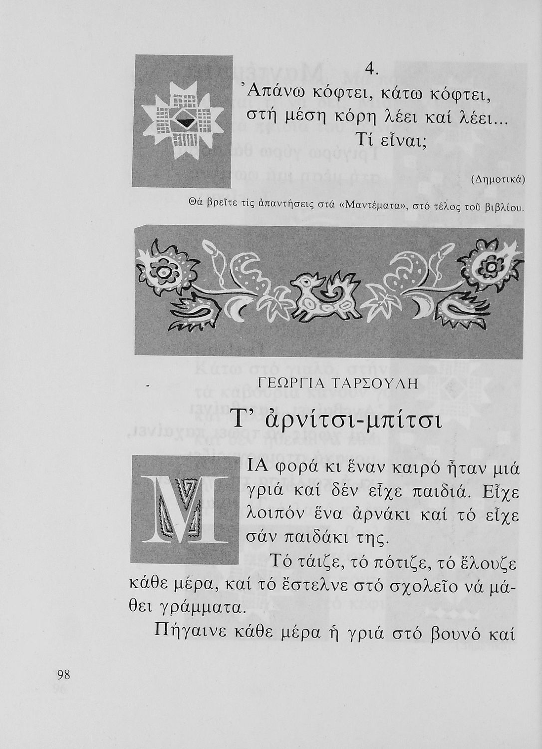Αναγνωστικό που περιλαμβάνει πεζά και ποιήματα της νέας ελληνικής λογοτεχνίας για τους μαθητές του Δημοτικού. Το βιβλίο είναι αφιερωμένο στη μνήμη του Ζαχαρία Παπαντωνίου και αναδημοσιεύει αρκετά κείμενα από τα αναγνωστικά των εκπαιδευτικών μεταρρυθμίσεων του Ελευθερίου Βενιζέλου.